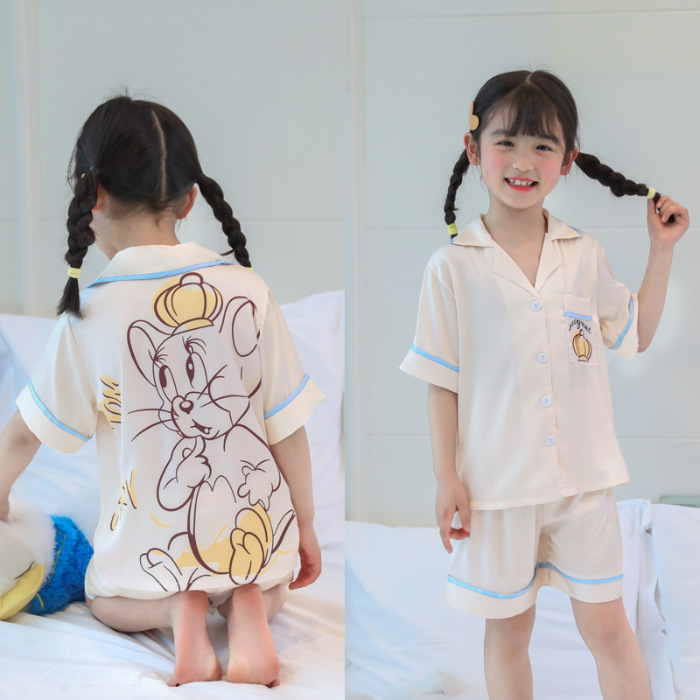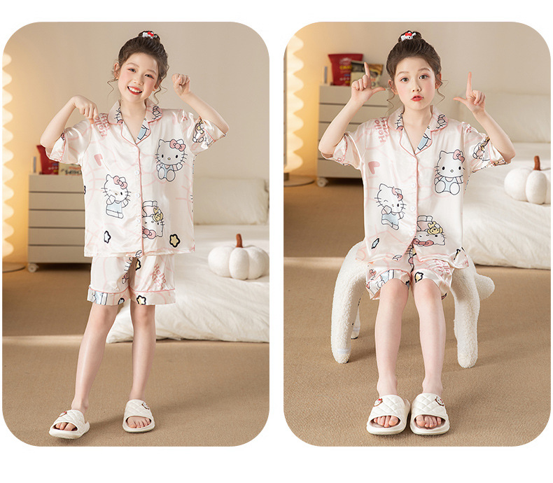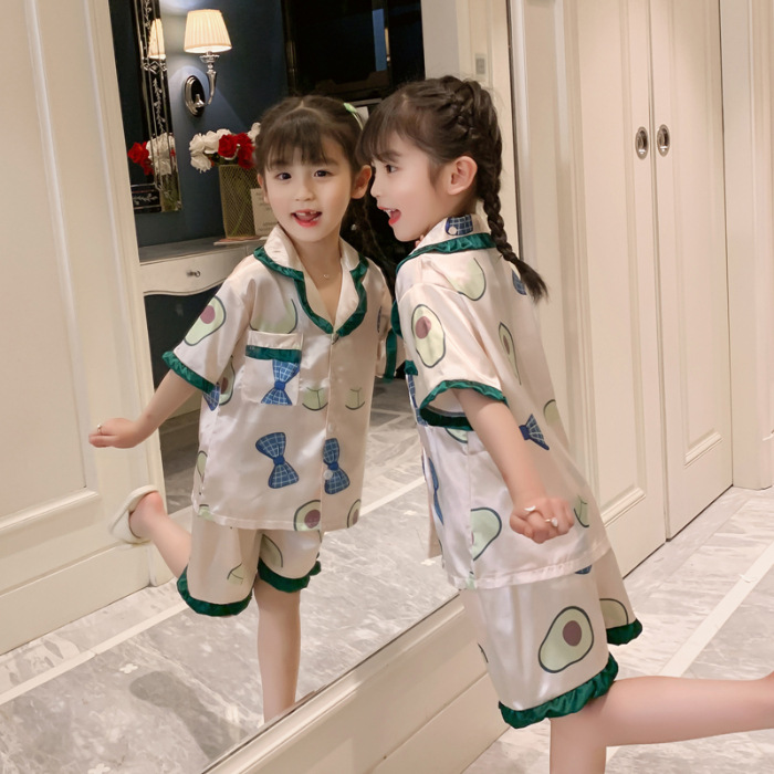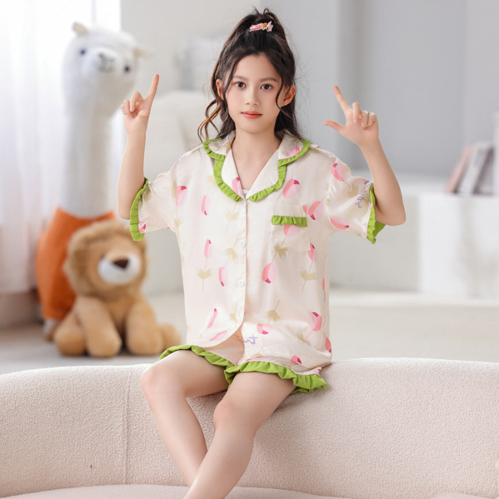 여자 잠옷 여름 얼음 실크 반팔 2025 새로운 여름 정장 어린이 어린 소녀 유행 큰 어린이 가정 의류스토어 가기