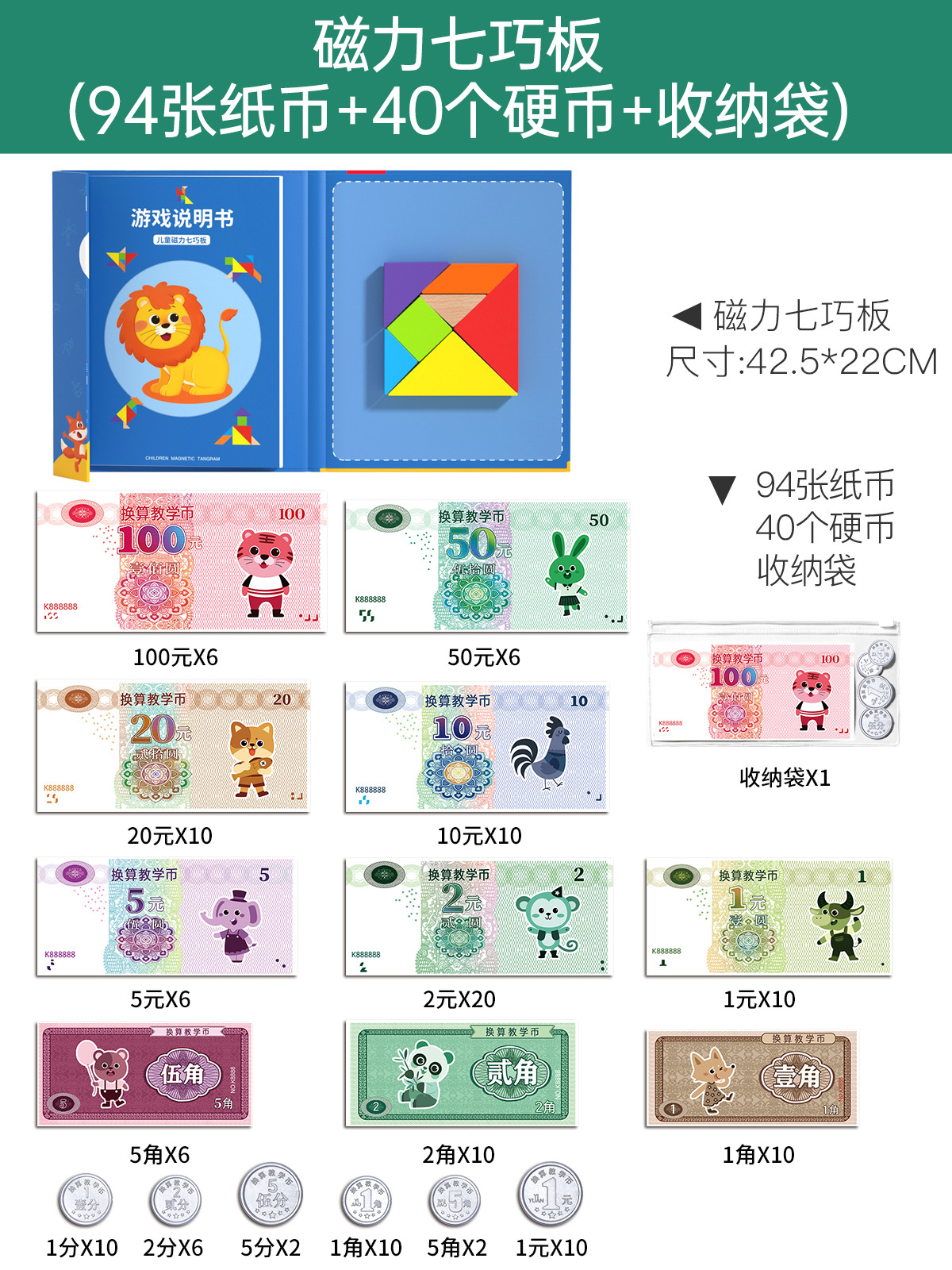 • !磁力七巧板+(94张纸币+40个硬币+收纳袋)[]