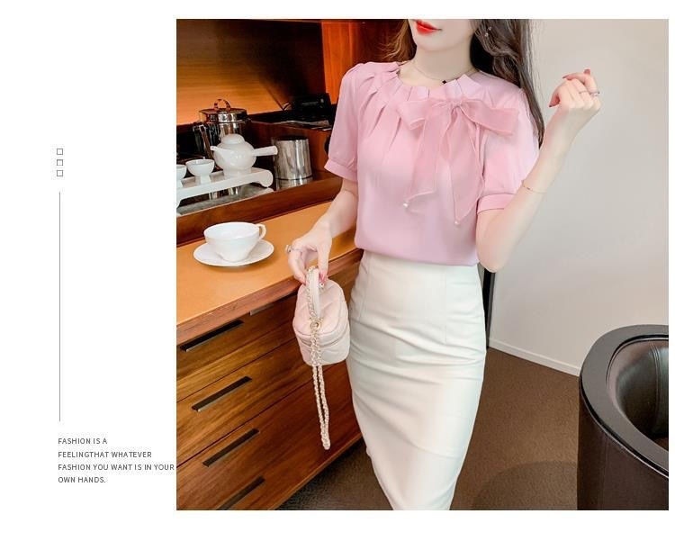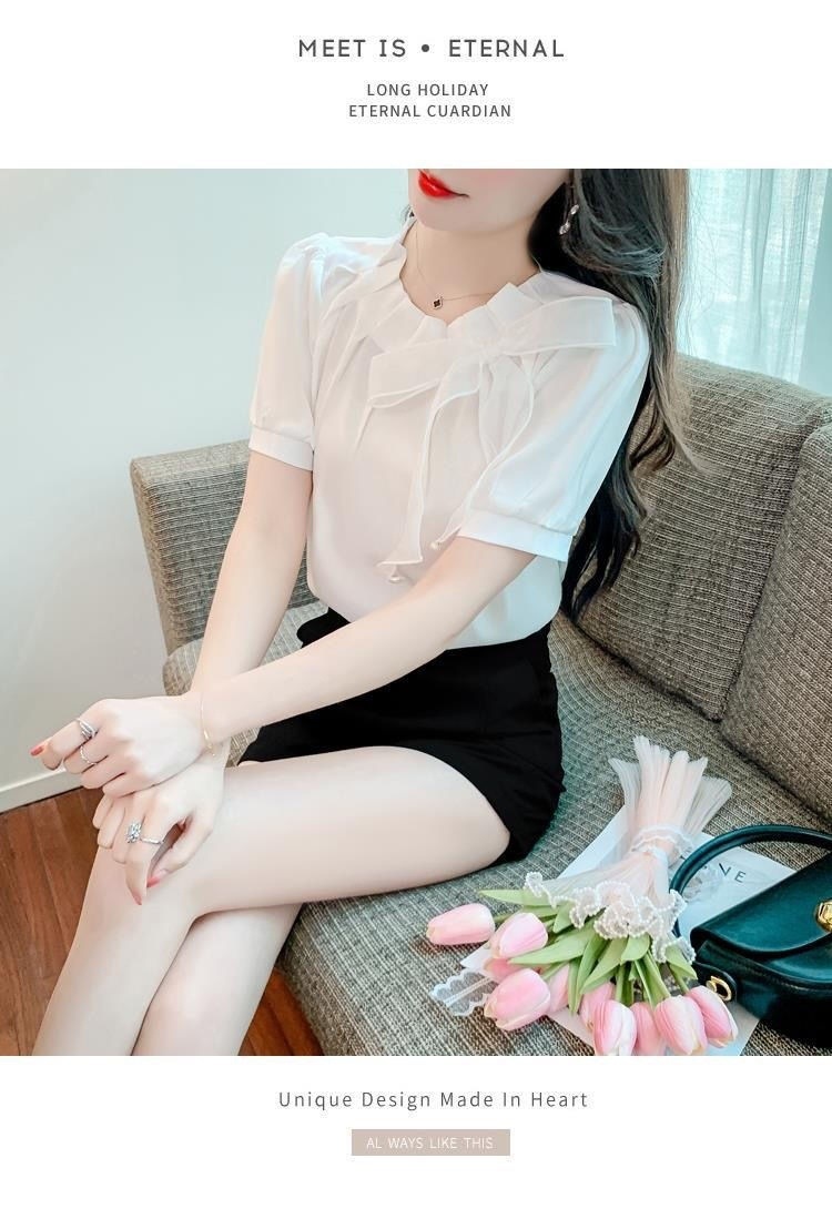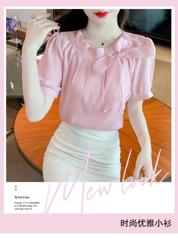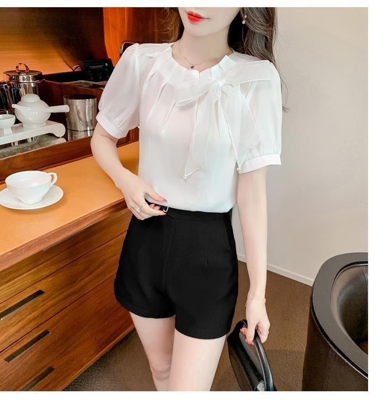 여름 새로운 한국 스타일 라운드 넥 주름 보우 반팔 쉬폰 셔츠 여성의 시크하고 아름답고 달콤한 셔츠