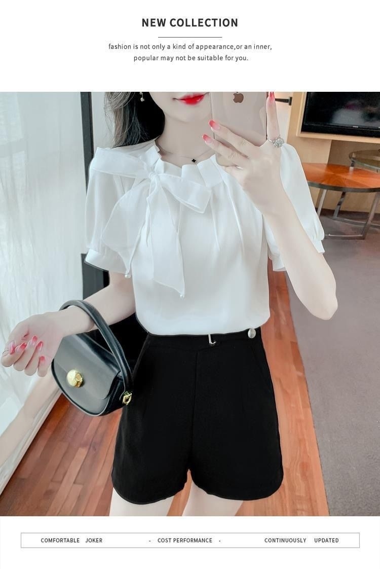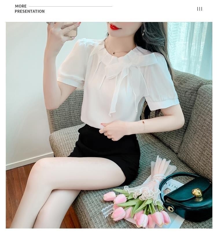 여름 새로운 한국 스타일 라운드 넥 주름 보우 반팔 쉬폰 셔츠 여성의 시크하고 아름답고 달콤한 셔츠스토어 가기