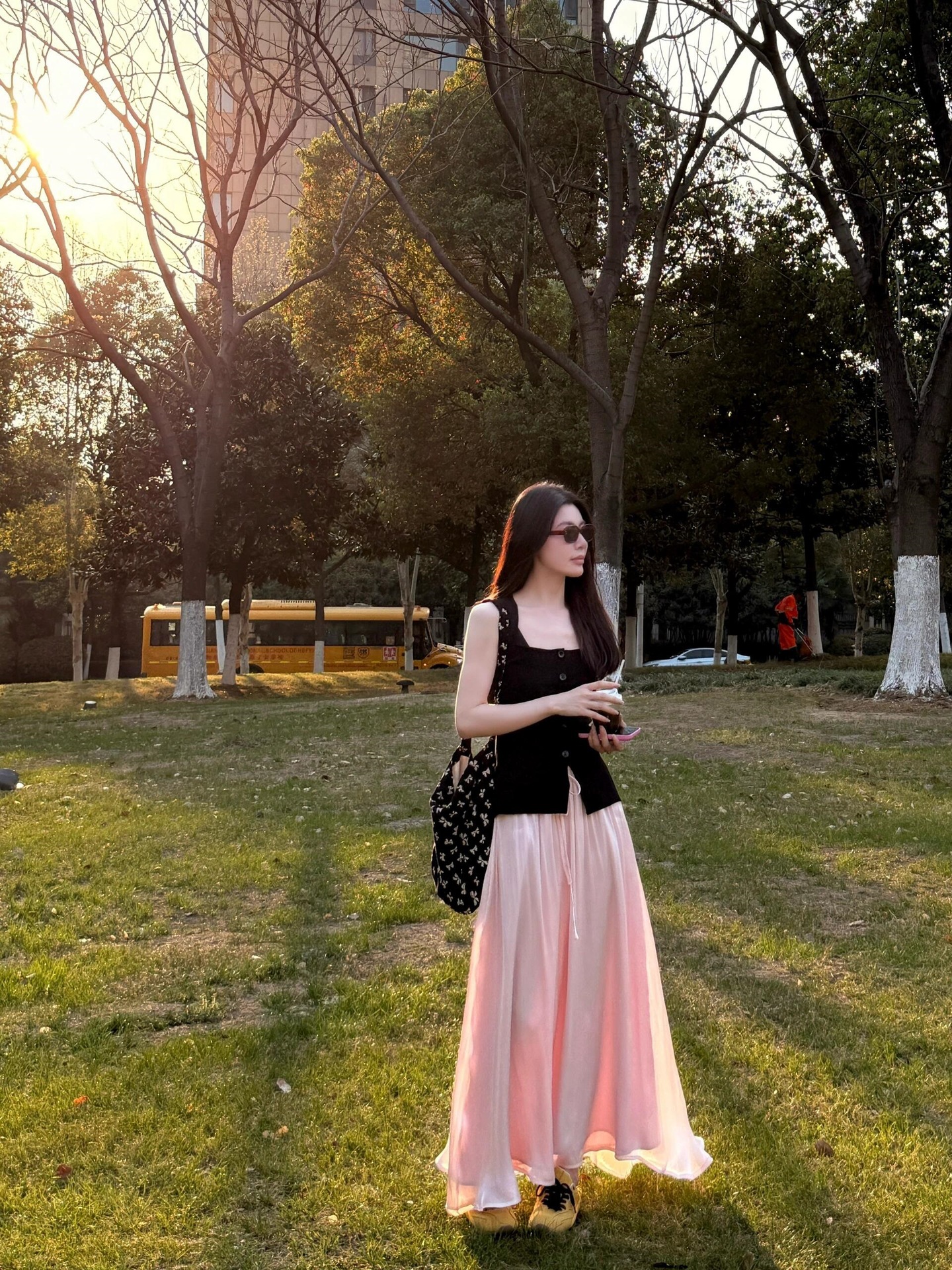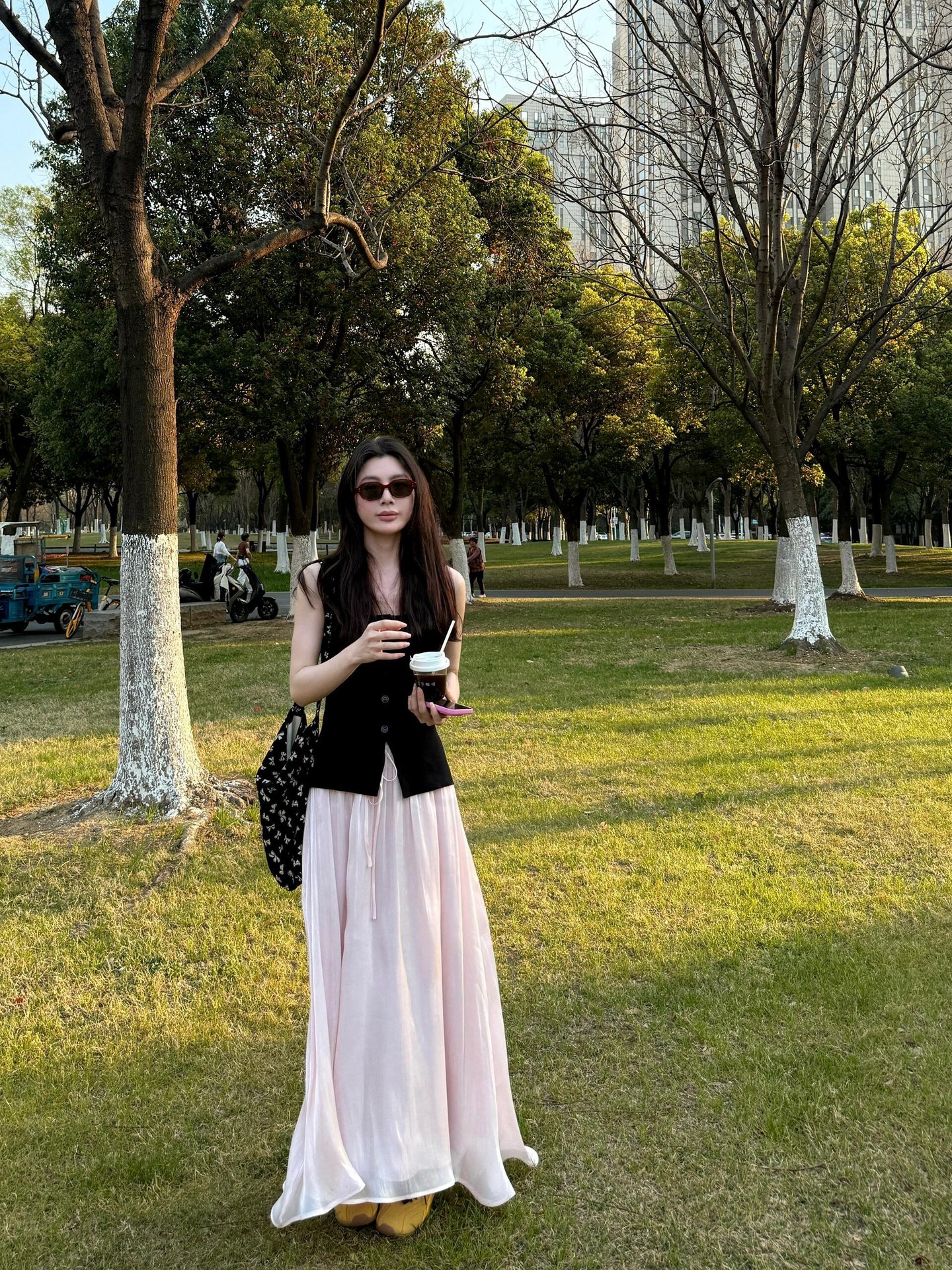 반짝이는 핑크 스커트 여름 신작 신축성 있는 하이 웨이스트 달콤하고 부드러운 슈퍼 요정 우아한 A 라인 롱 스커트 인스토어 가기
