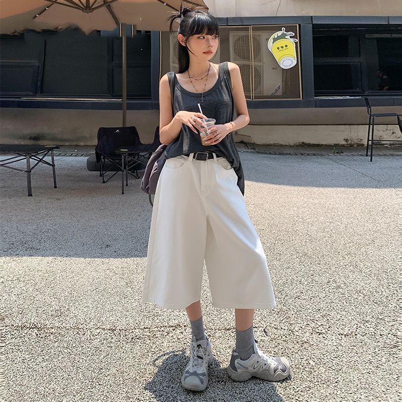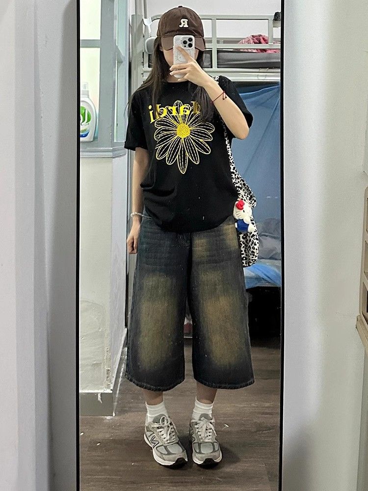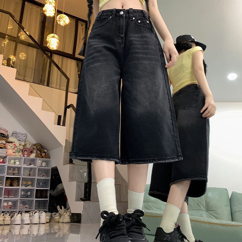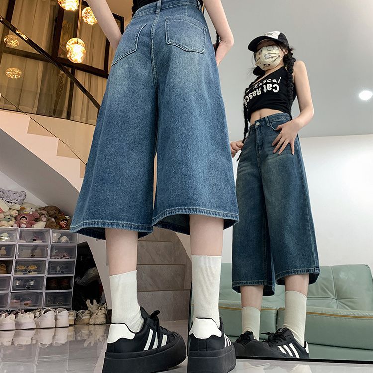 여성용 아메리칸 레트로 디스트레스드 7부 청바지 플러스 사이즈 뚱뚱한 mm 여름 하이 웨이스트 루즈 슬리밍 다용도 와이드 레그 팬츠스토어 가기