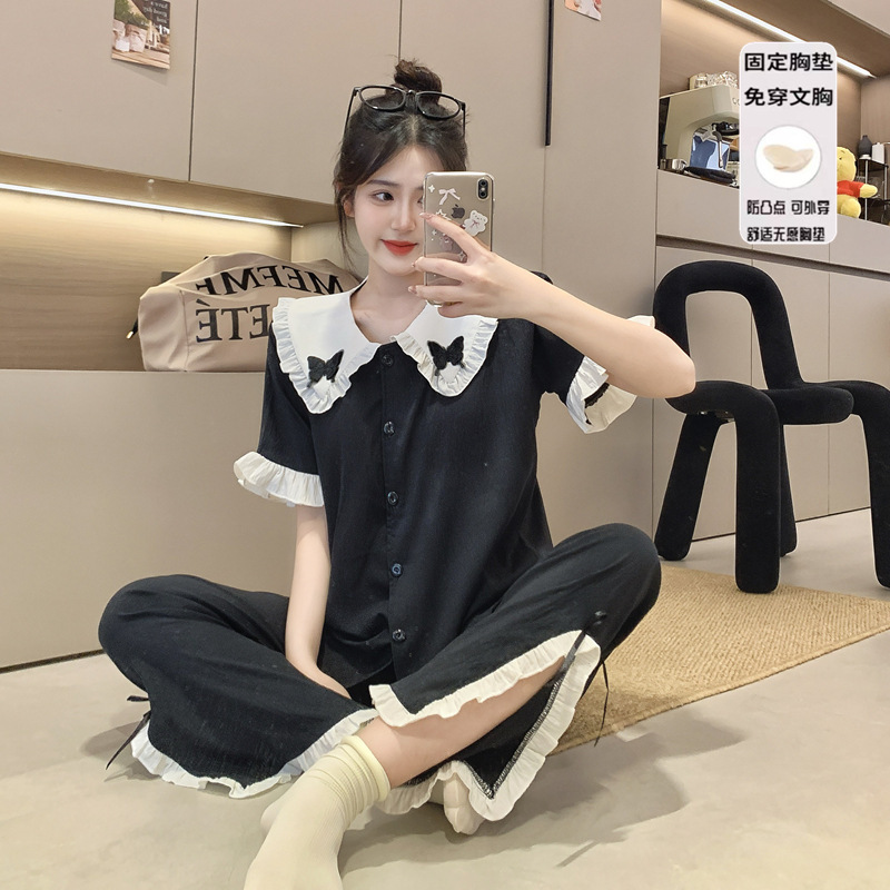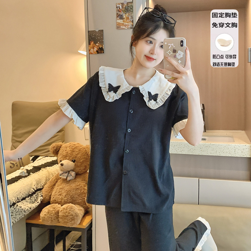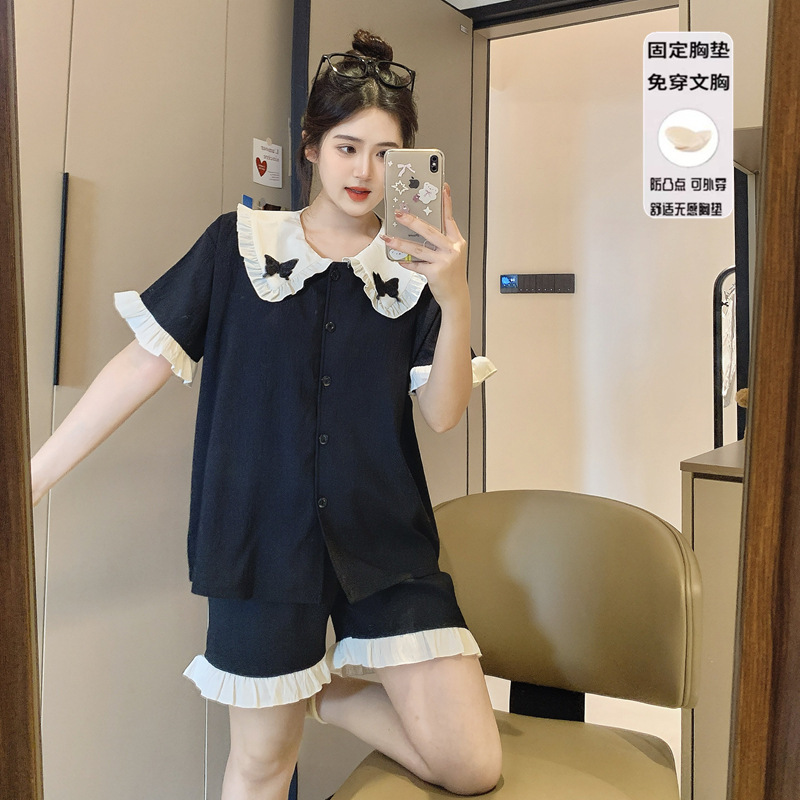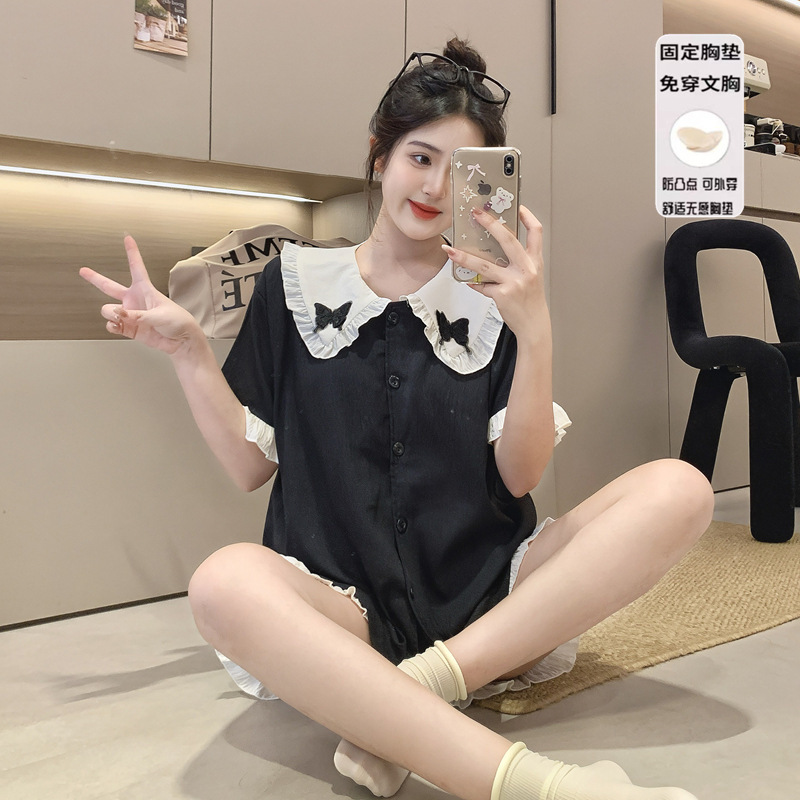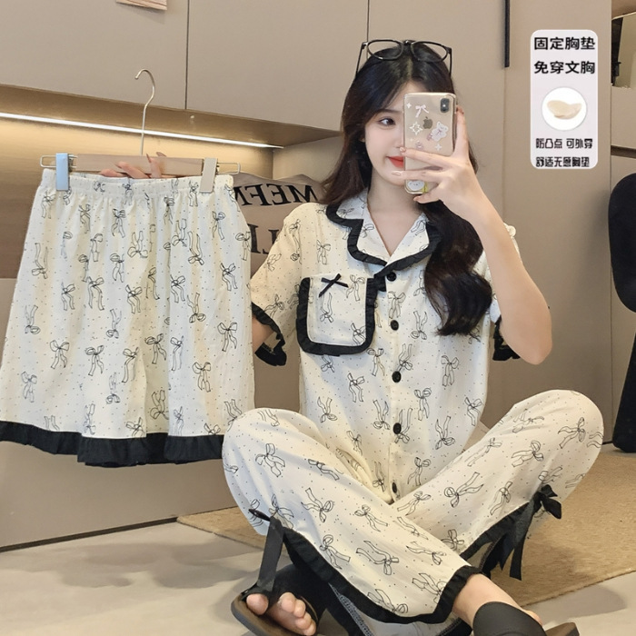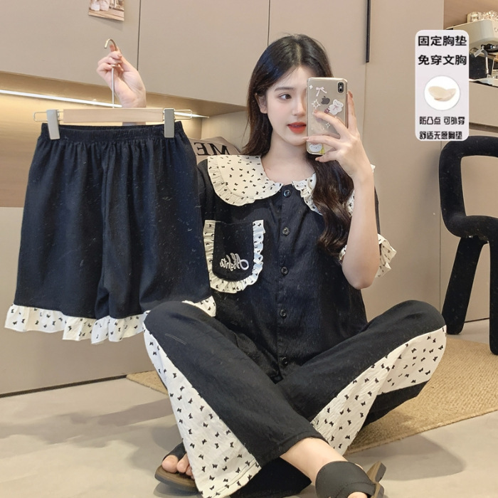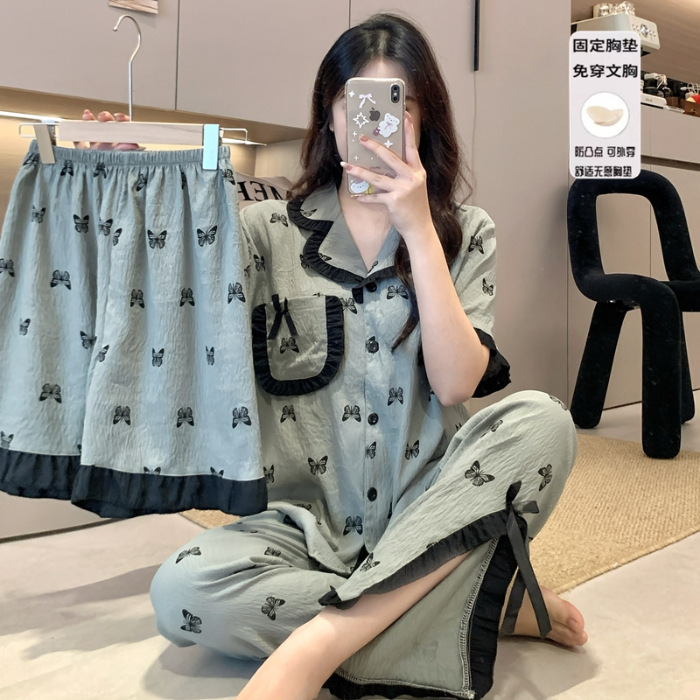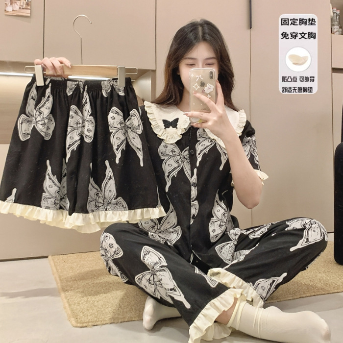 여성용 가슴 패드 도매 여름 목욕 벨트 클라우드 잠옷 여성용 라이브 방송 면화 가정복 긴팔 3 피스 세트 새로운 카디건