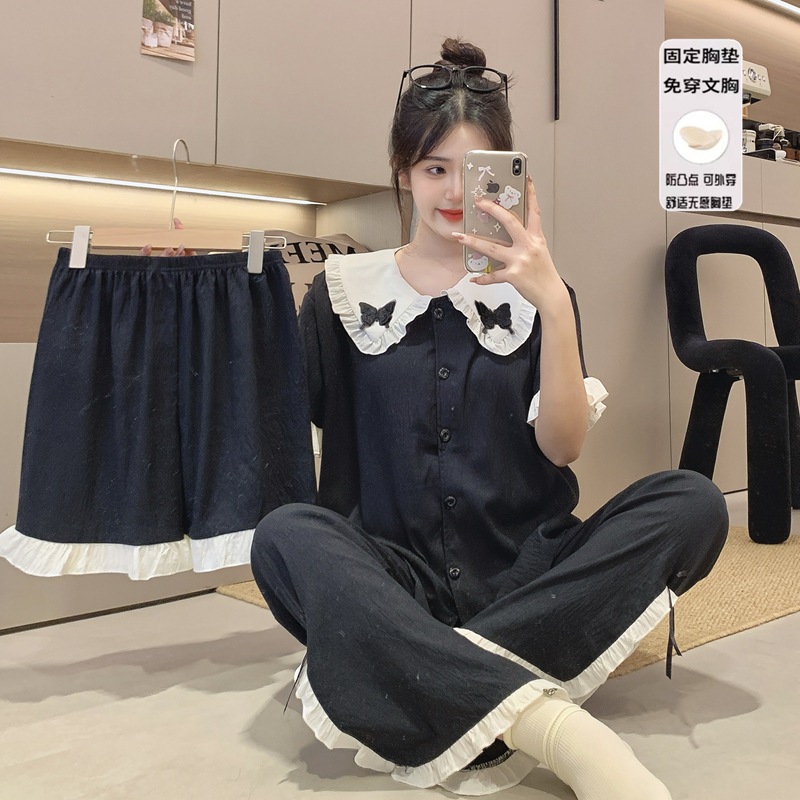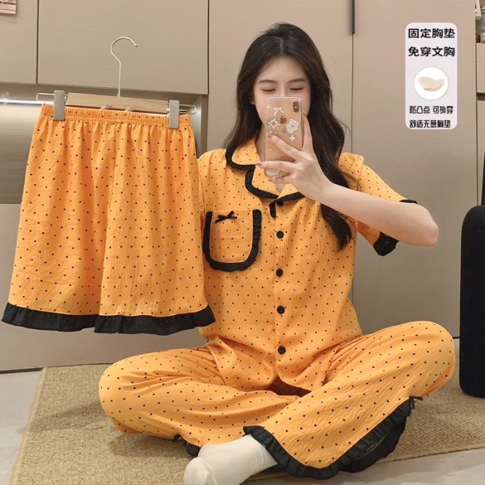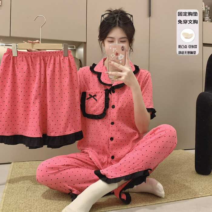 여성용 가슴 패드 도매 여름 목욕 벨트 클라우드 잠옷 여성용 라이브 방송 면화 가정복 긴팔 3 피스 세트 새로운 카디건스토어 가기