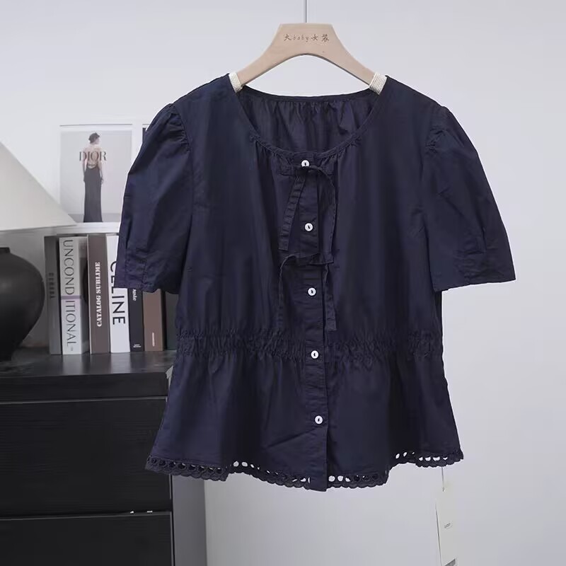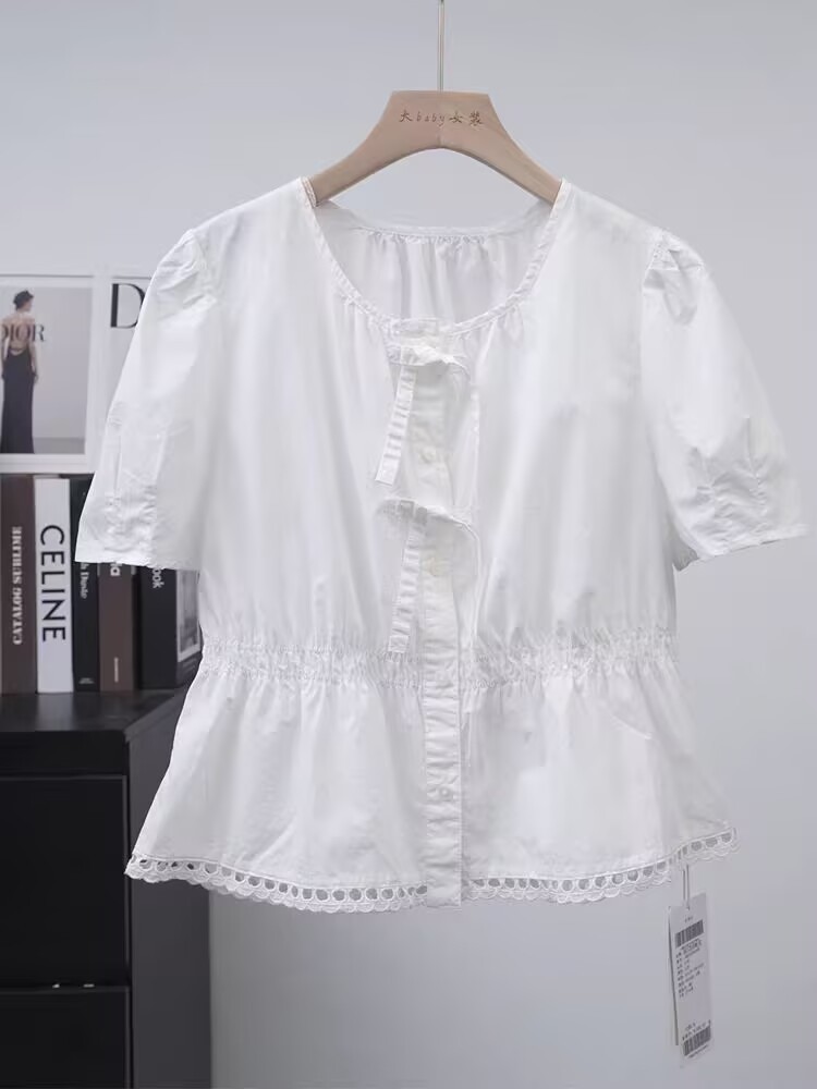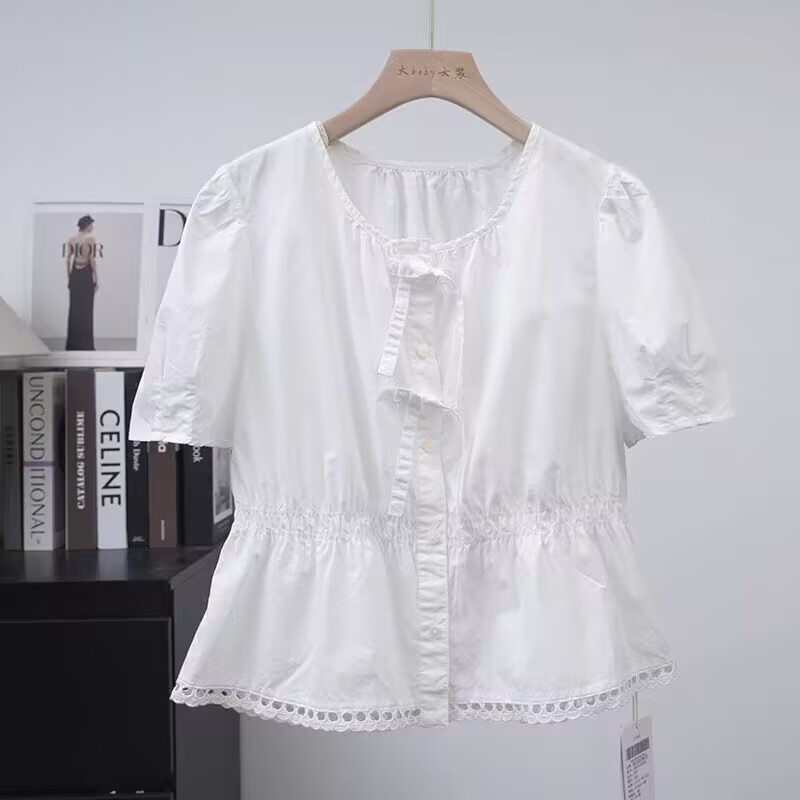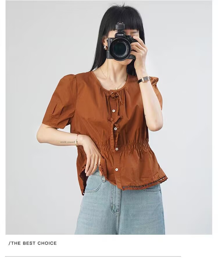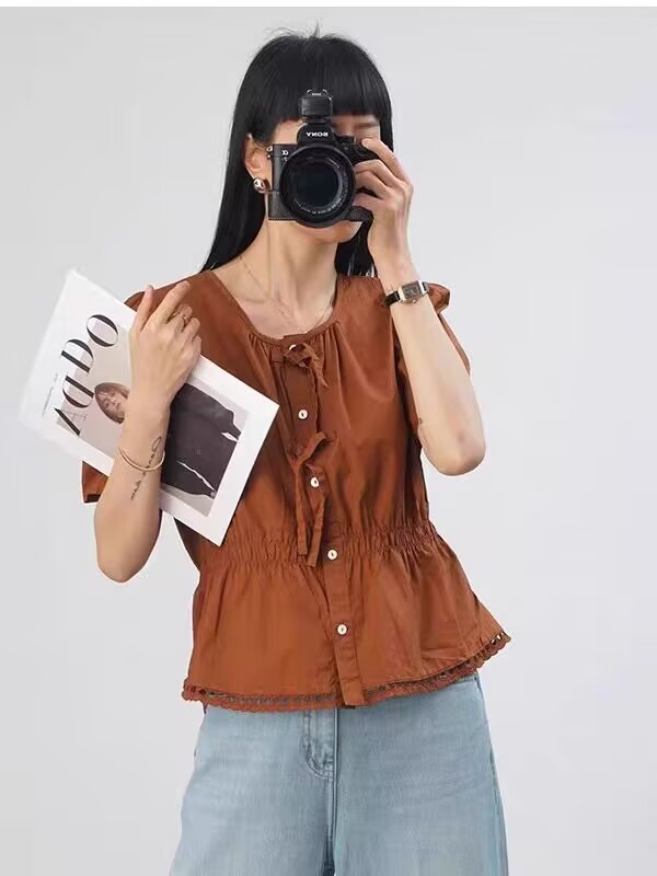 정품 한국 스타일 타이트 허리 레이스 업 싱글 브레스트 셔츠 여성 여름 새로운 한국 스타일 슬리밍 스위트 셔츠 25 인형 셔츠 트렌디