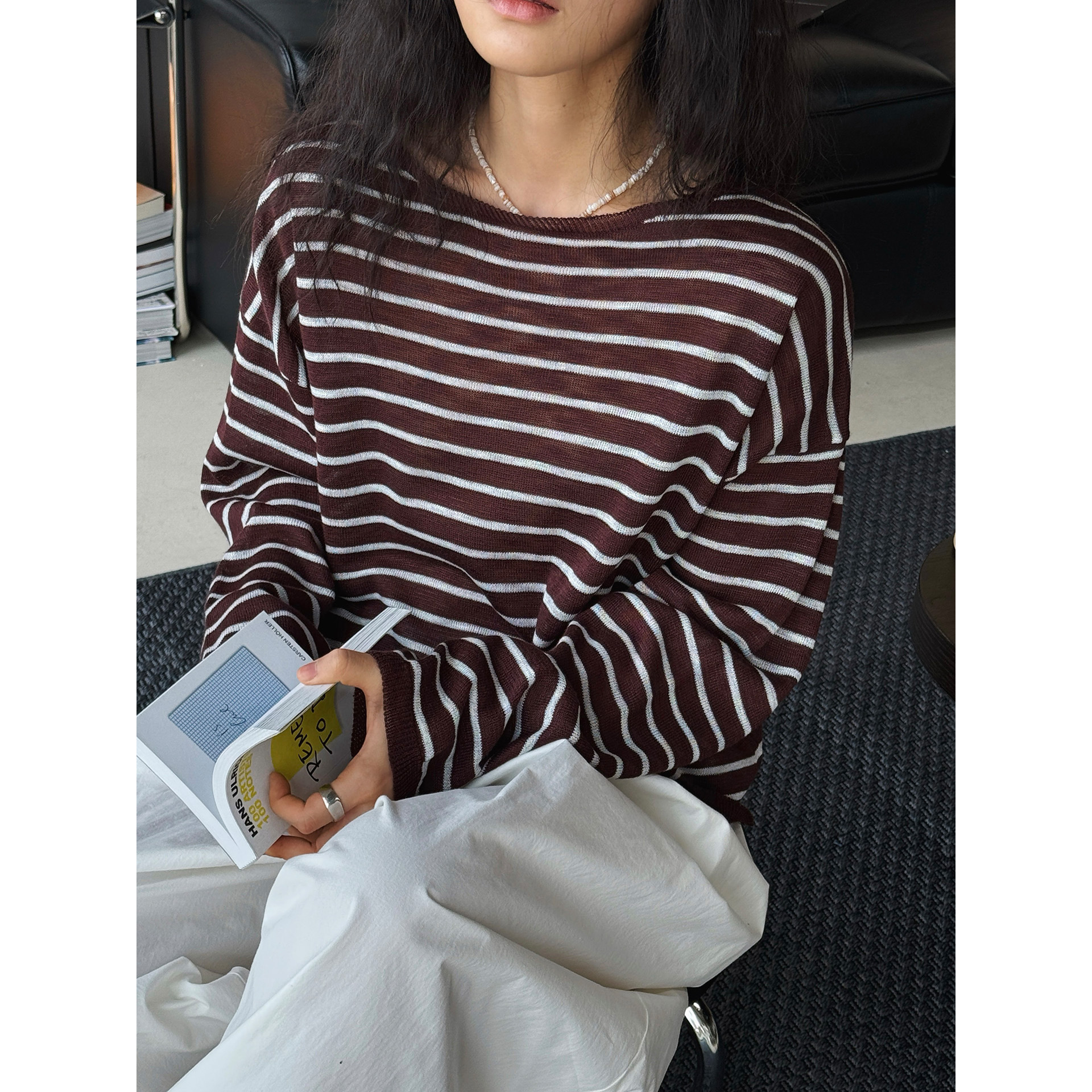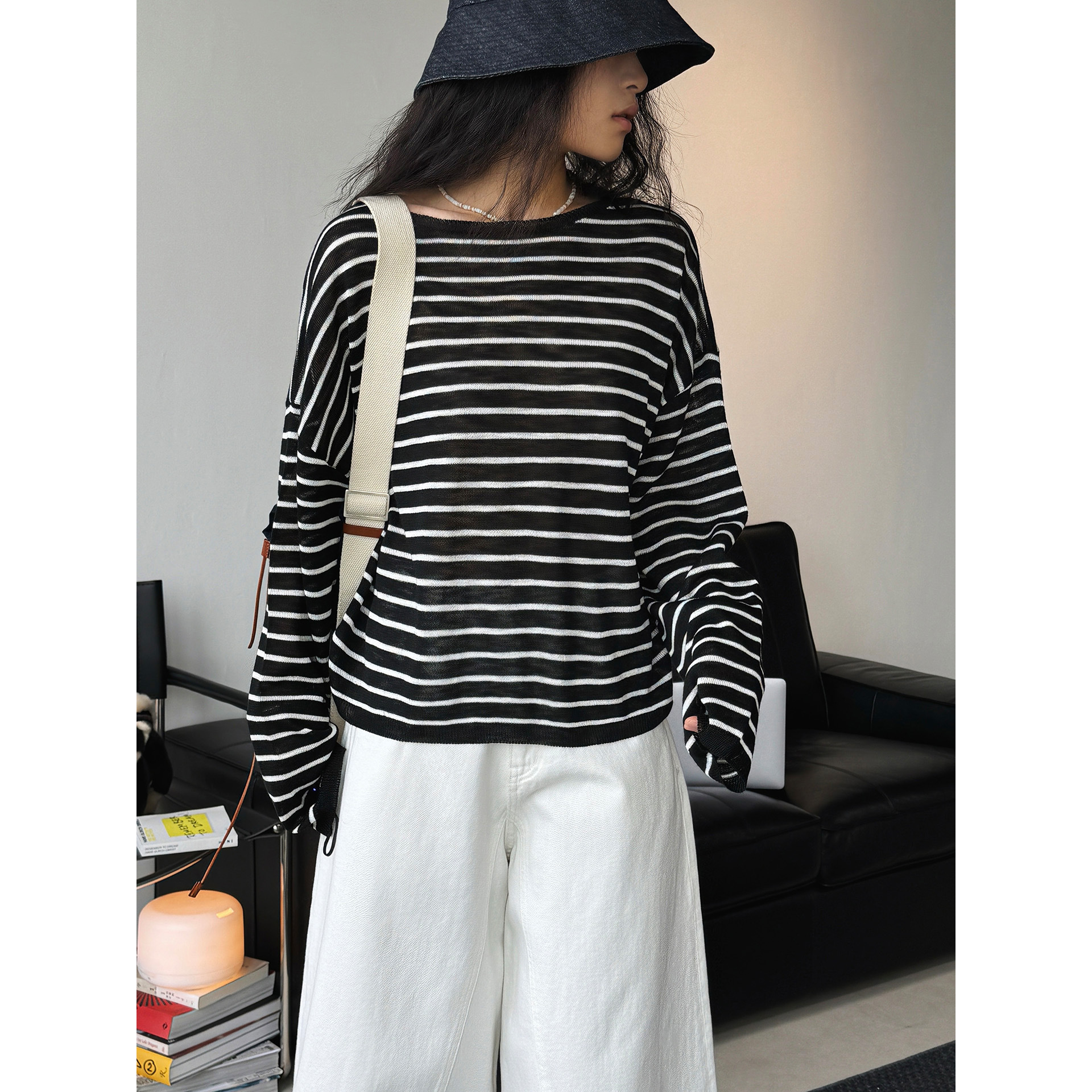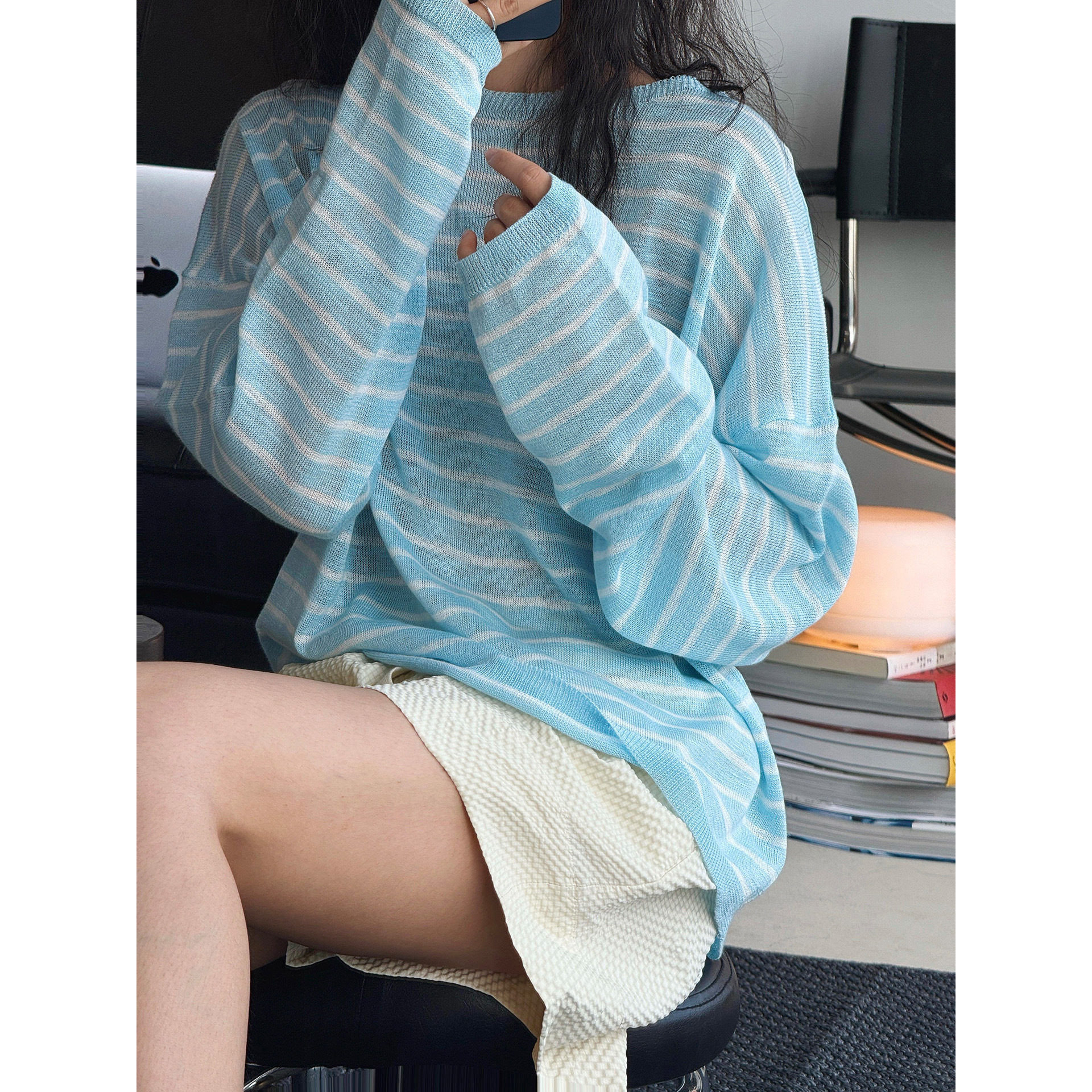 루푸 여름 새로운 한국 스타일 게으른 편안한 줄무늬 선 스크린 스웨터 여성을위한 경량 통기성 슬리밍 탑