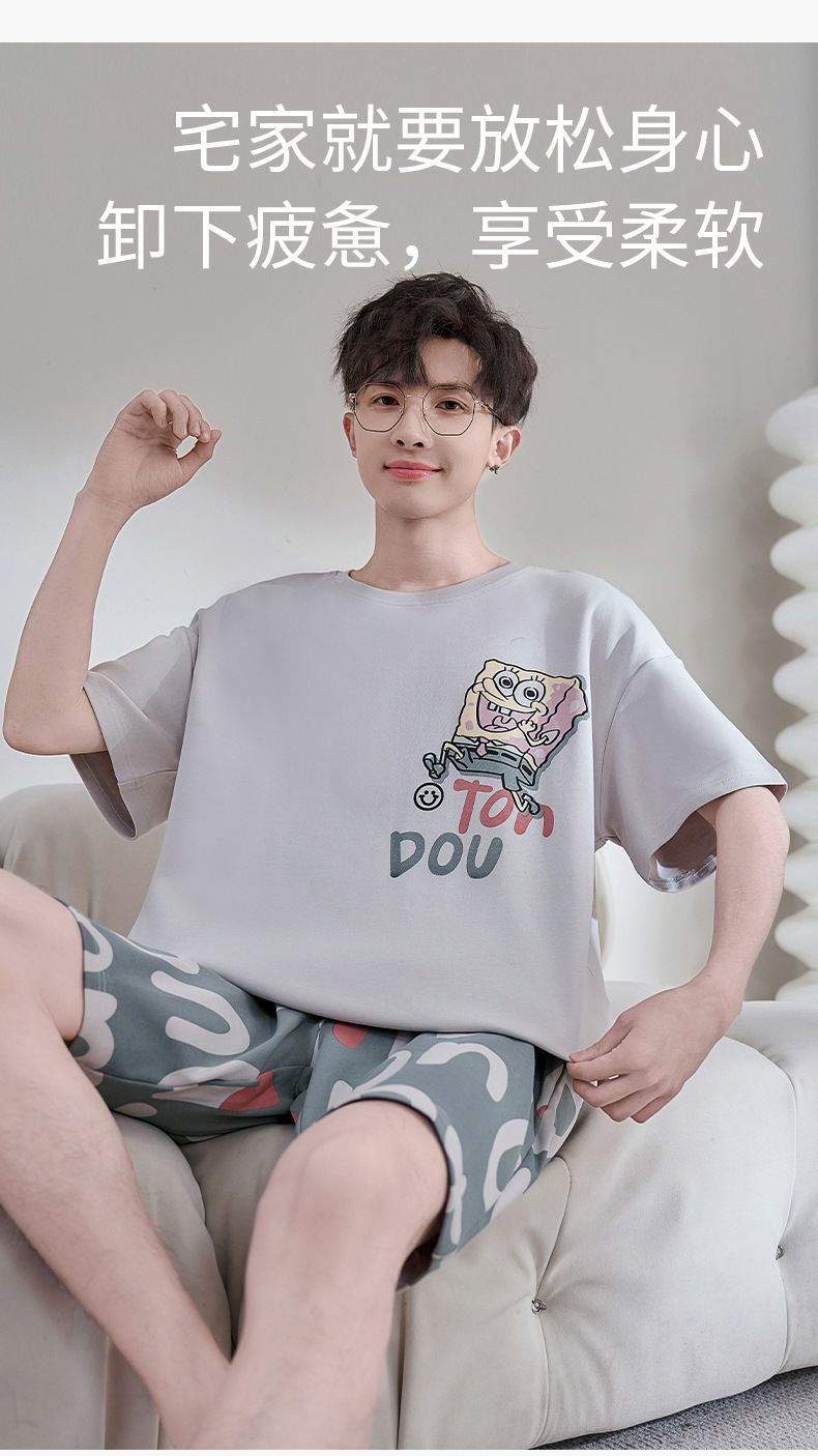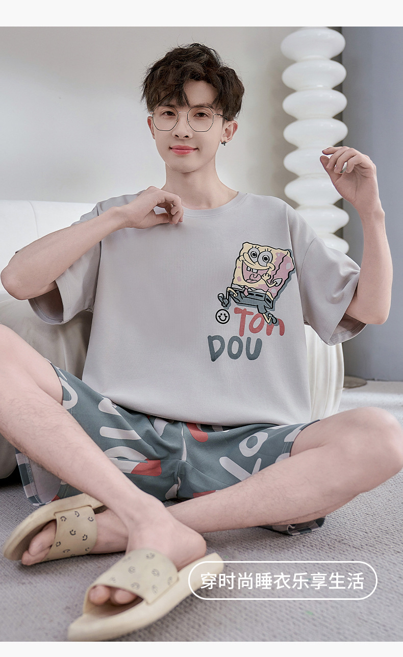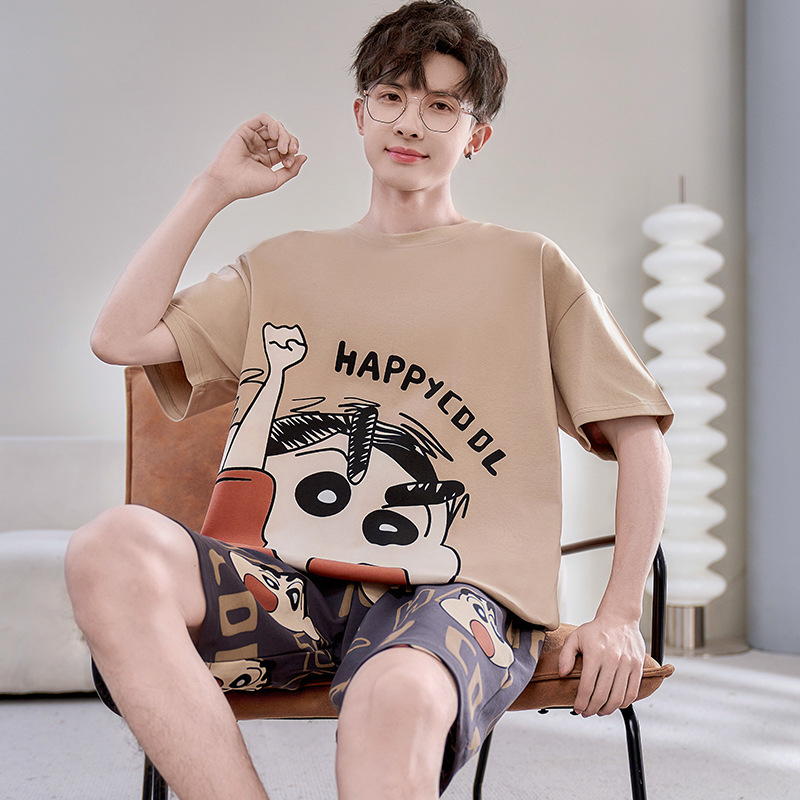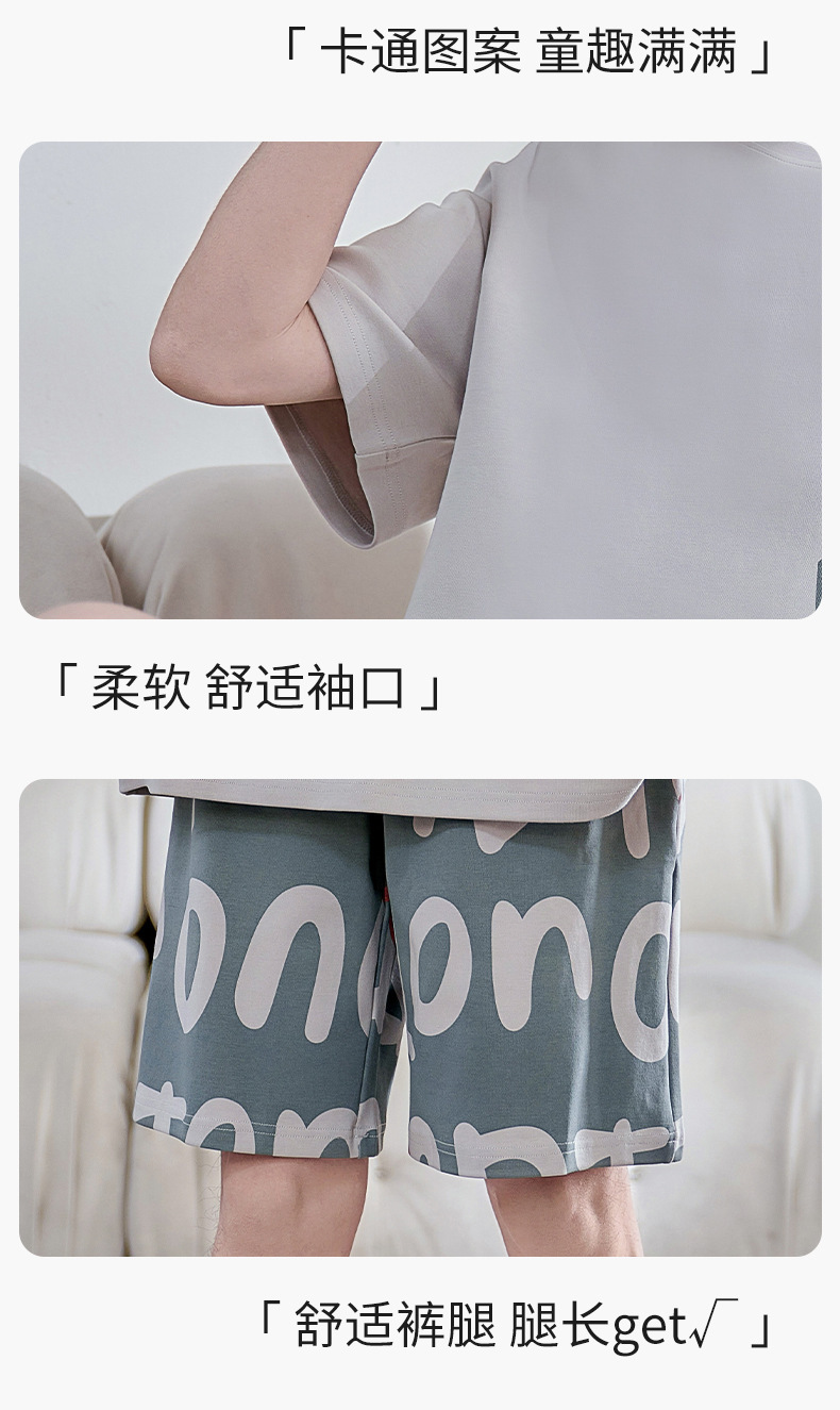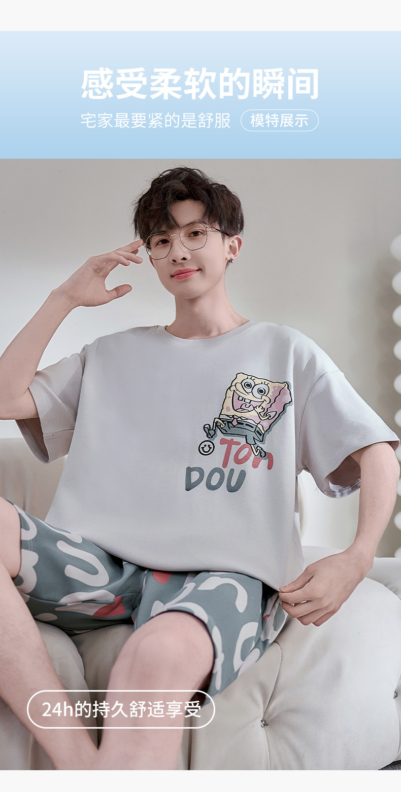 여름 새로운 순수 코튼 남성 반팔 반바지 정장 잠옷 청소년 학생 대형 느슨한 만화 가정 의류스토어 가기