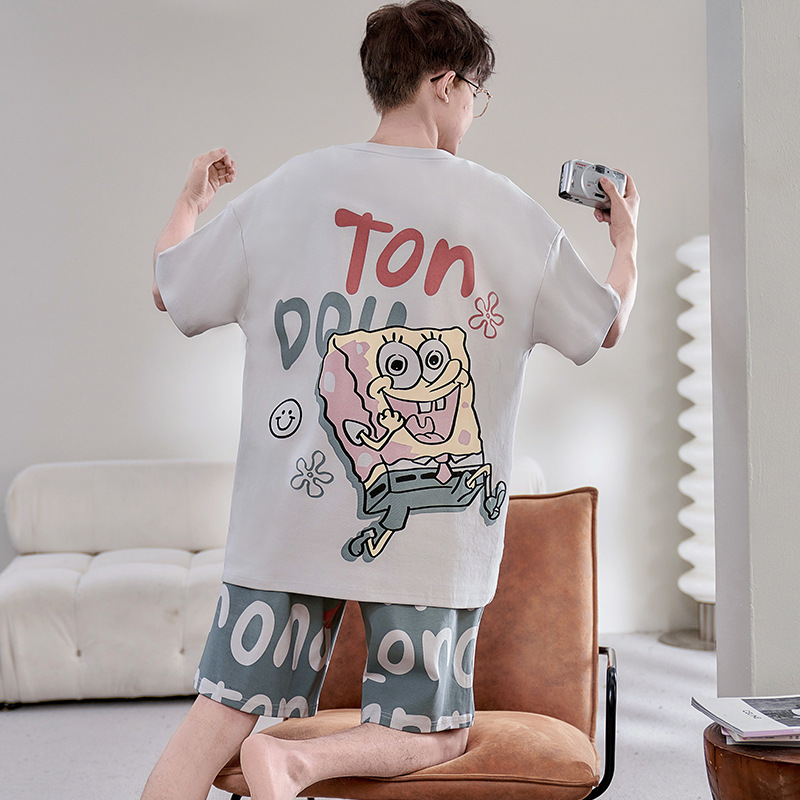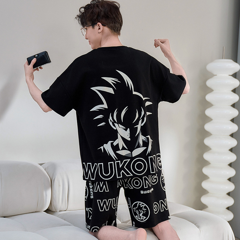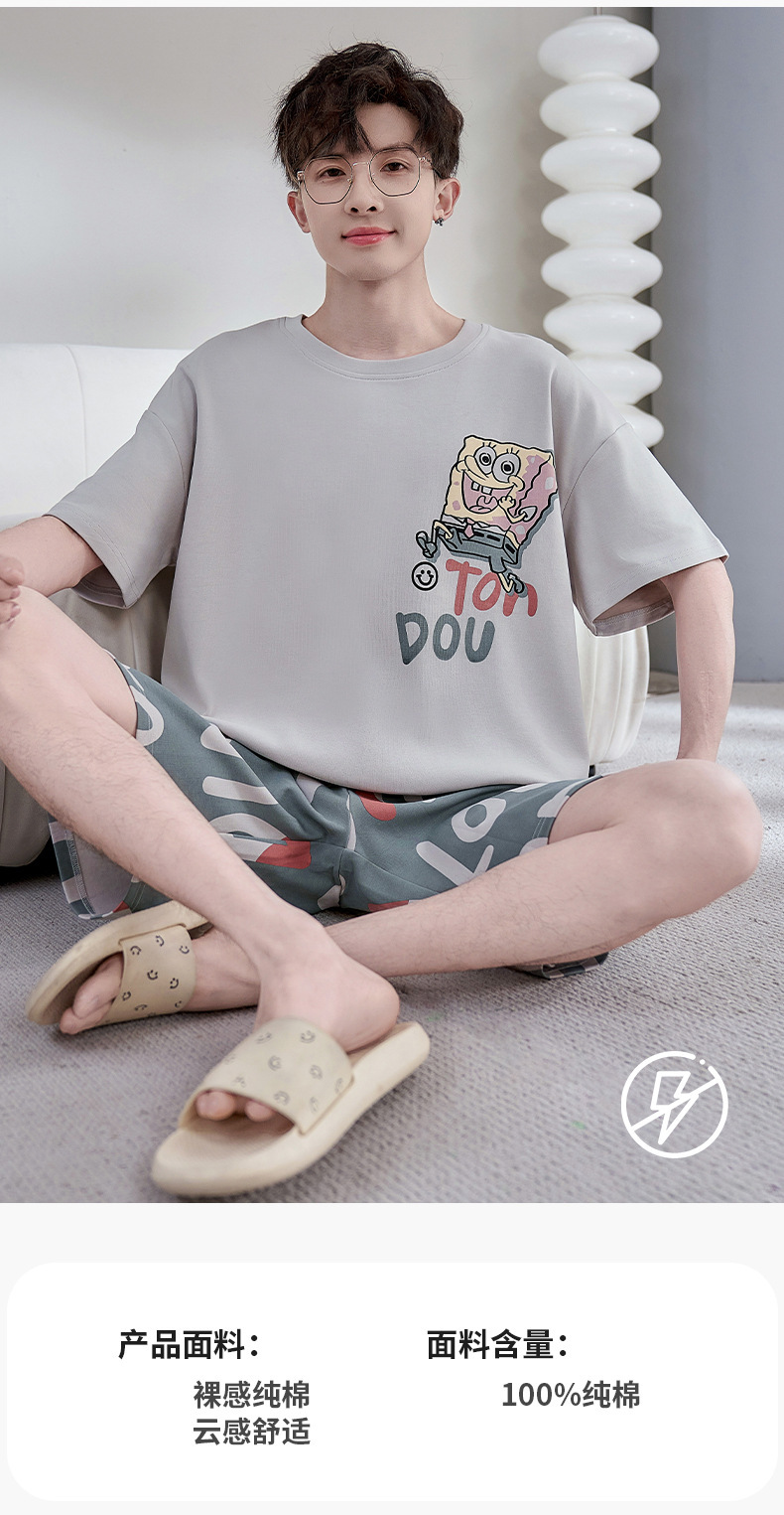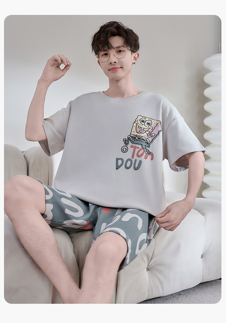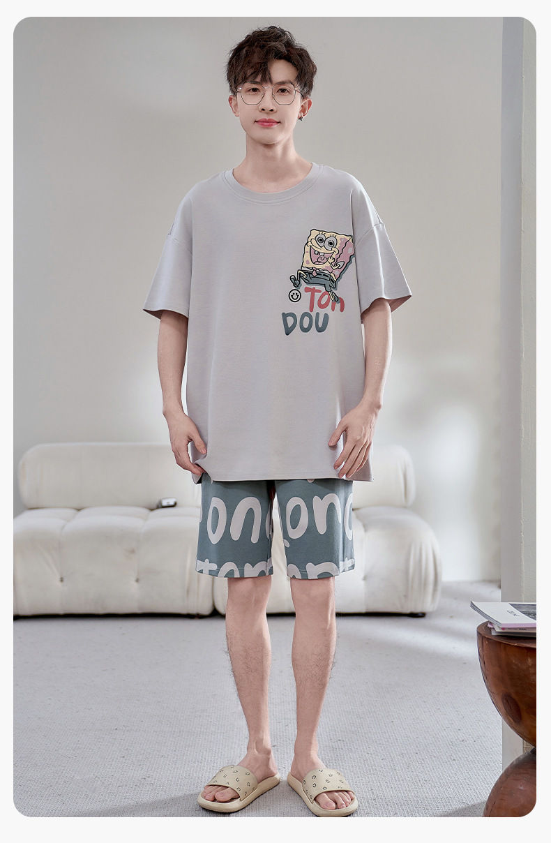 여름 새로운 순수 코튼 남성 반팔 반바지 정장 잠옷 청소년 학생 대형 느슨한 만화 가정 의류스토어 가기
