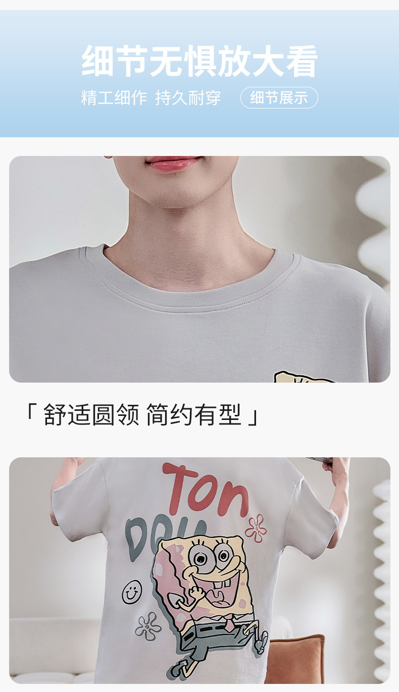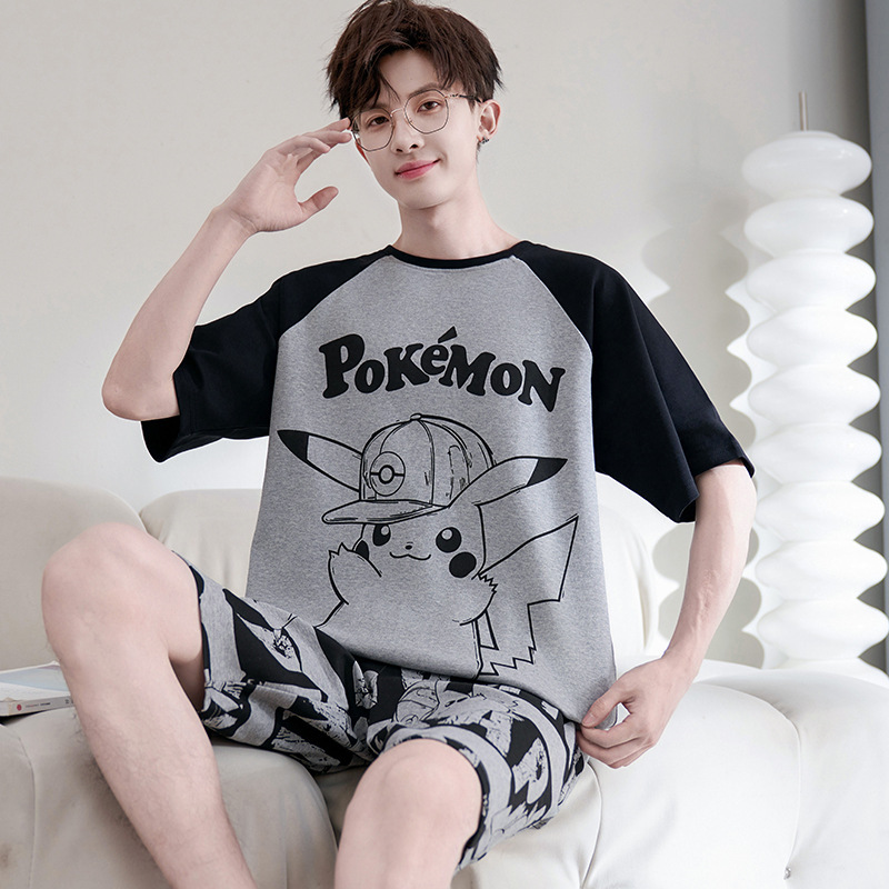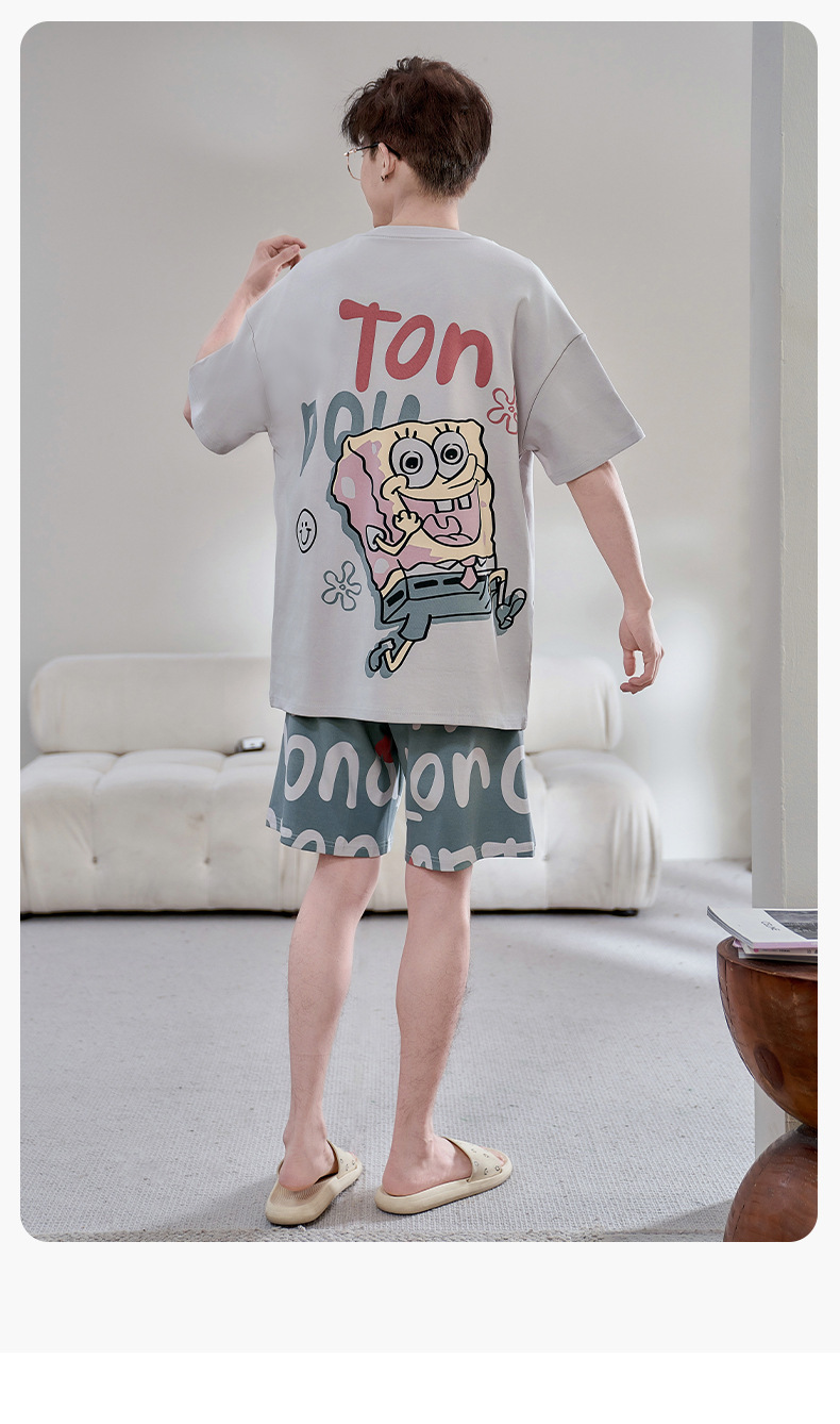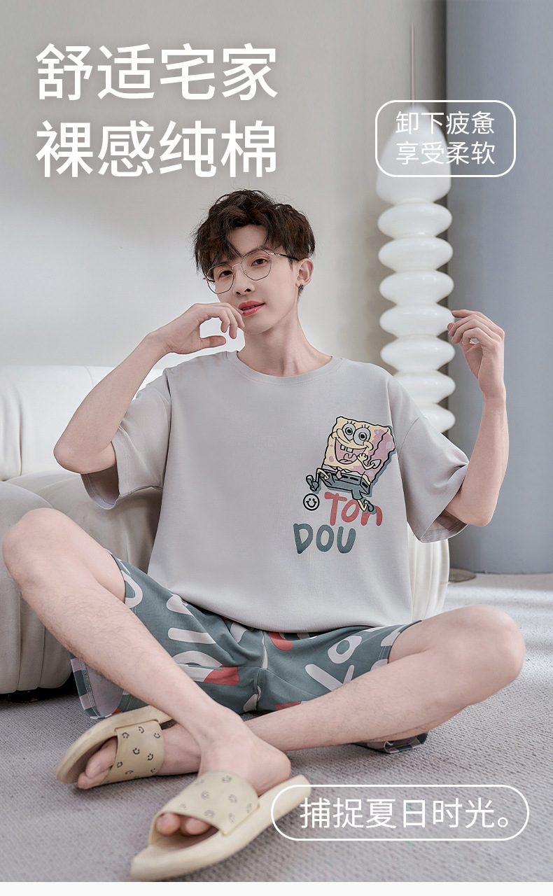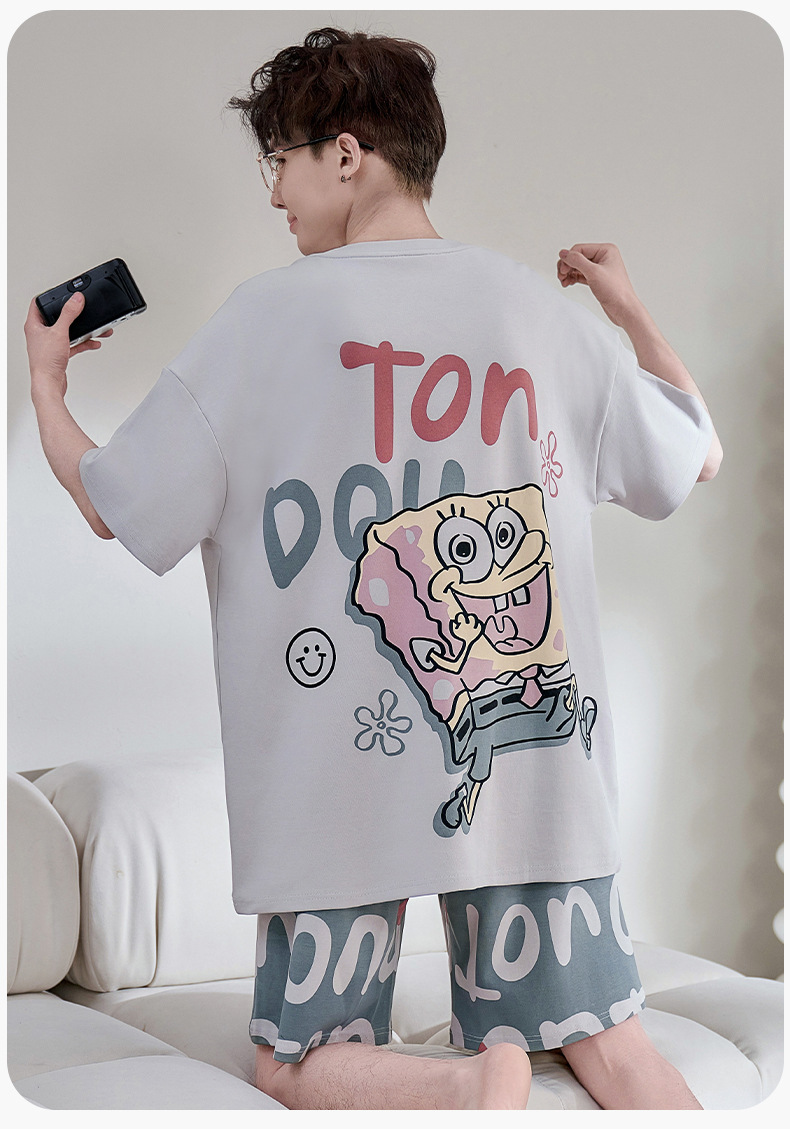여름 새로운 순수 코튼 남성 반팔 반바지 정장 잠옷 청소년 학생 대형 느슨한 만화 가정 의류스토어 가기