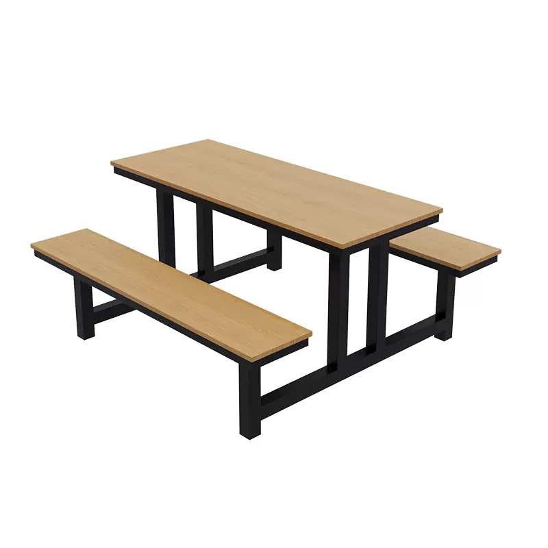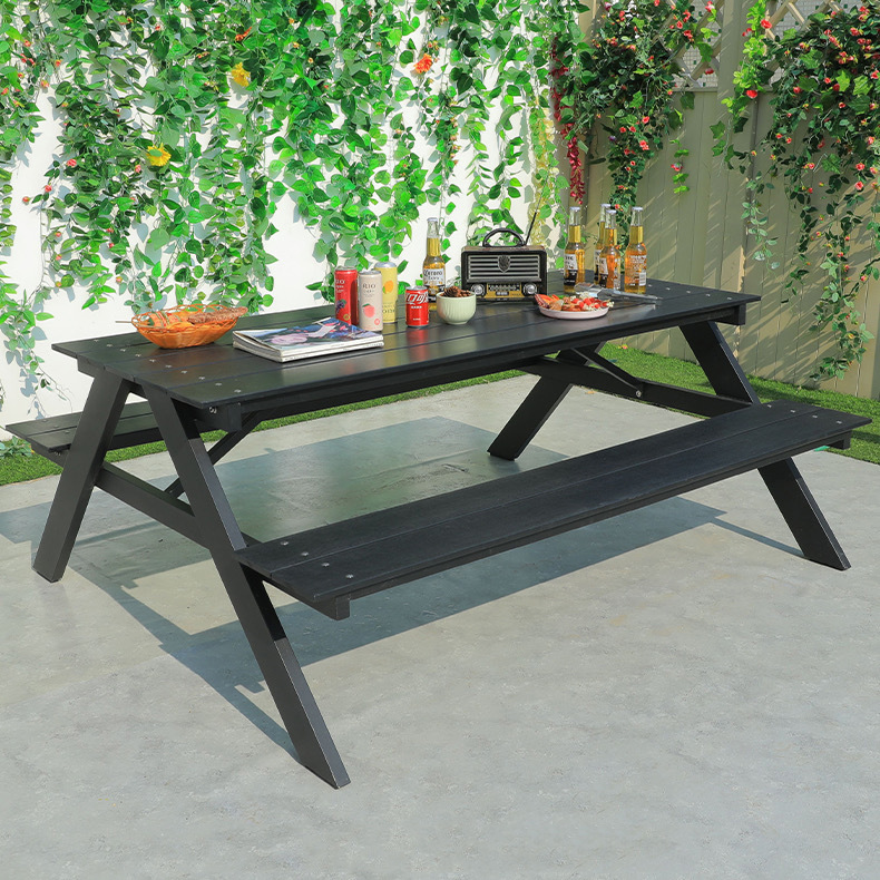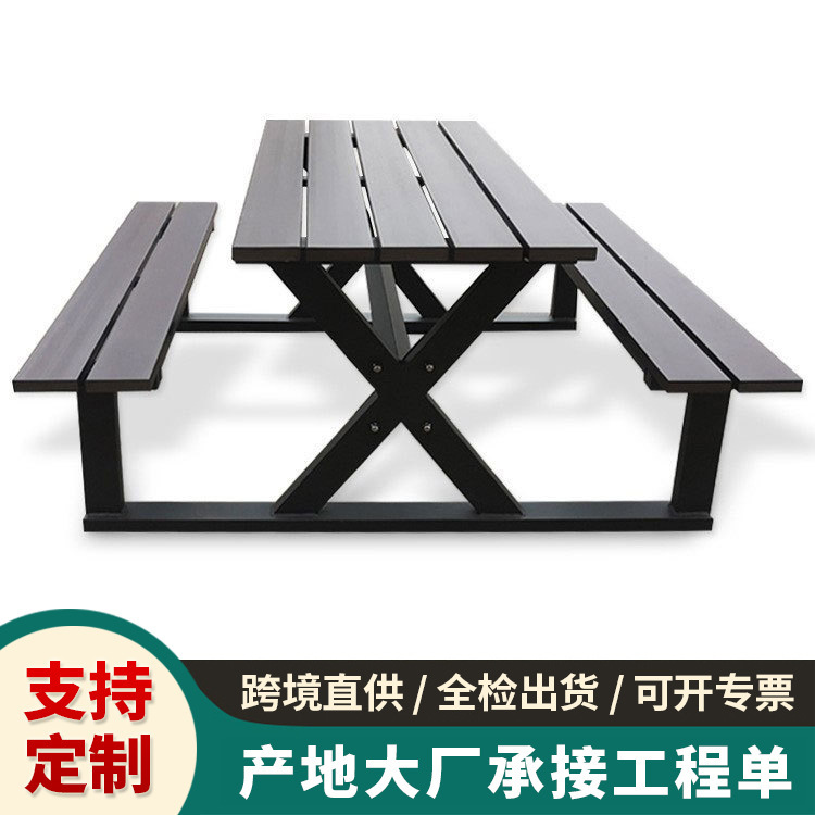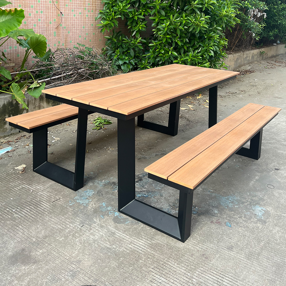 야외 일체형 테이블과 의자 조합 공원 알루미늄 프레임 아트 가든 안뜰 경관 벤치 목재 색상 방수 PE 플라스틱 목재 테이블과 의자