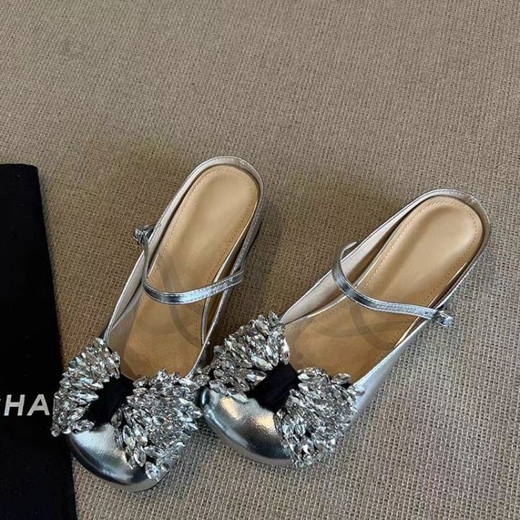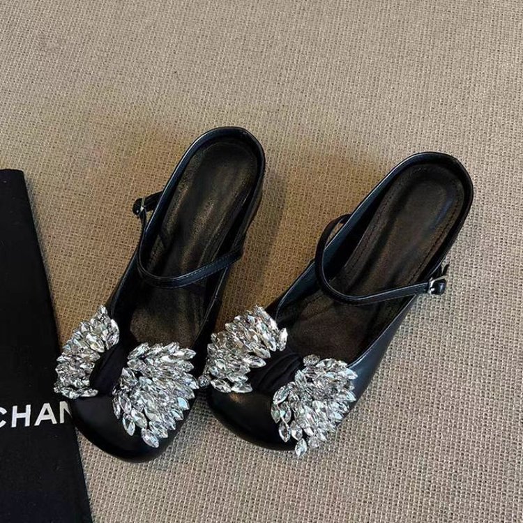 부드러운 가죽 버전! 기질 성격 Rhinestone 활 한 단어 버클 스트랩 여름 낮은 굽 샌들 여성용 Baotou 하프 토우 싱글 레이어 신발스토어 가기
