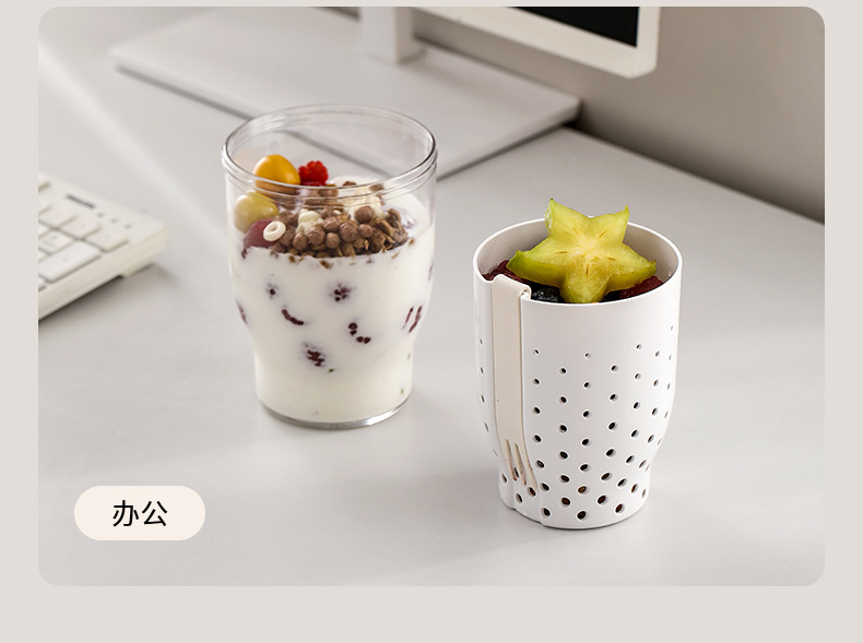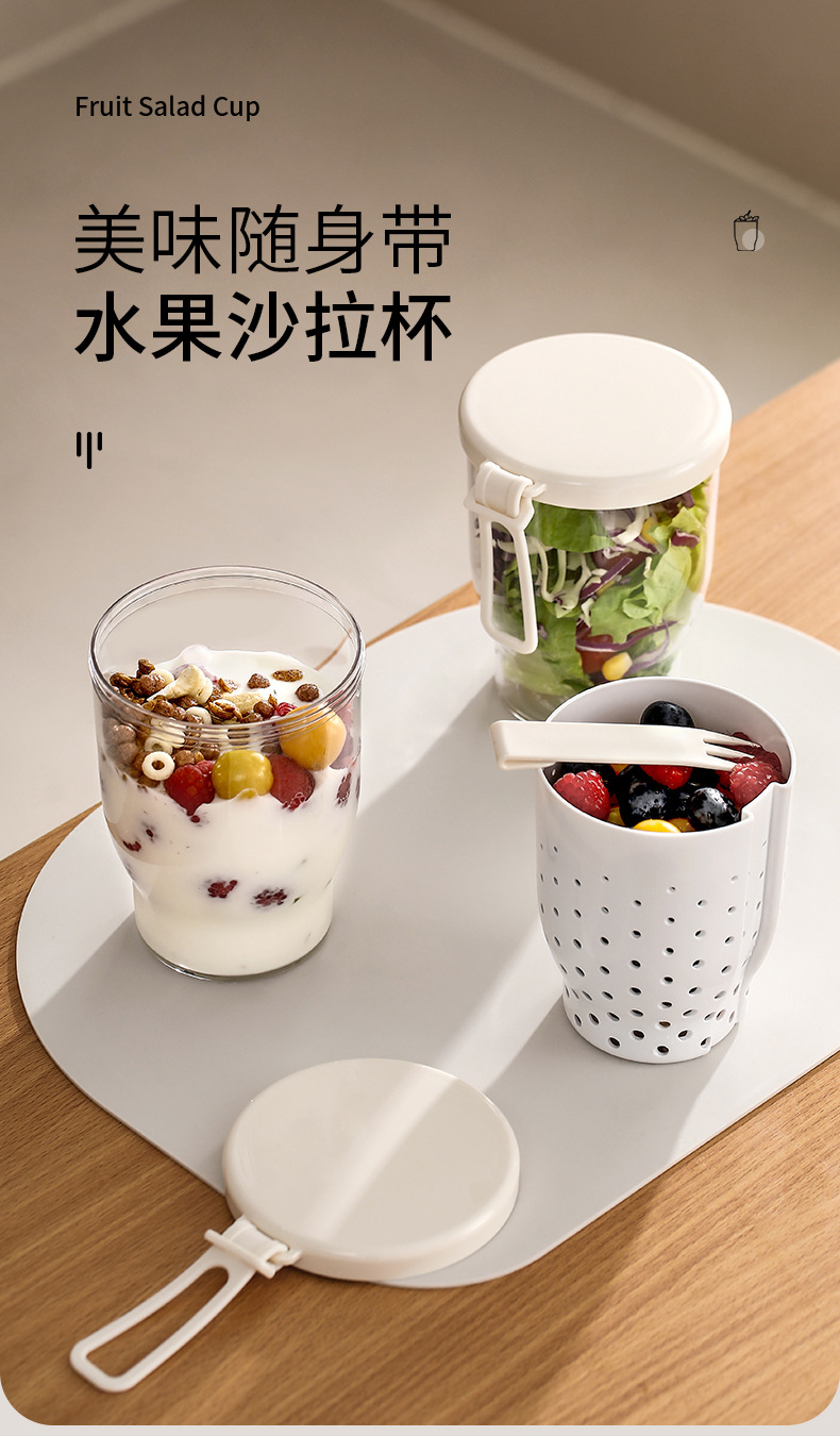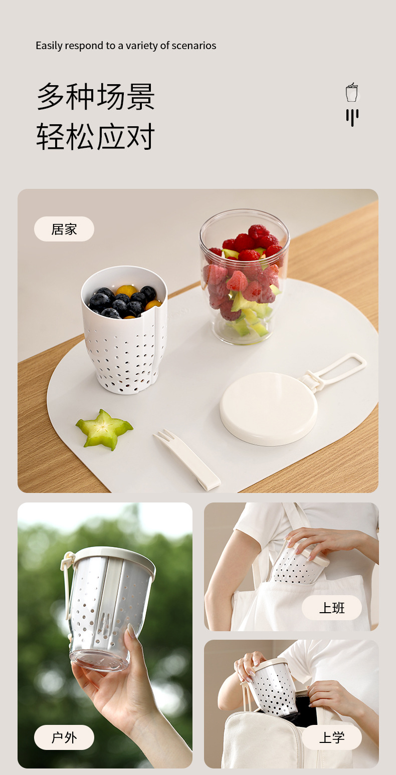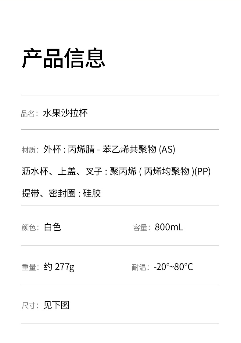 商品材质:外杯:丙烯腈-苯乙烯共聚物(AS),沥水杯(添加抗菌料的PP)、上盖、叉子:聚丙烯(丙烯均聚物)(pp),提带、密封圈:硅胶