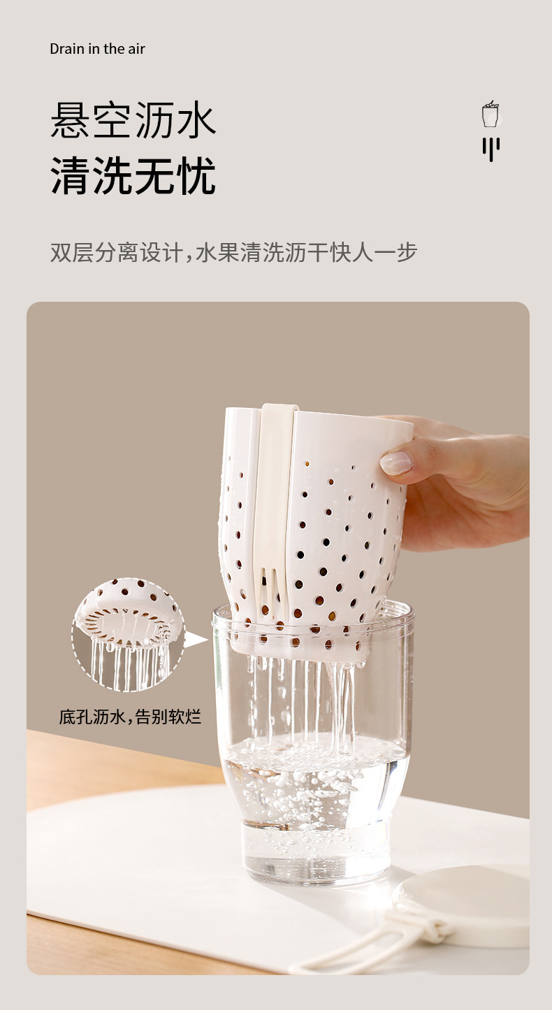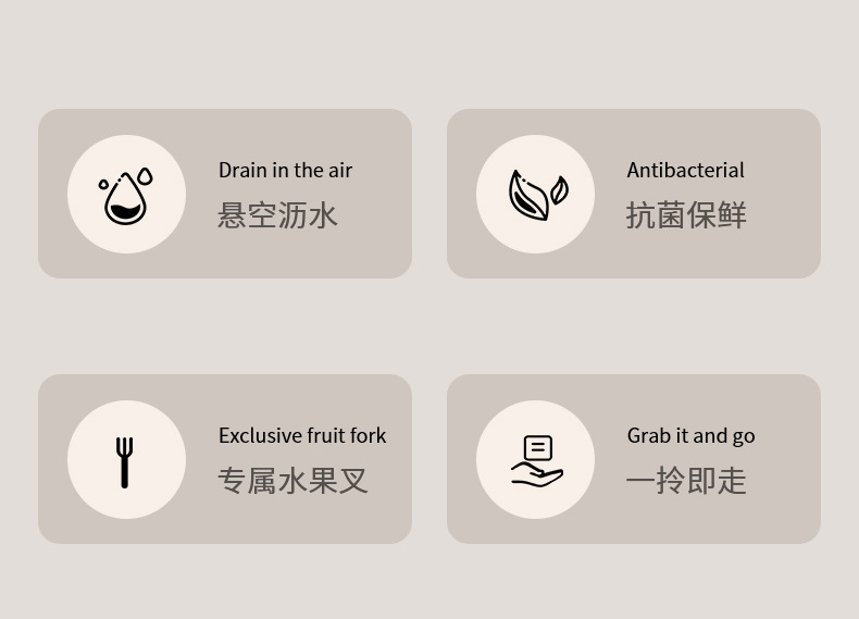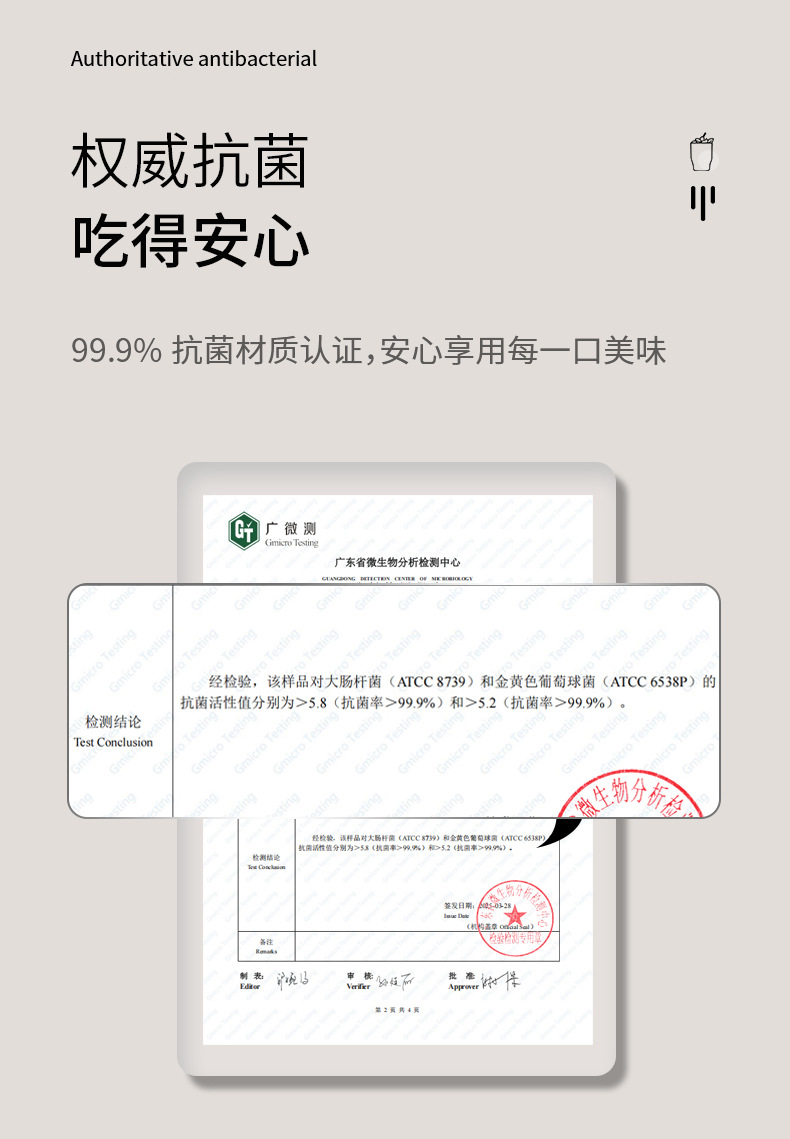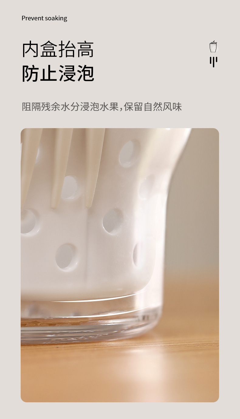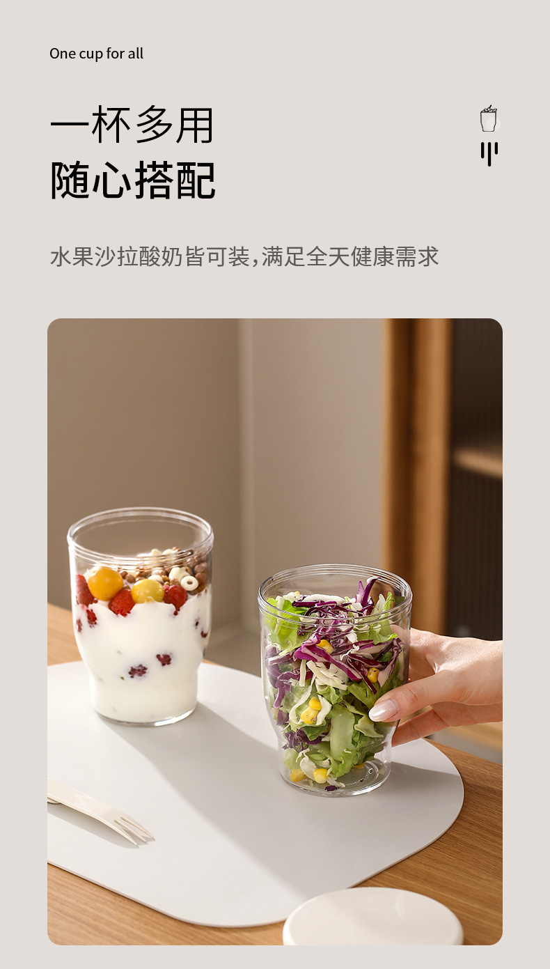 商品材质:外杯:丙烯腈-苯乙烯共聚物(AS),沥水杯(添加抗菌料的PP)、上盖、叉子:聚丙烯(丙烯均聚物)(pp),提带、密封圈:硅胶