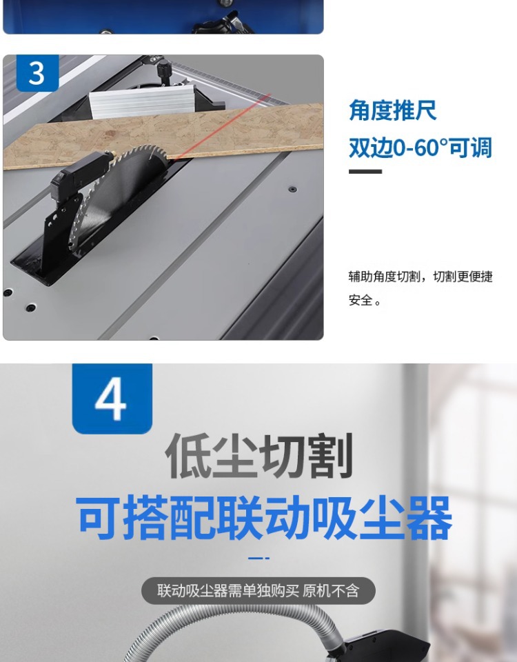 • 고속 테이블 톱 + 120톱니 톱날 + 속도 조절 연결 집진기