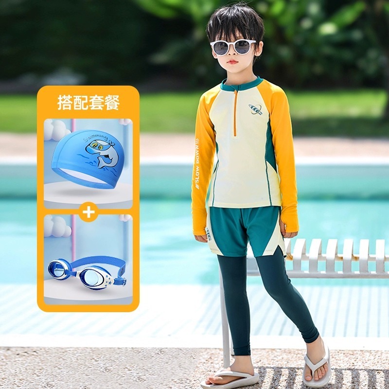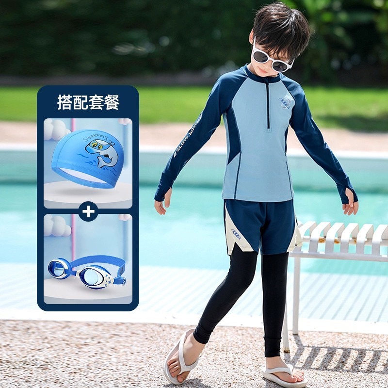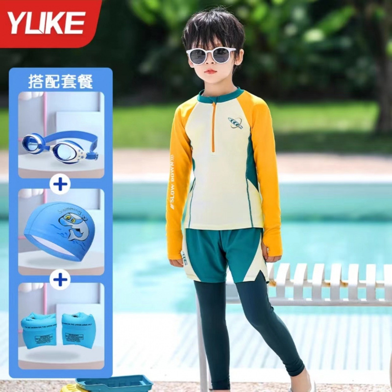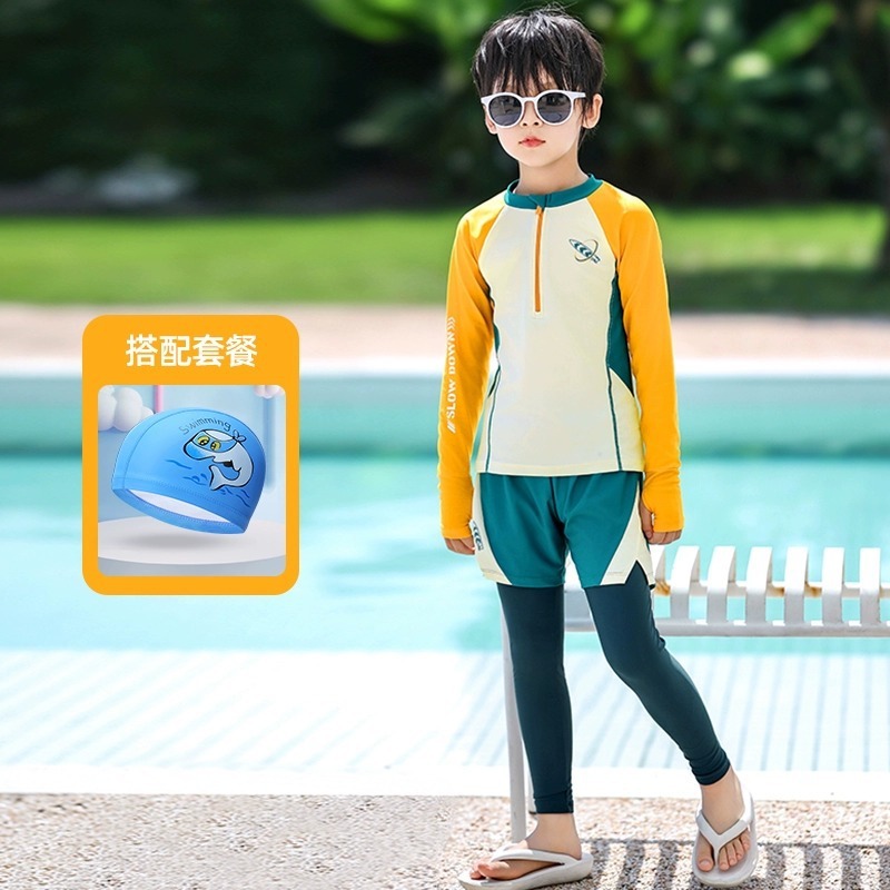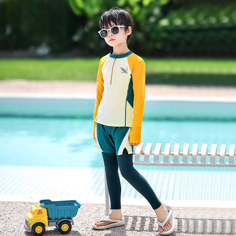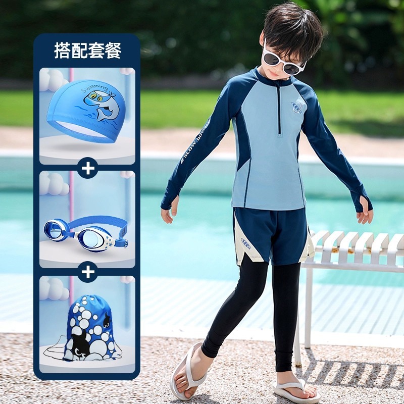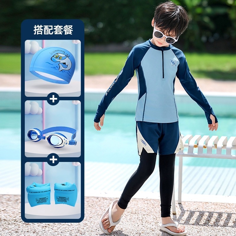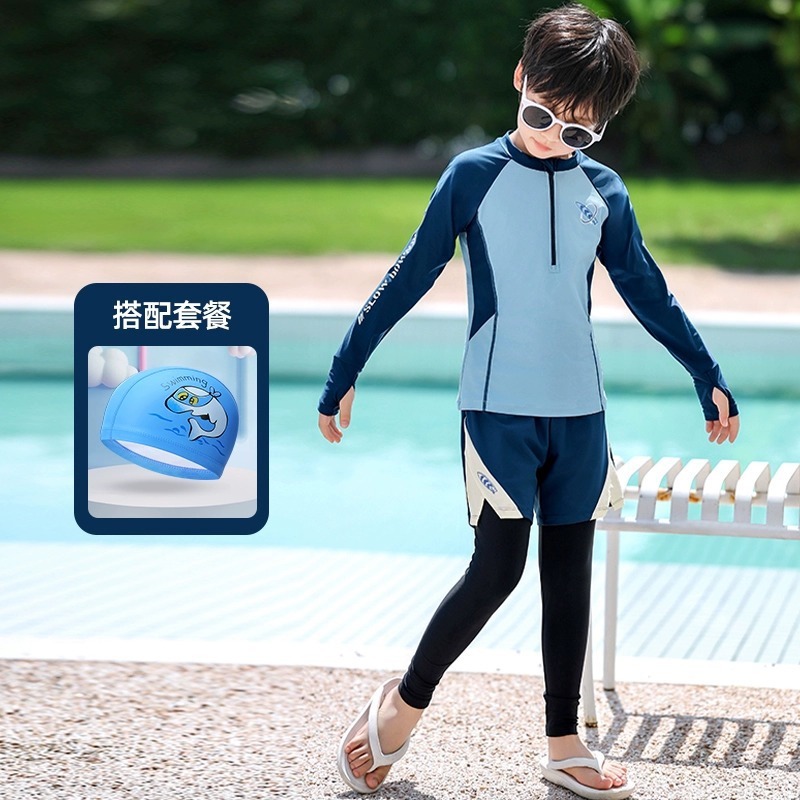 새로운 어린이 수영복 소년 분할 긴팔 양복 새로운 태양 보호 소형, 중형 및 대형 어린이 수영 전문 속건성 수영복