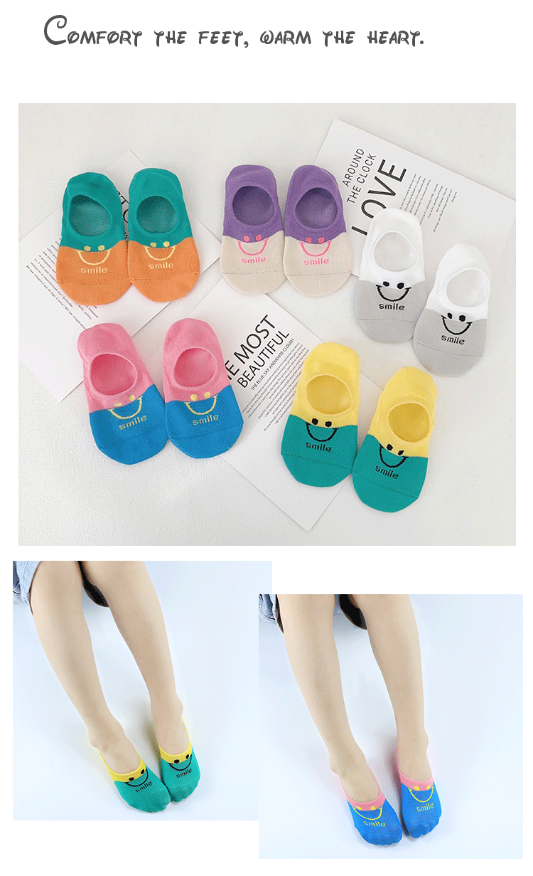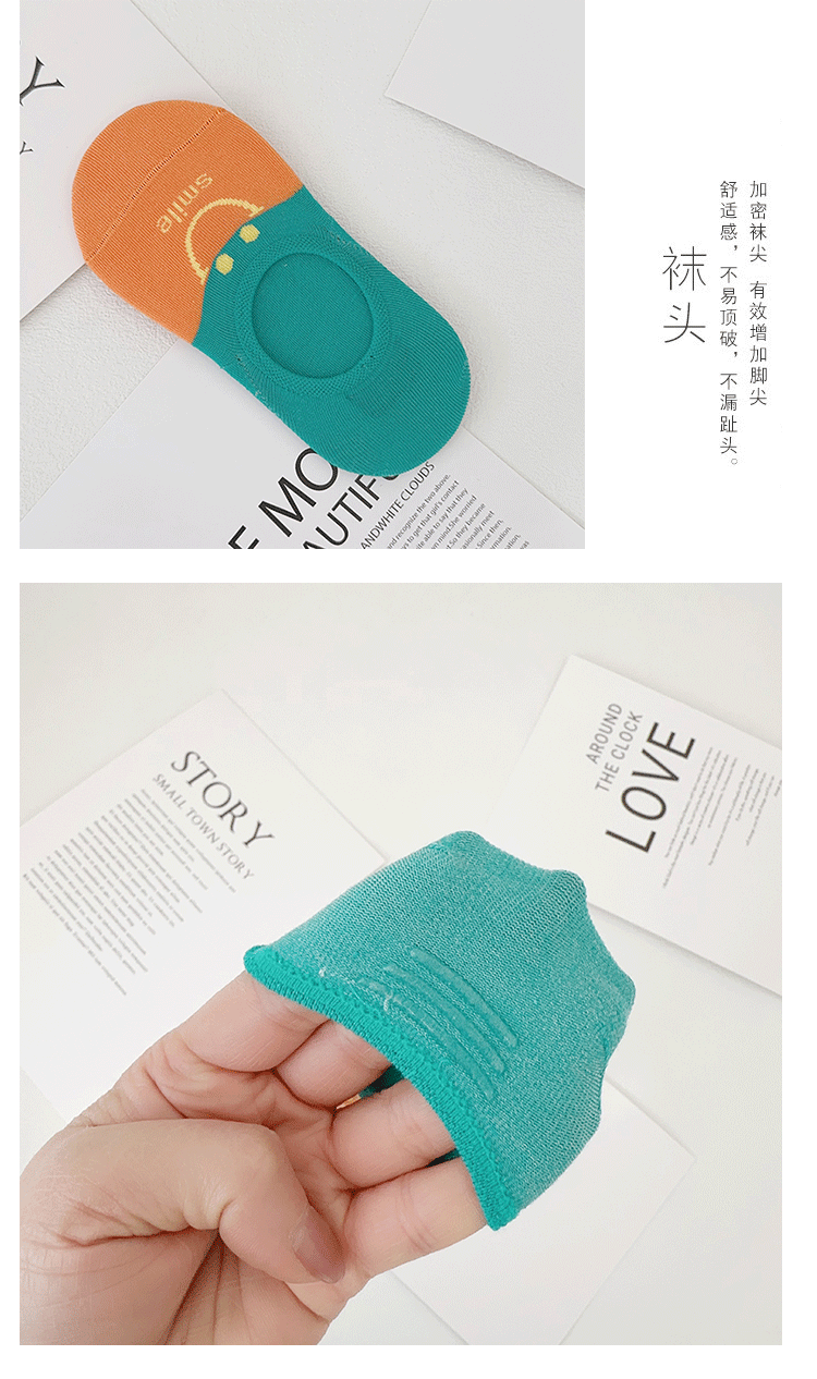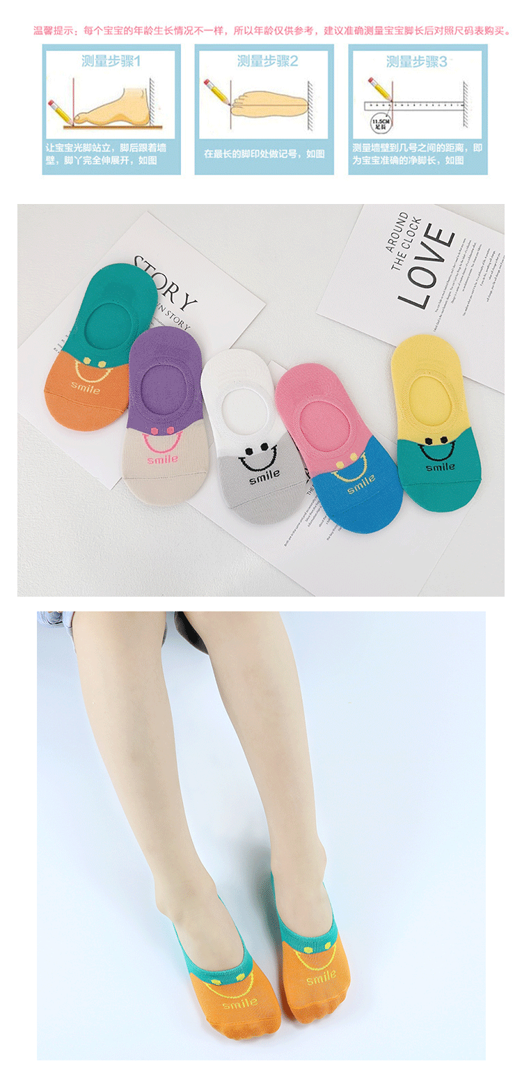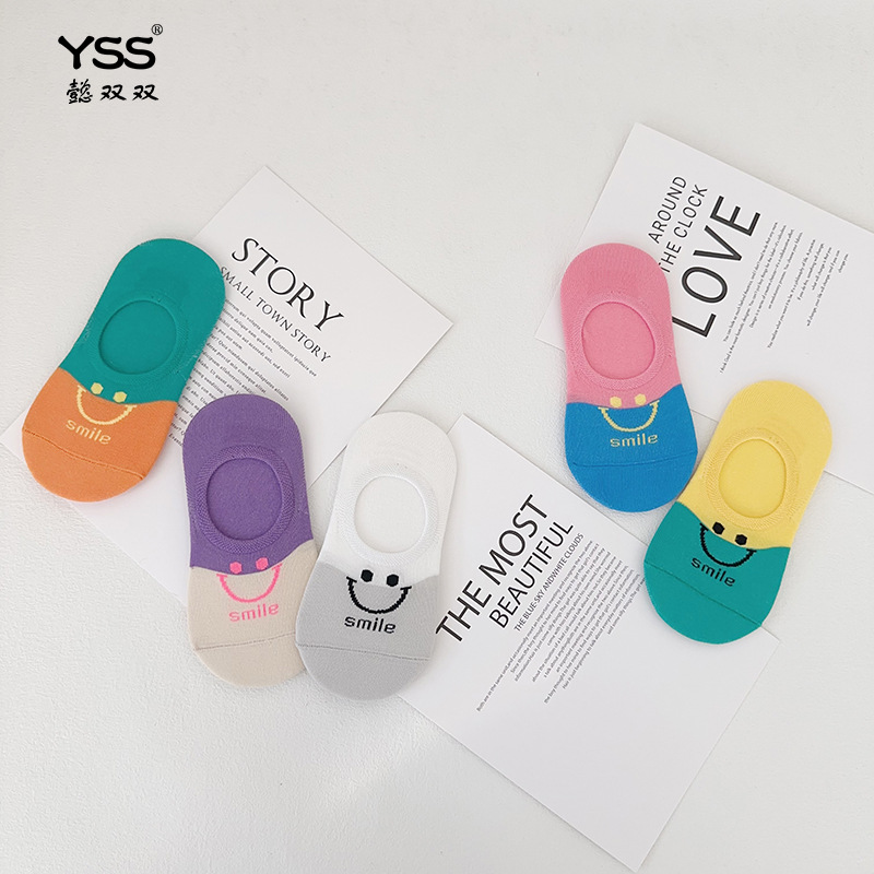 Yishuangshuang 어린이 양말 여름 새로운 만화 웃는 얼굴 보트 양말 빗질면 대비 색상 얕은 입 미끄럼 방지 양말 보이지 않는 양말