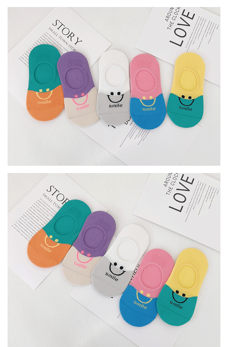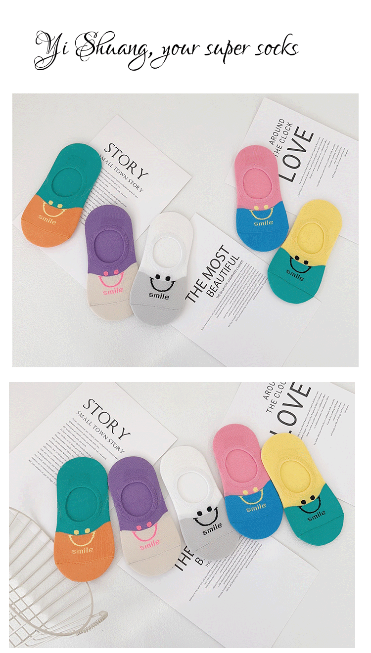 Yishuangshuang 어린이 양말 여름 새로운 만화 웃는 얼굴 보트 양말 빗질면 대비 색상 얕은 입 미끄럼 방지 양말 보이지 않는 양말스토어 가기