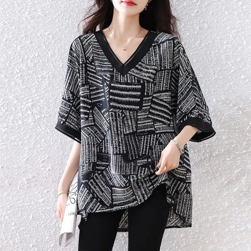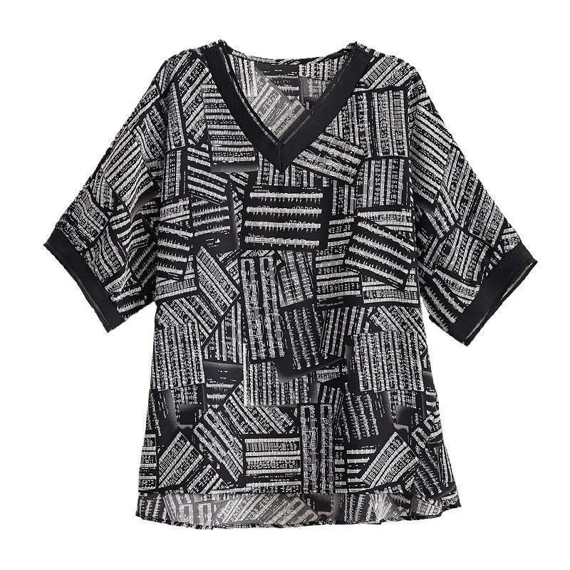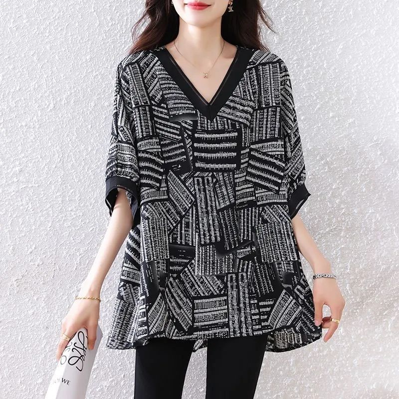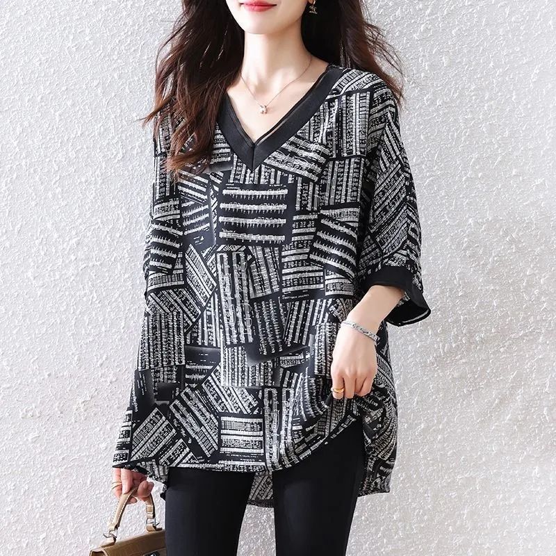 뚱뚱한 여성을 위한 플러스 사이즈 서양식 쉬폰 셔츠 2025 여름 루즈한 배 커버 기질 고급 프린트 T
