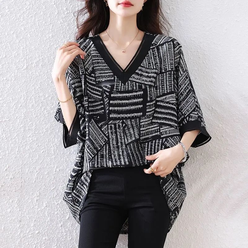 뚱뚱한 여성을 위한 플러스 사이즈 서양식 쉬폰 셔츠 2025 여름 루즈한 배 커버 기질 고급 프린트 T스토어 가기