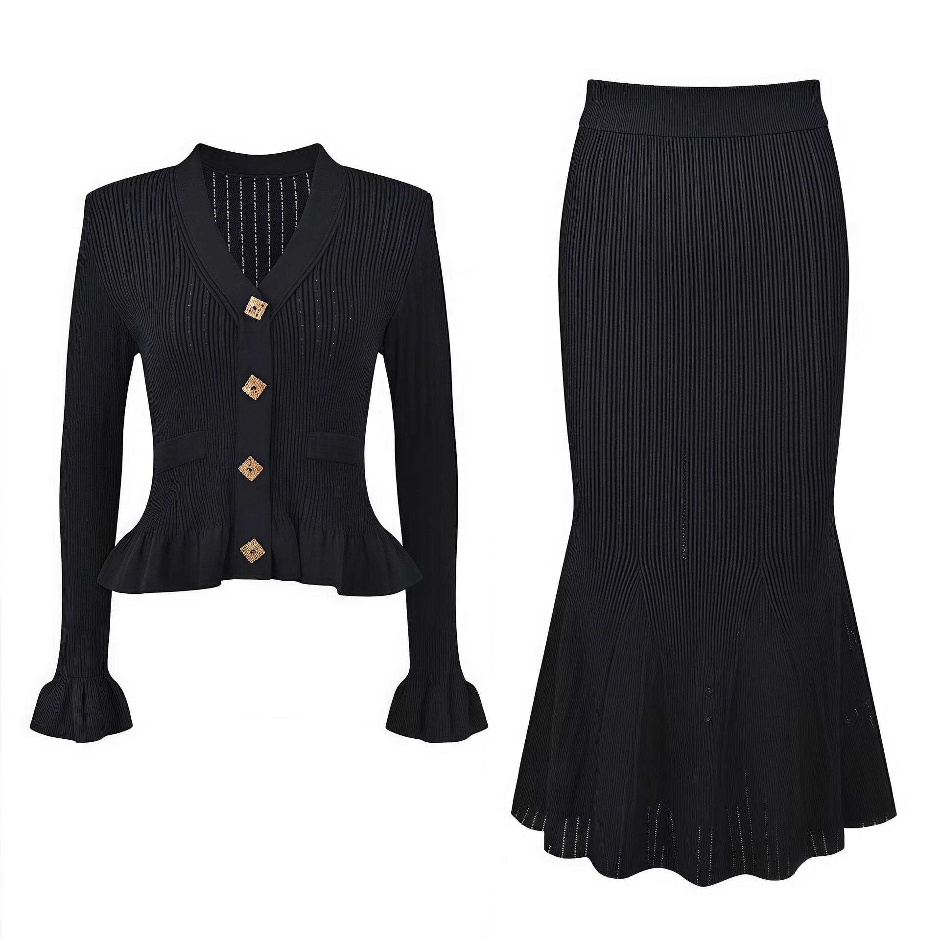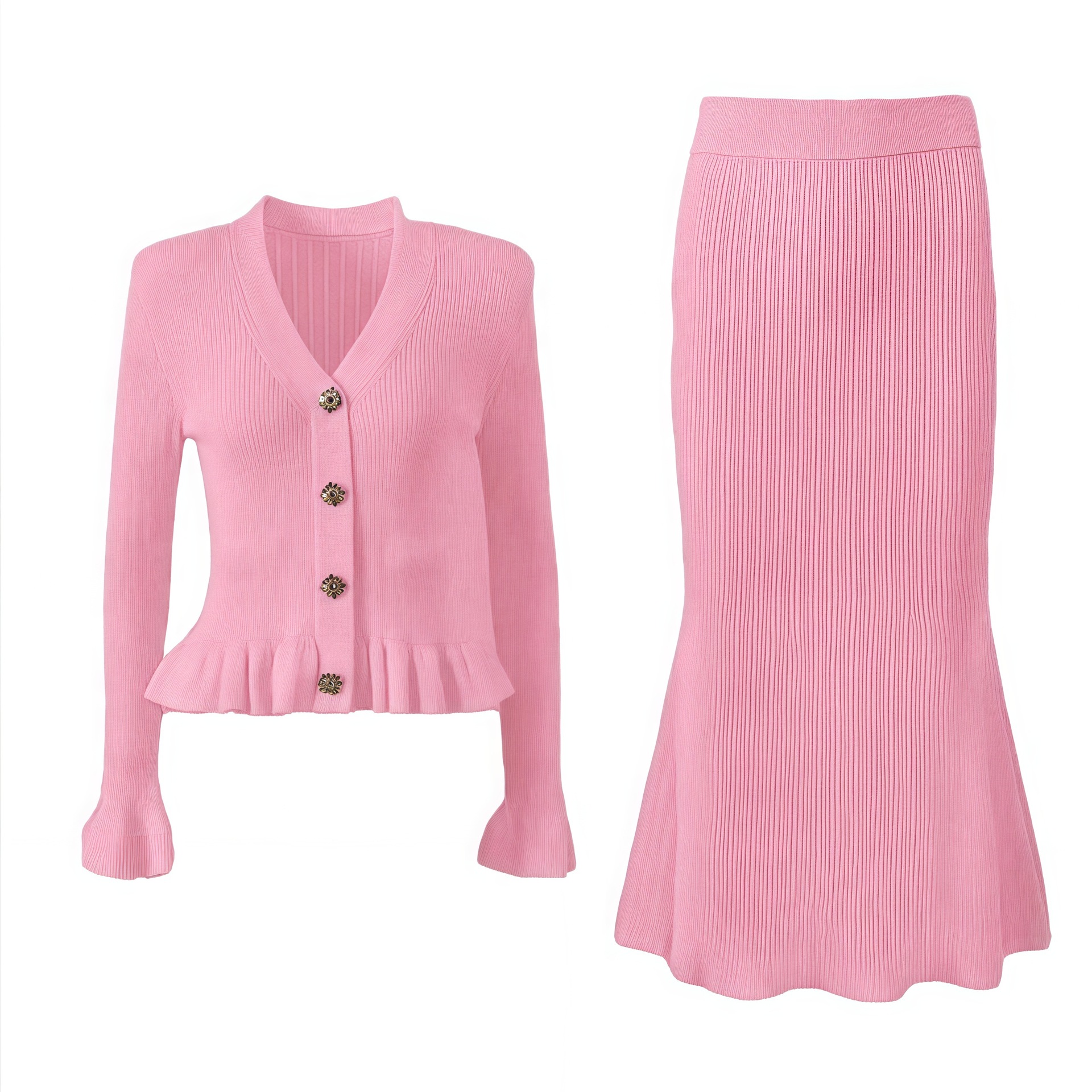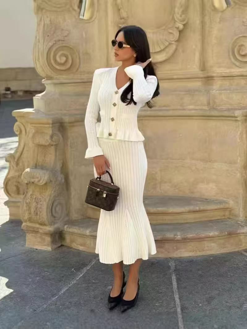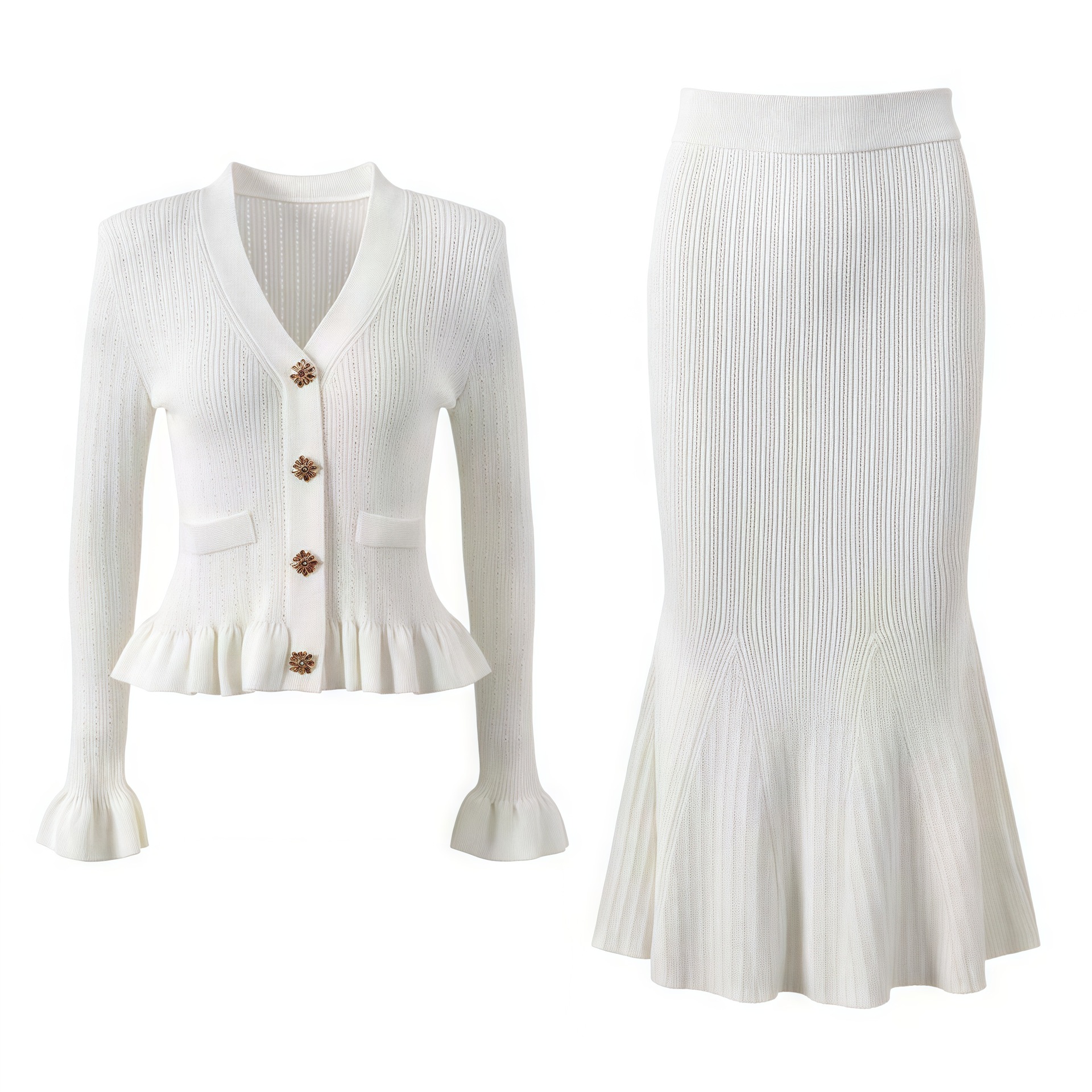 대외 무역 프렌치 브이넥 러플 긴팔 가디건, 힙을 덮는 피쉬테일 롱 스커트, 여성용 신축성 있는 니트 투피스 슈트스토어 가기