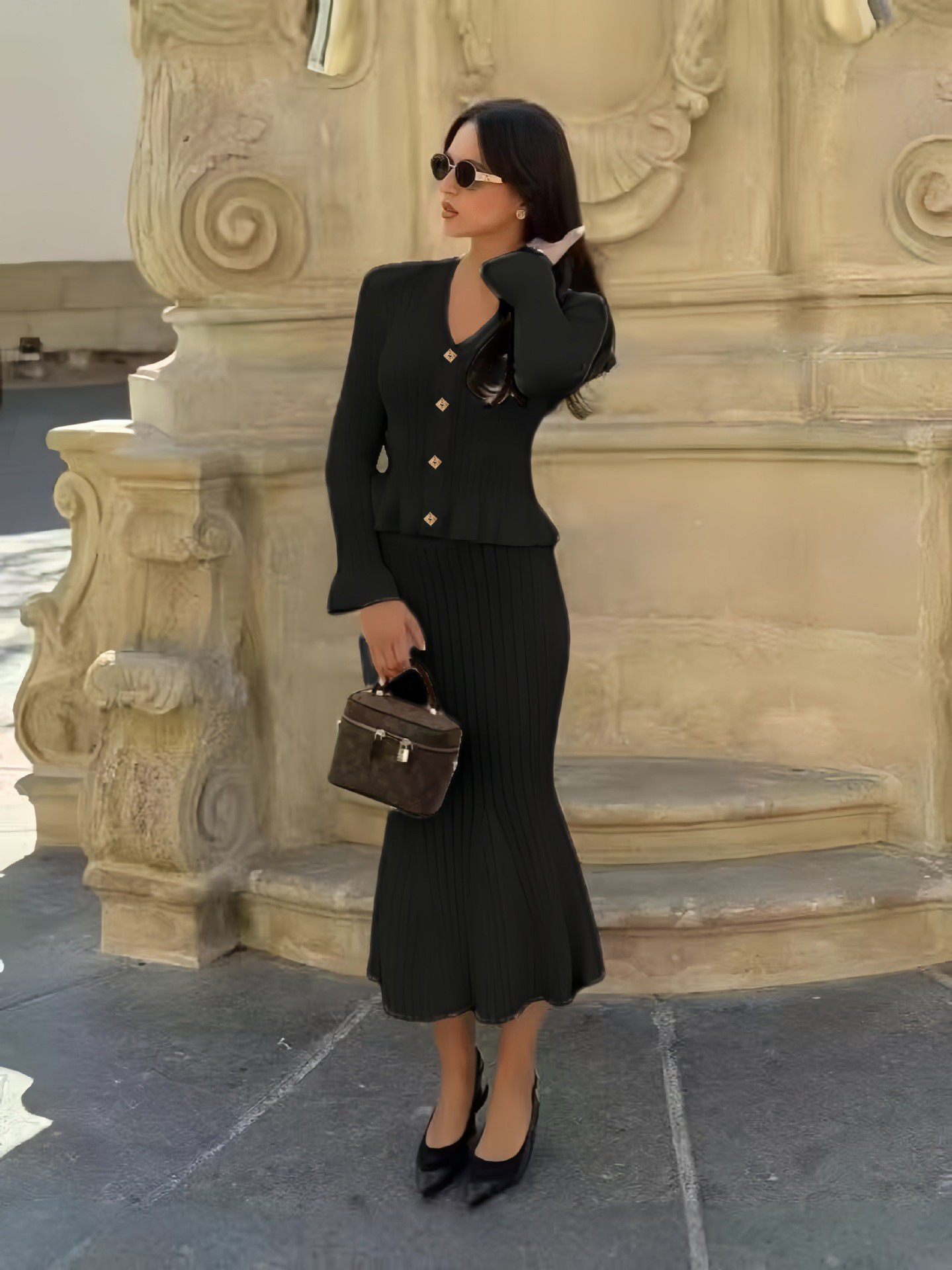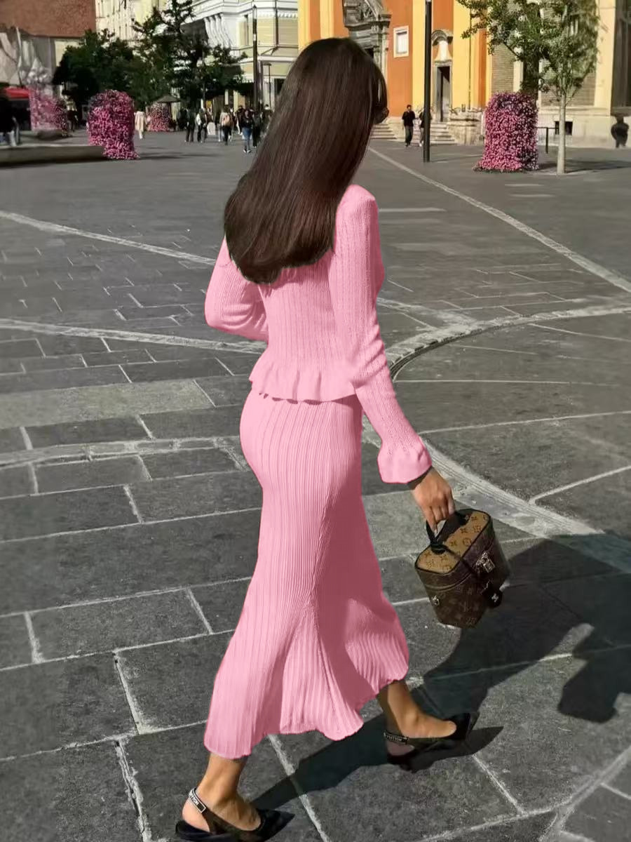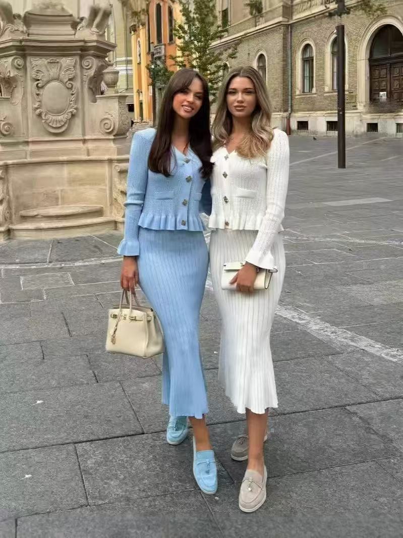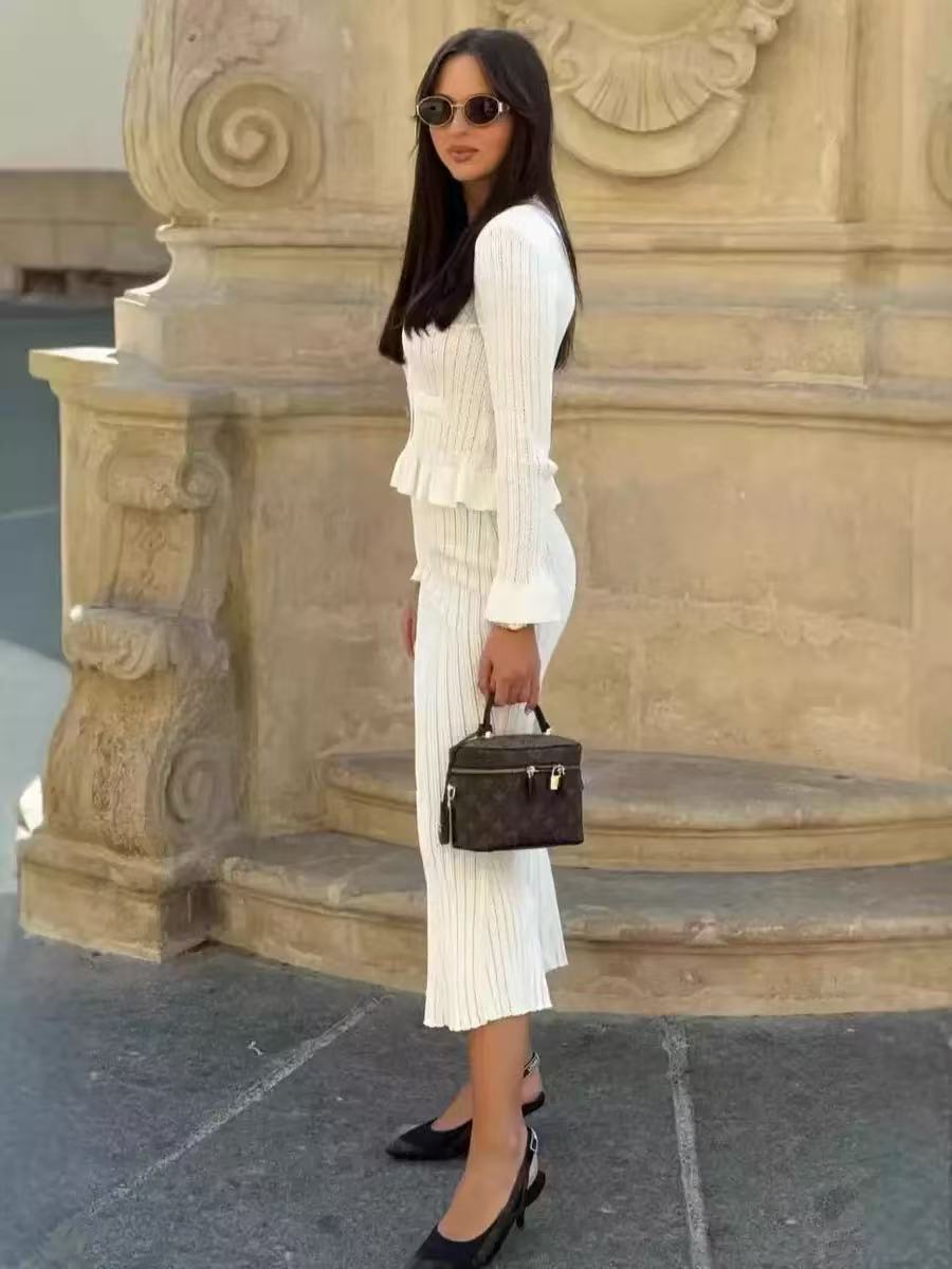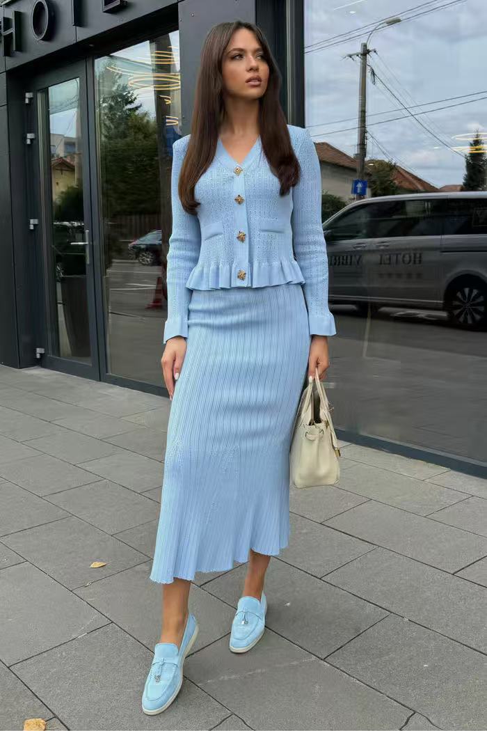 대외 무역 프렌치 브이넥 러플 긴팔 가디건, 힙을 덮는 피쉬테일 롱 스커트, 여성용 신축성 있는 니트 투피스 슈트스토어 가기