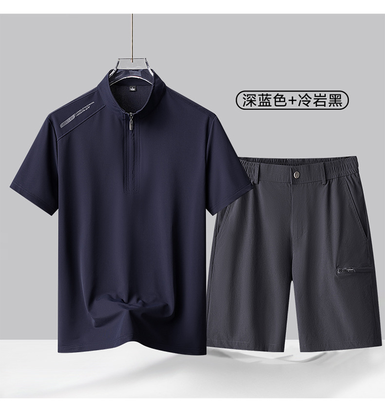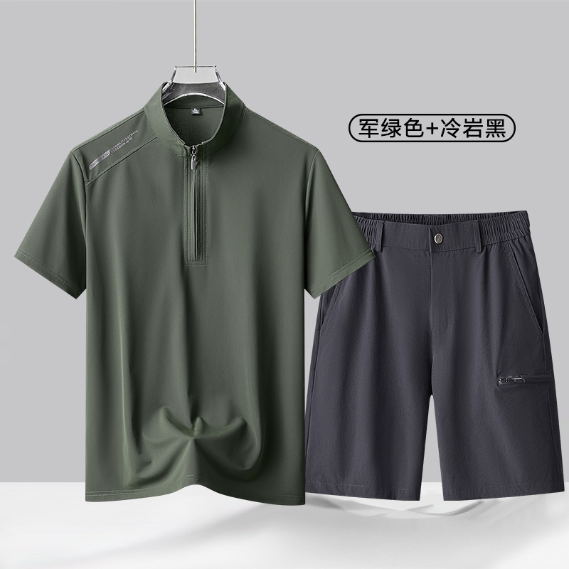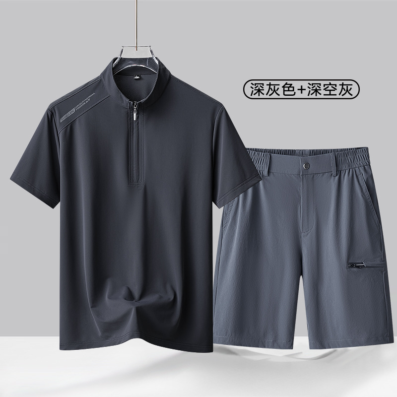 가벼운 비즈니스 여름 하이 엔드 캐주얼 반바지 정장 남성용 아이스 실크 폴로 셔츠 중년 남성용 아이스 실크 바지 투피스 세트스토어 가기