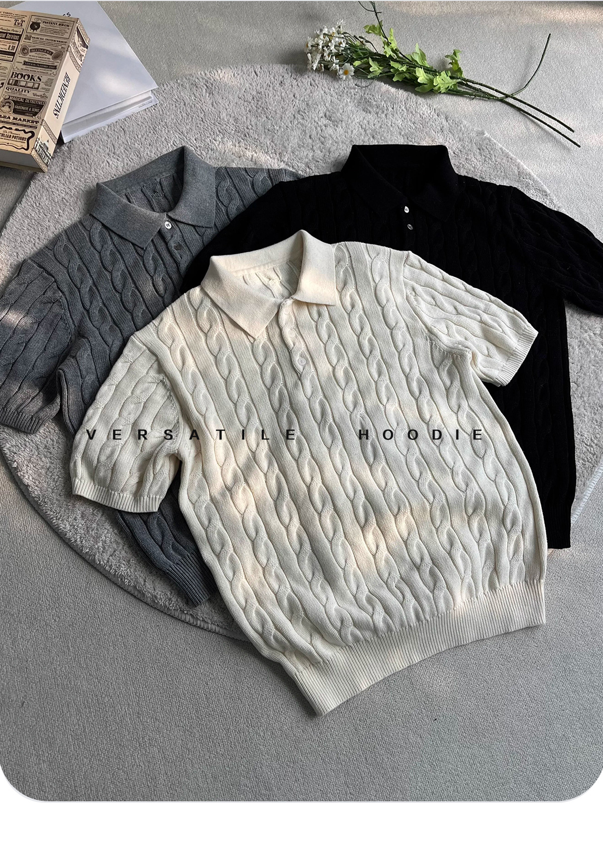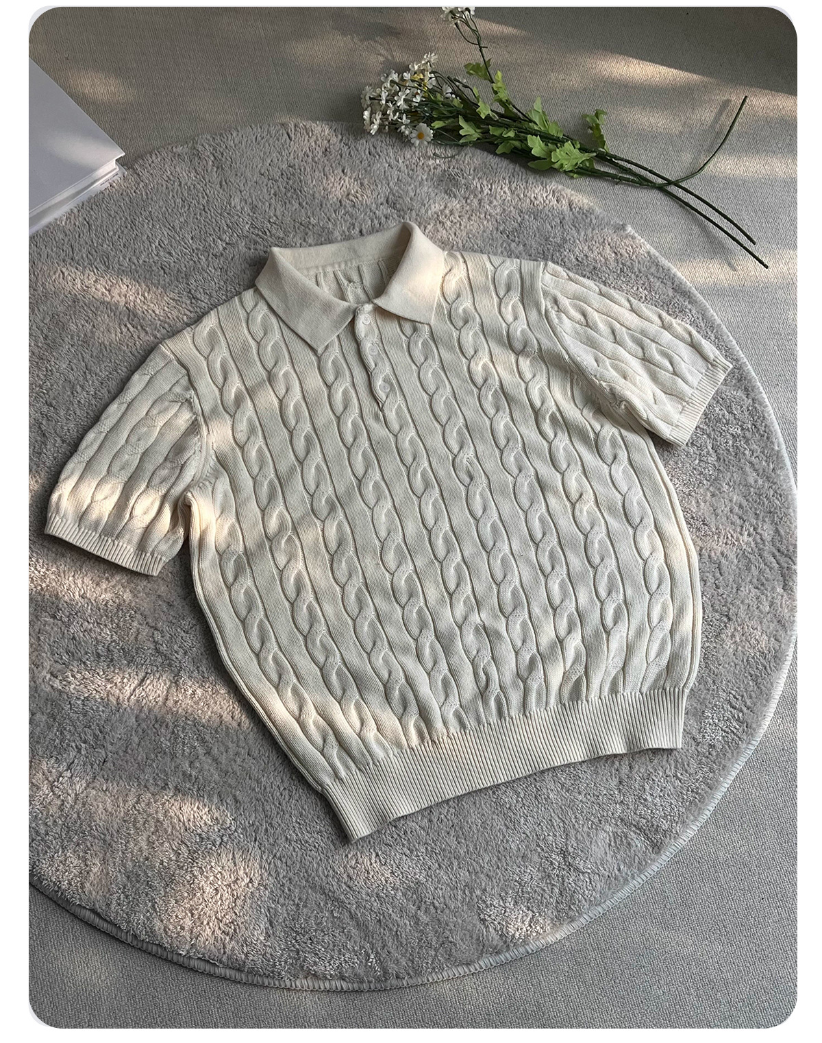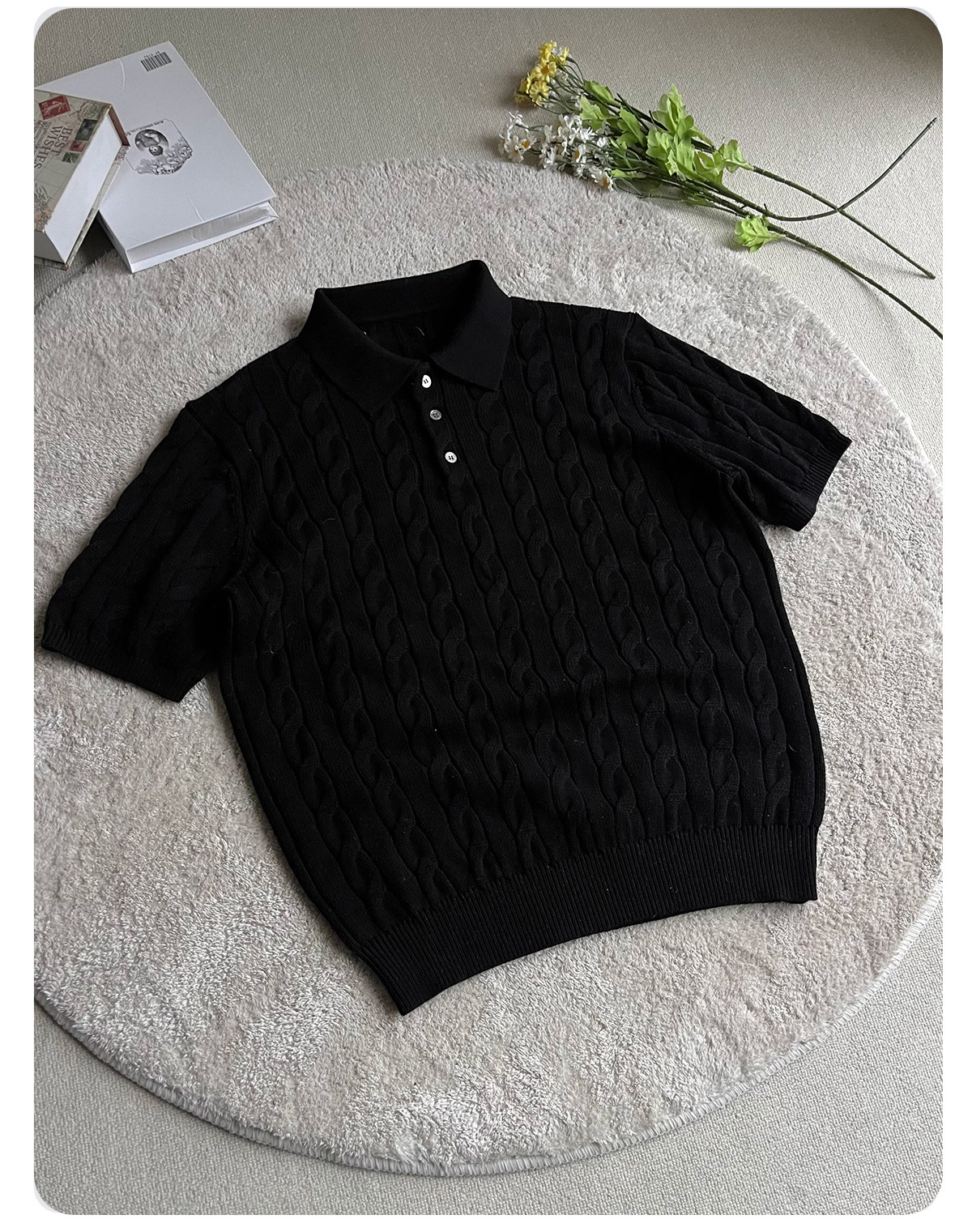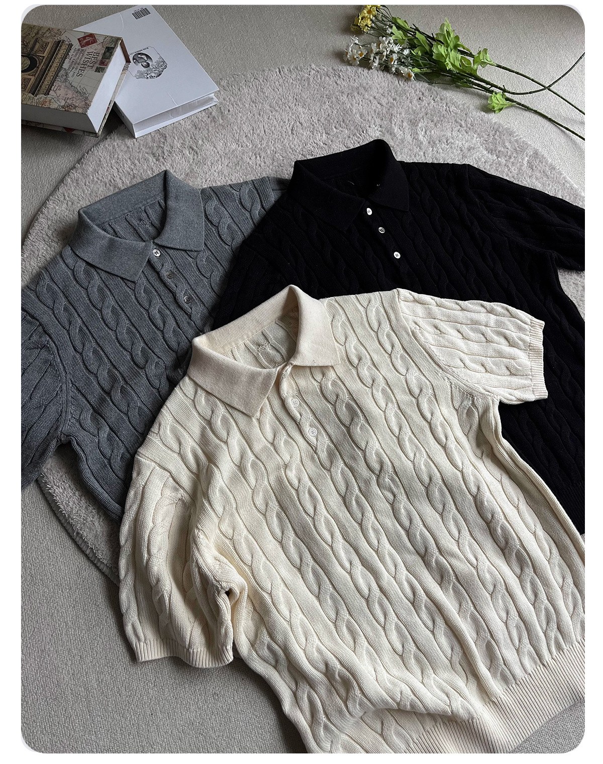 【CSMY】Xanvas 트위스트 폴로 콤비네이션 롱 스테이플 코튼 핏 오른쪽 어깨 반팔 니트 티셔츠 3가지 색상