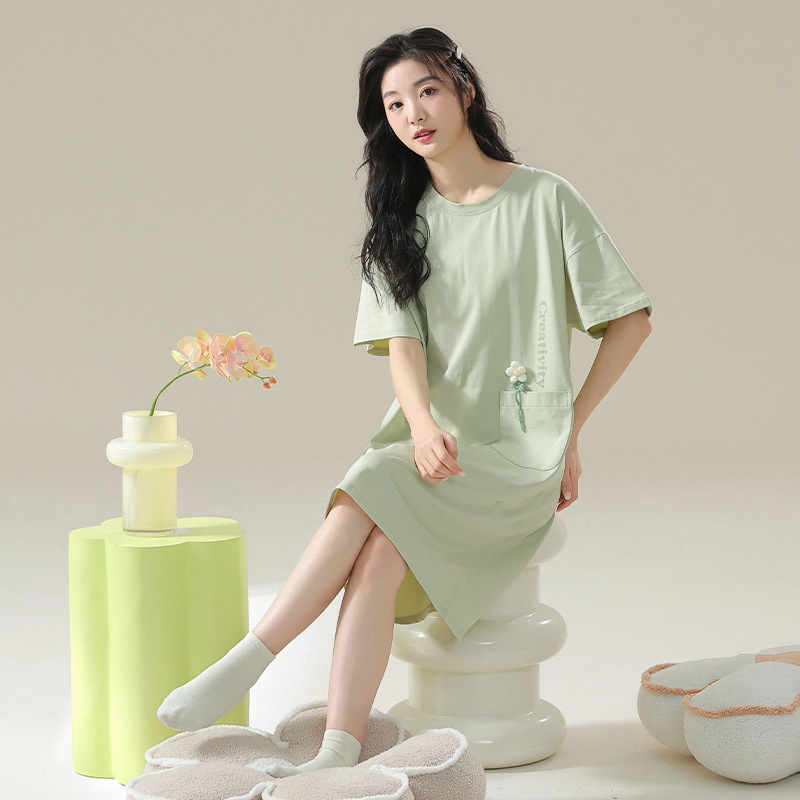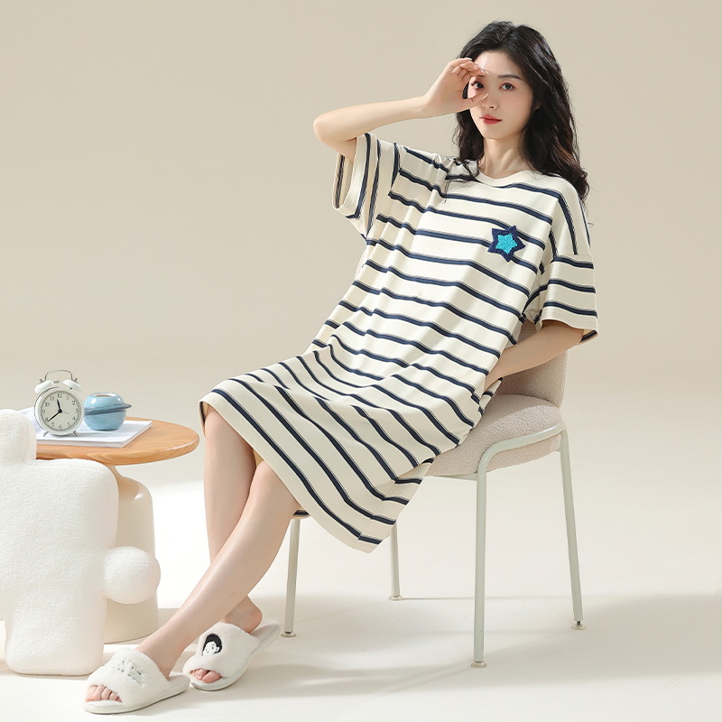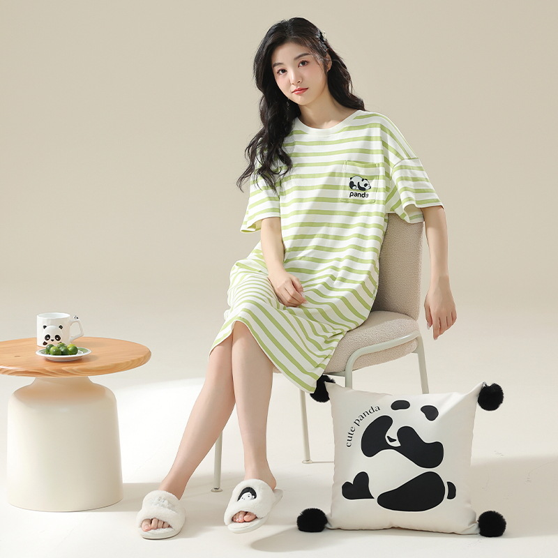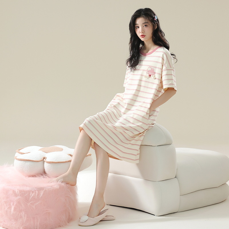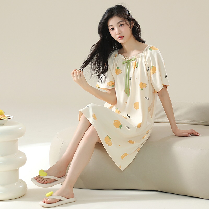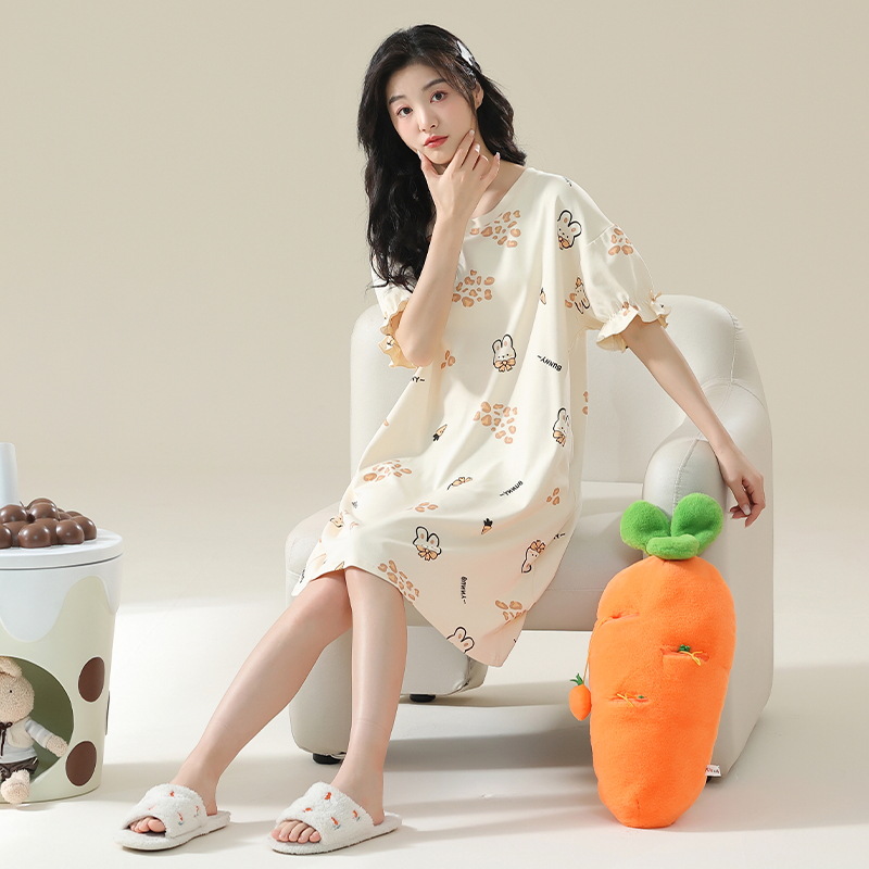 클래스 A 항균 순면 여성 잠옷 여성 여름 반팔 드레스 여성 중간 길이 달콤하고 귀여운 면 잠옷