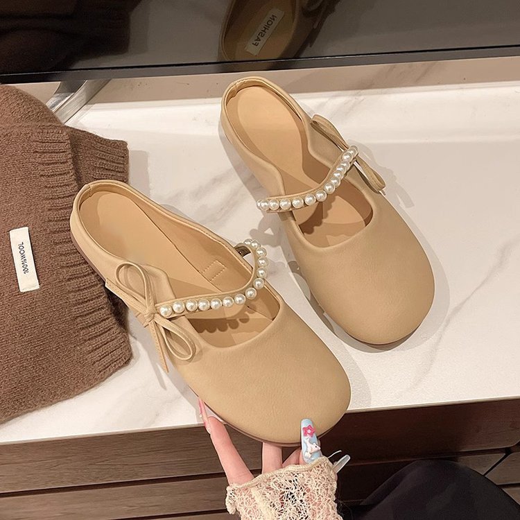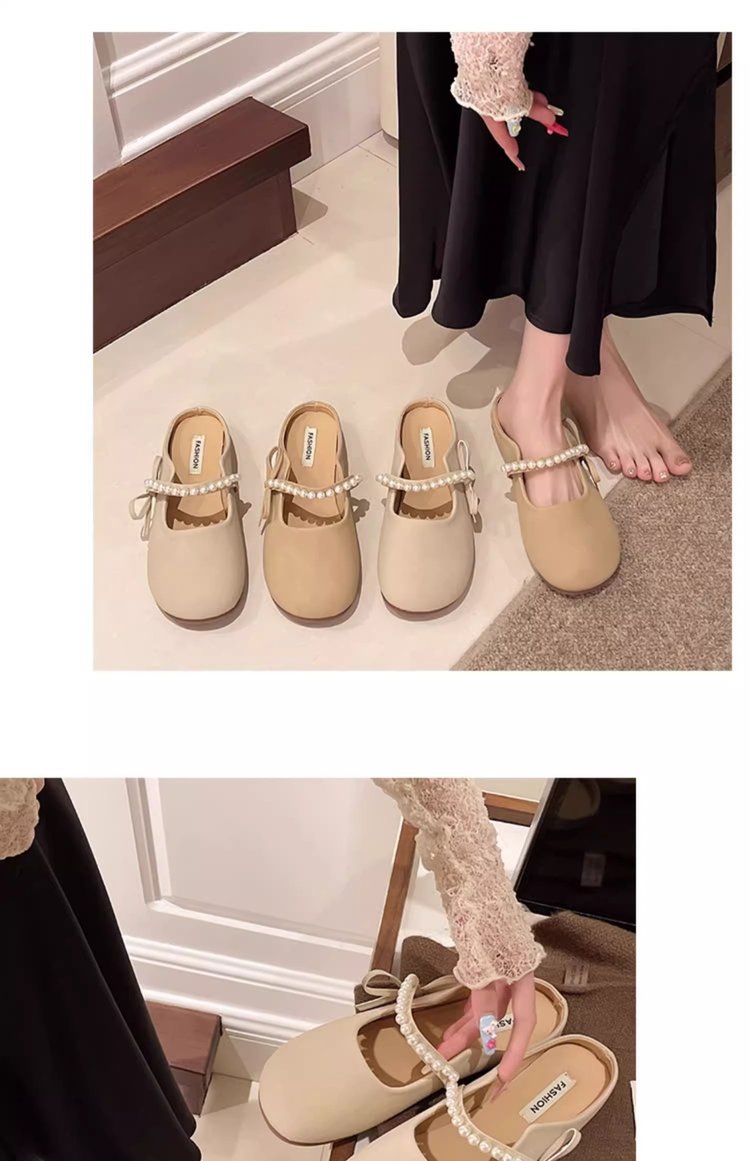 Baotou 하프 슬리퍼 여성 여름 아우터 캐주얼 올 매치 2025 뉴 스타일 펄 슬립 온 플랫 샌들 게으른 신발스토어 가기