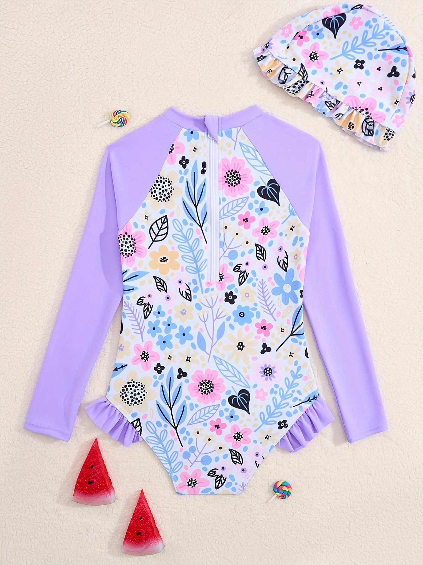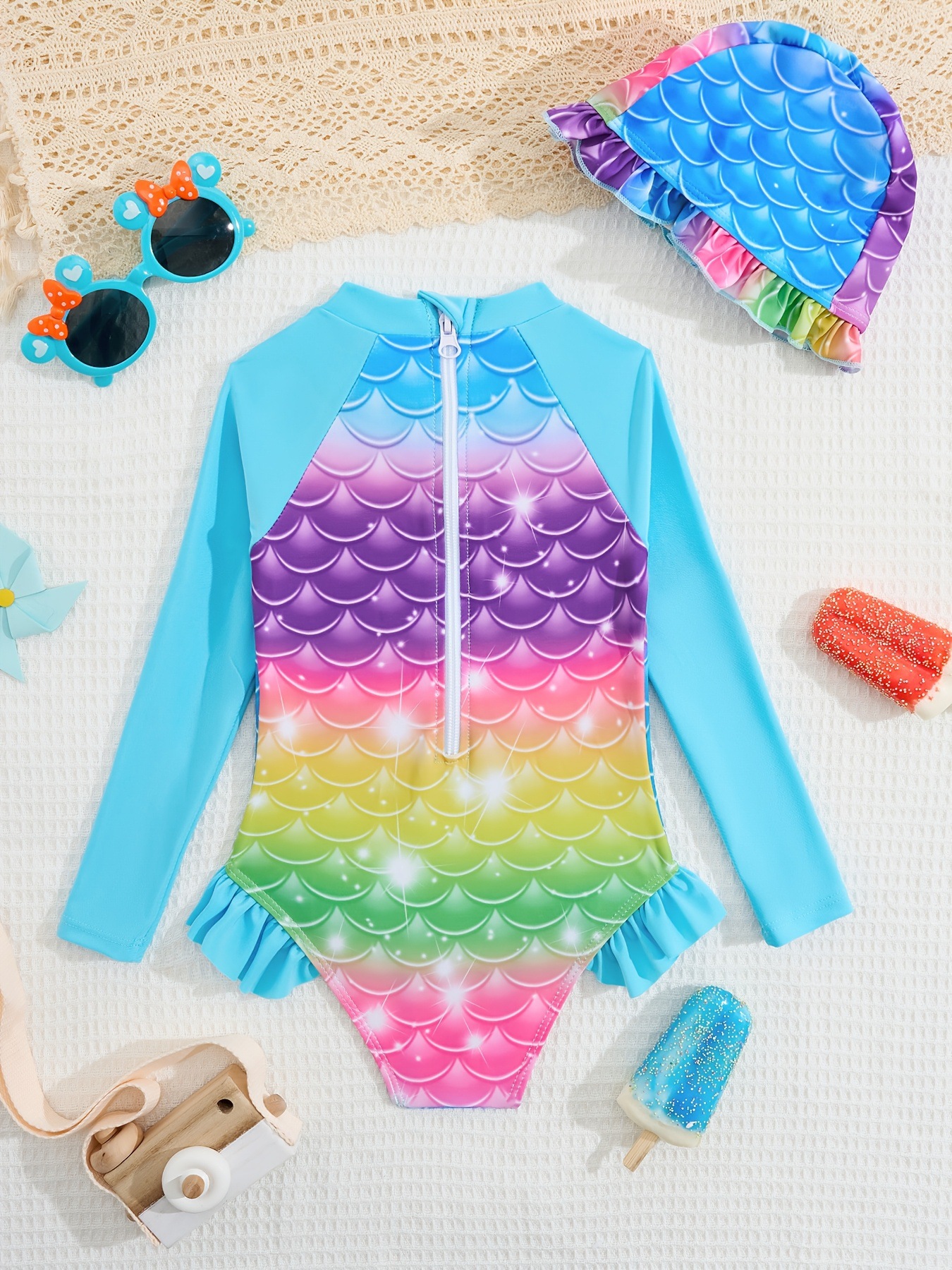 어린이 수영복 및 수영 모자 소녀 원피스 긴팔 수영복 중대형 2025 새로운 프릴 투피스 수영 세트