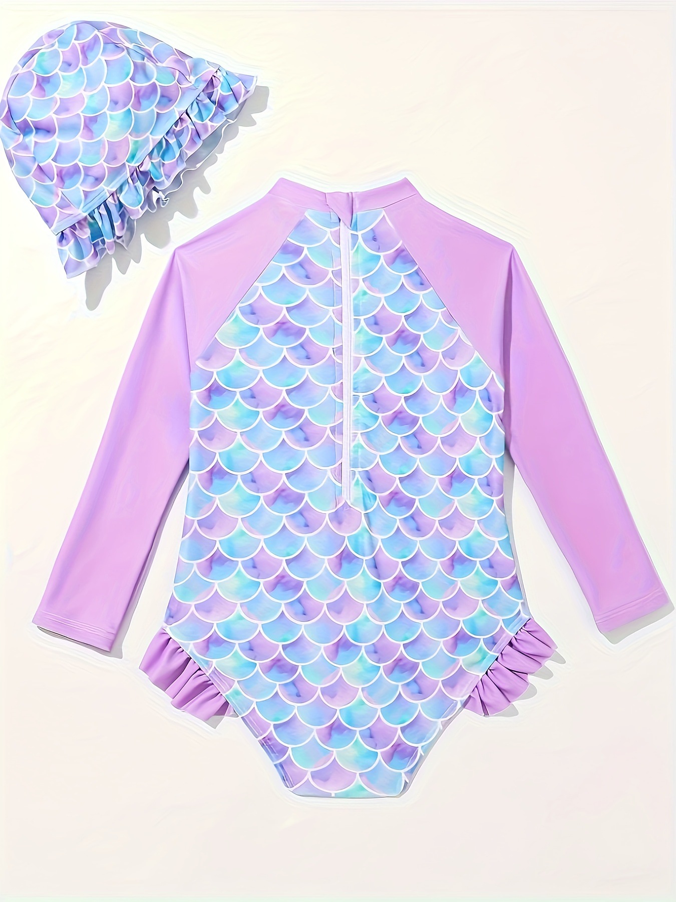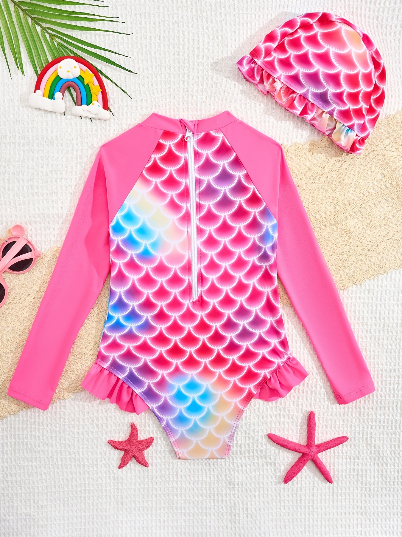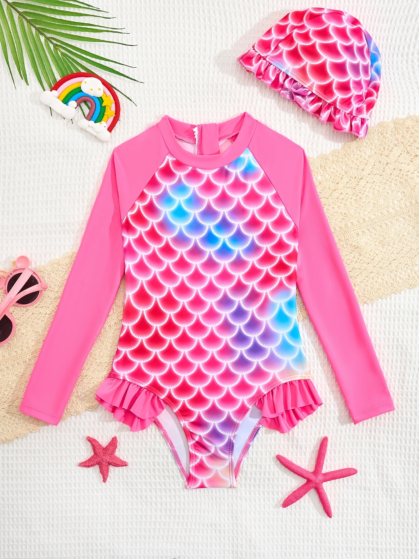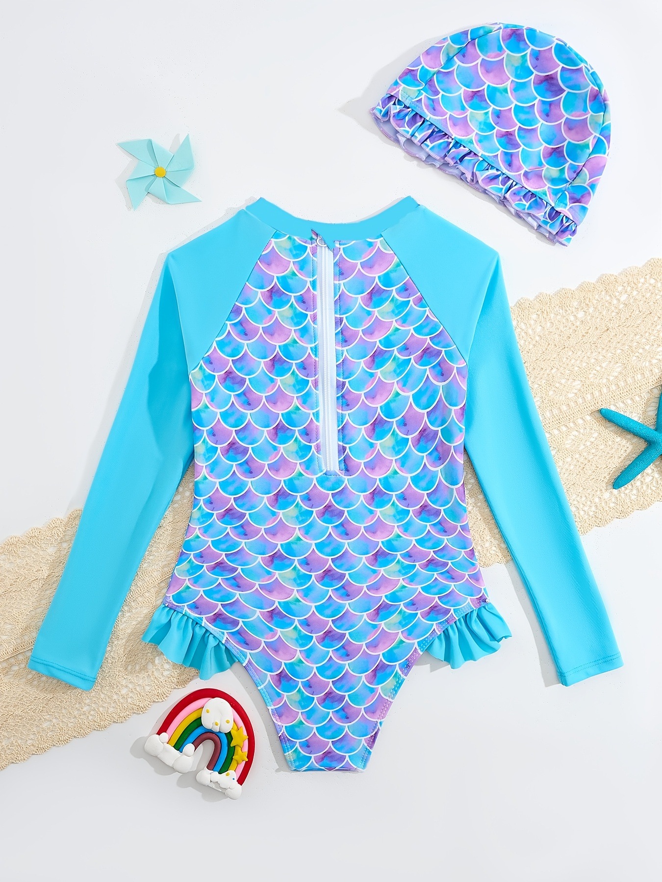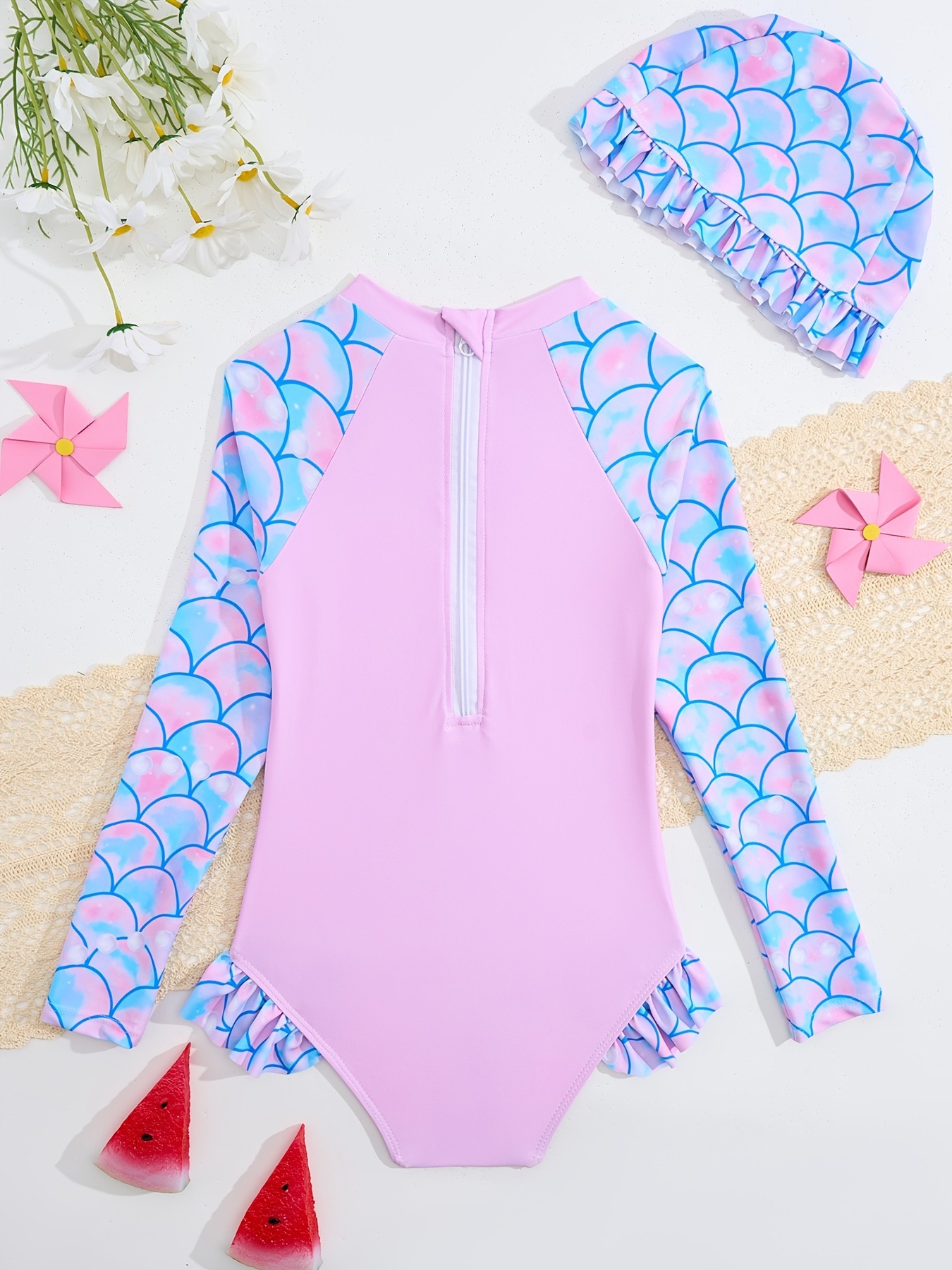 어린이 수영복 및 수영 모자 소녀 원피스 긴팔 수영복 중대형 2025 새로운 프릴 투피스 수영 세트스토어 가기
