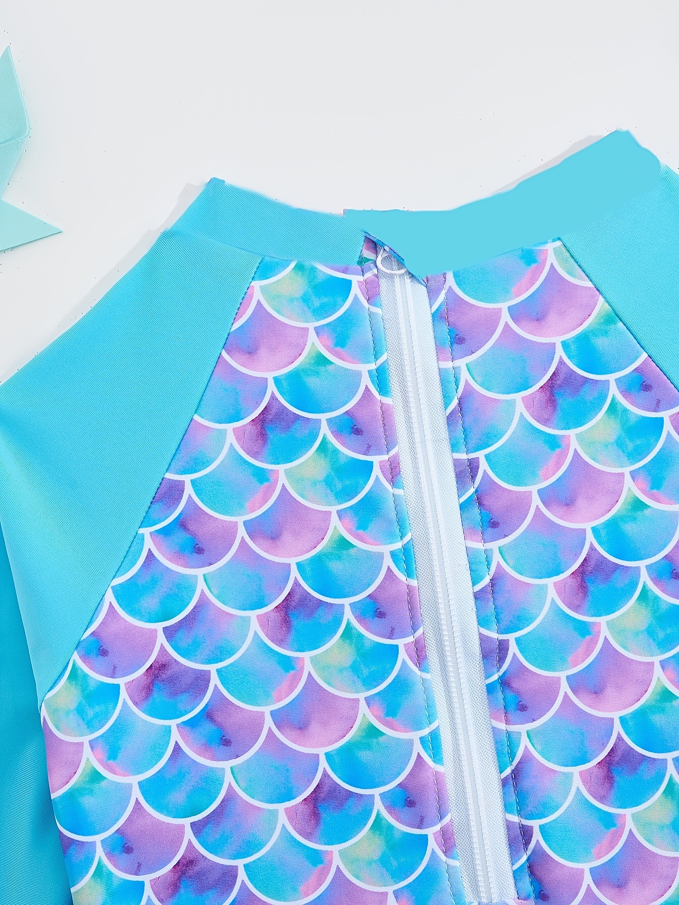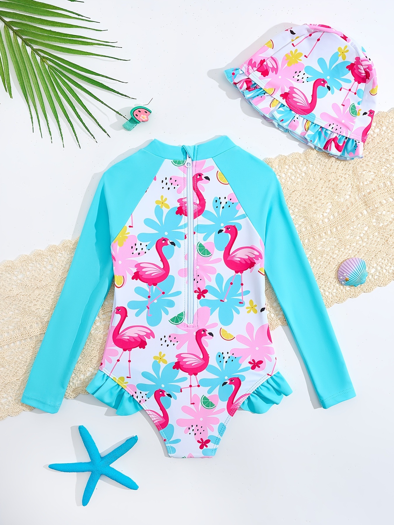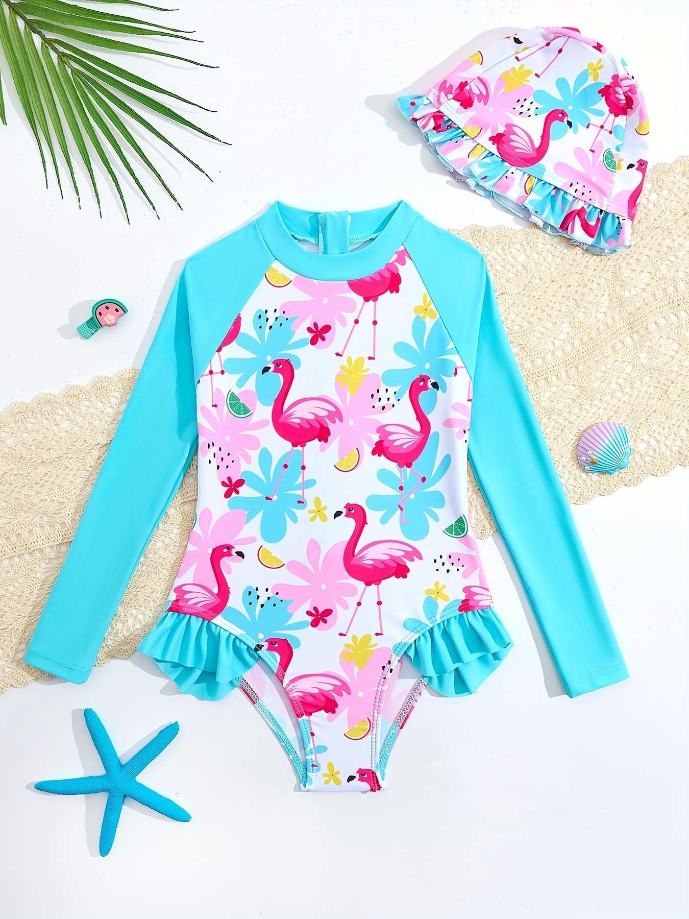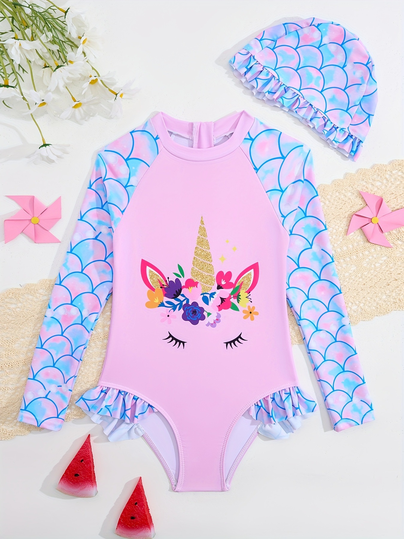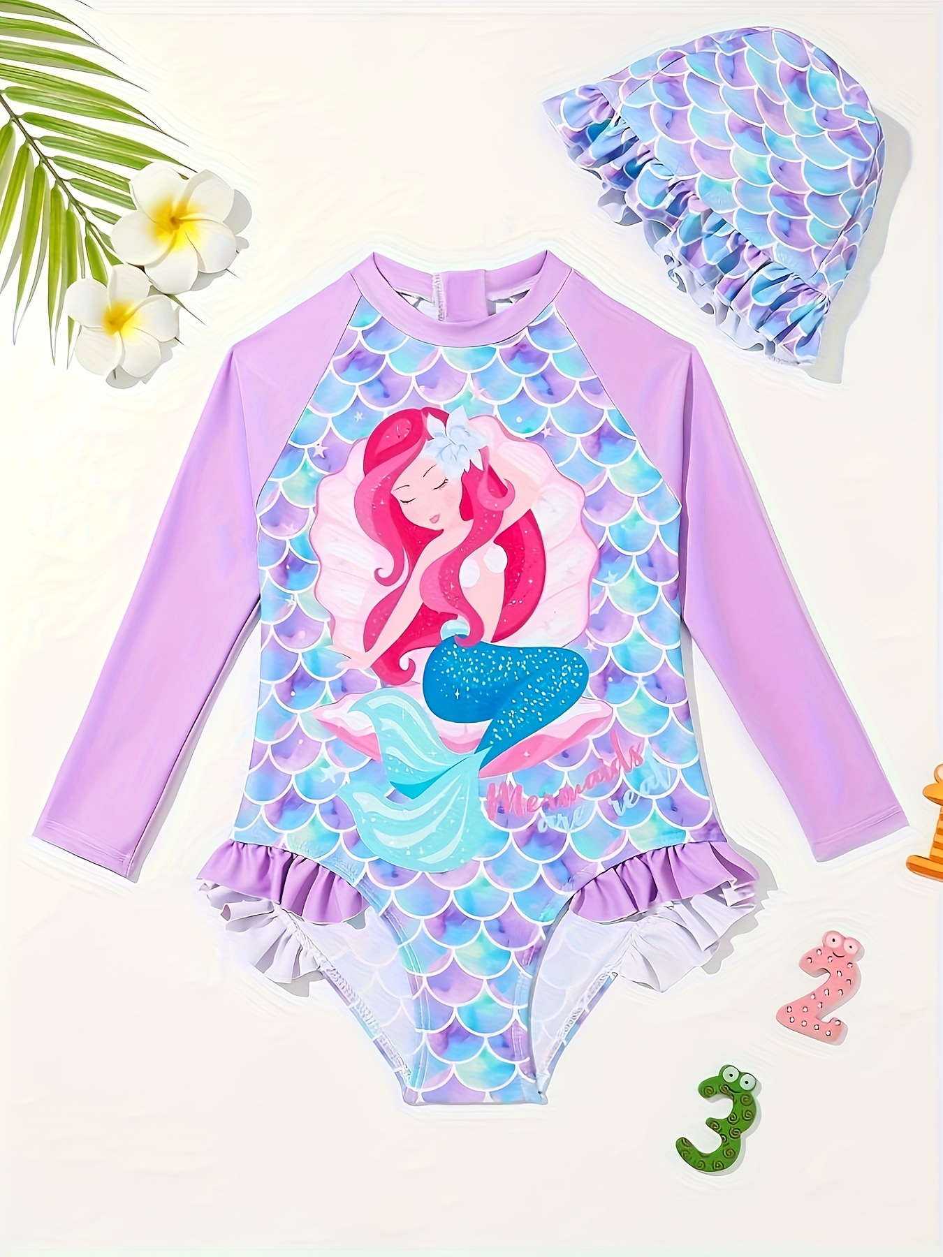 어린이 수영복 및 수영 모자 소녀 원피스 긴팔 수영복 중대형 2025 새로운 프릴 투피스 수영 세트스토어 가기