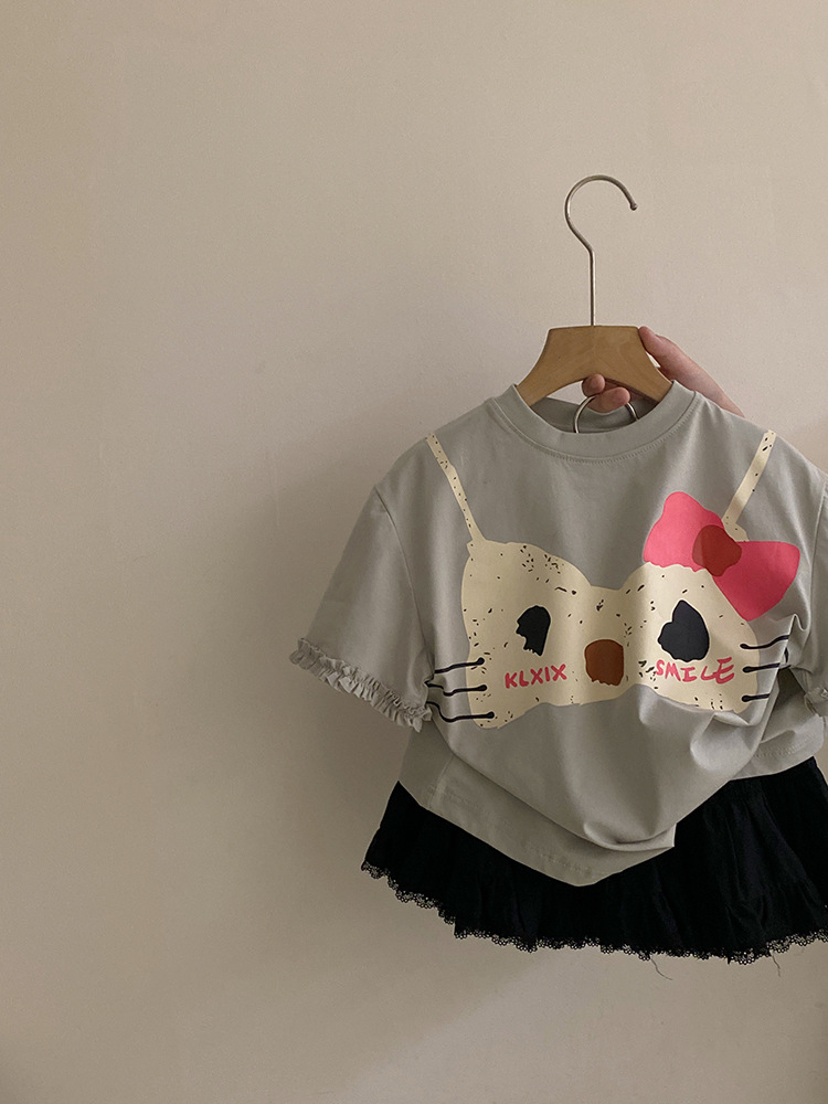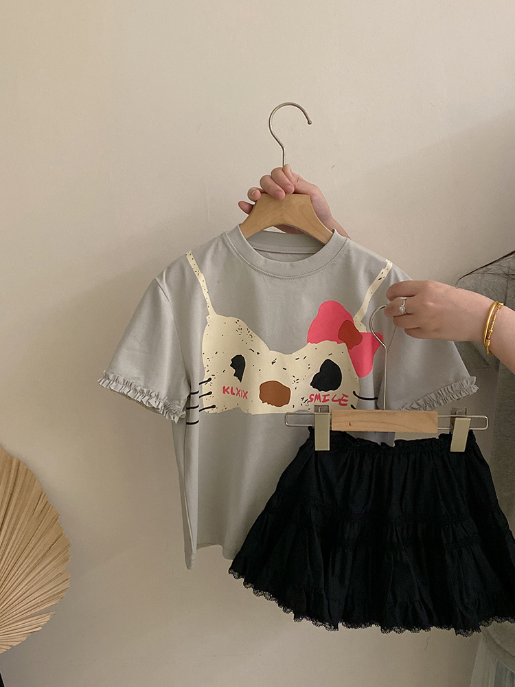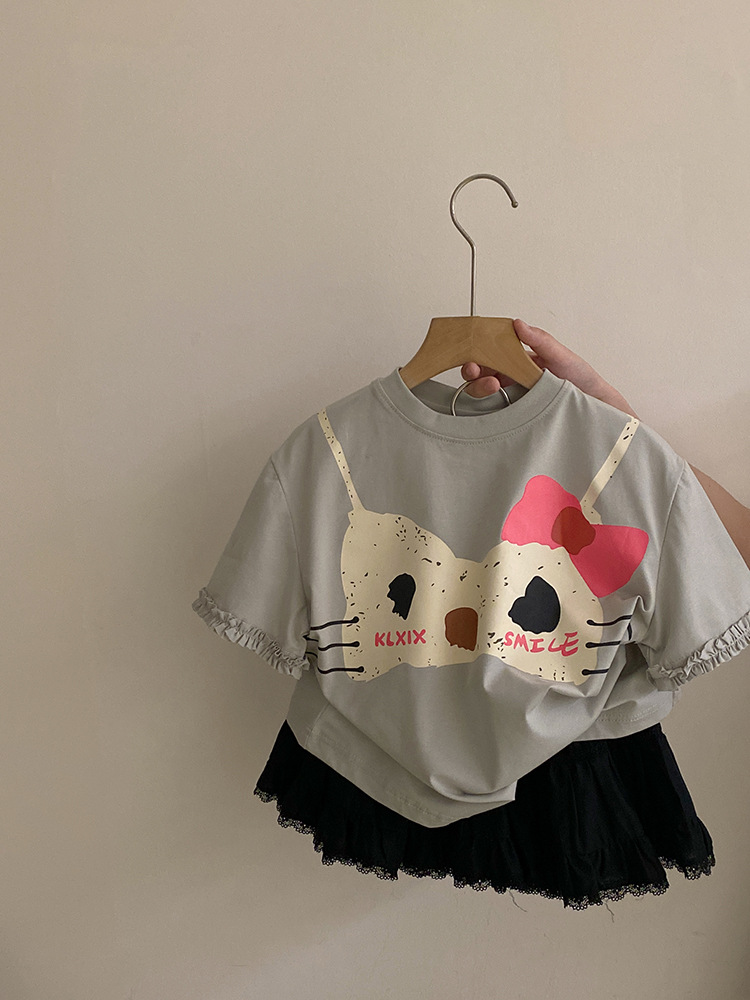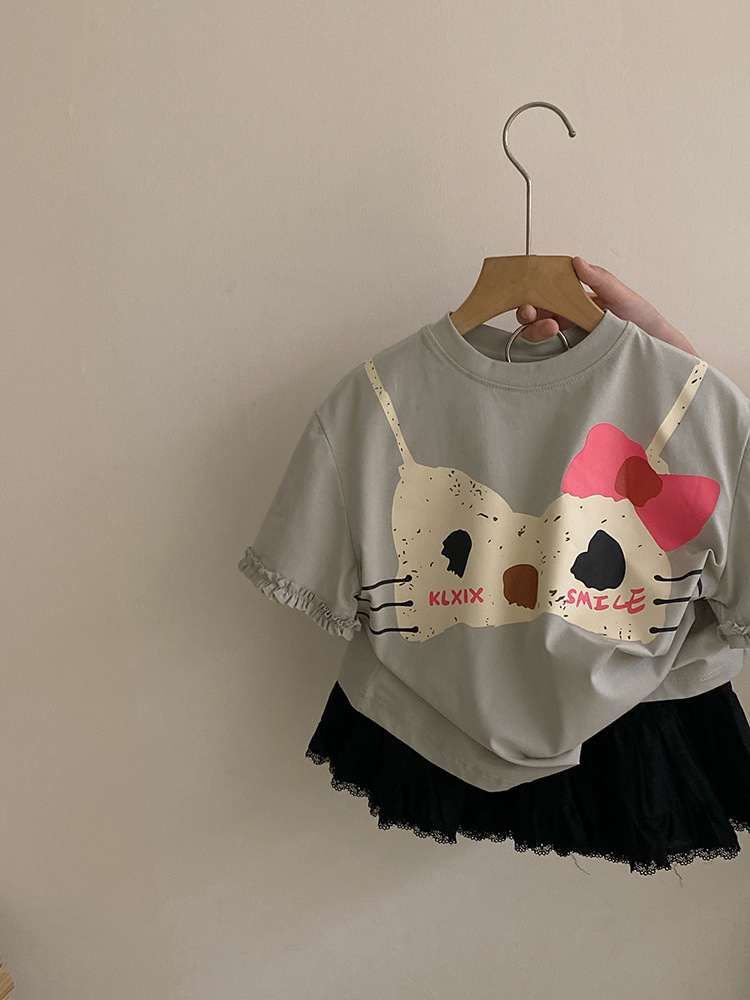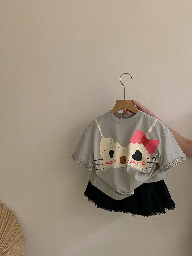 한국 스타일 소녀 디자인 센스 만화 야옹 미 반팔 티셔츠 2025 여름 새로운 올 매치 레이스 스커트 투피스 세트스토어 가기