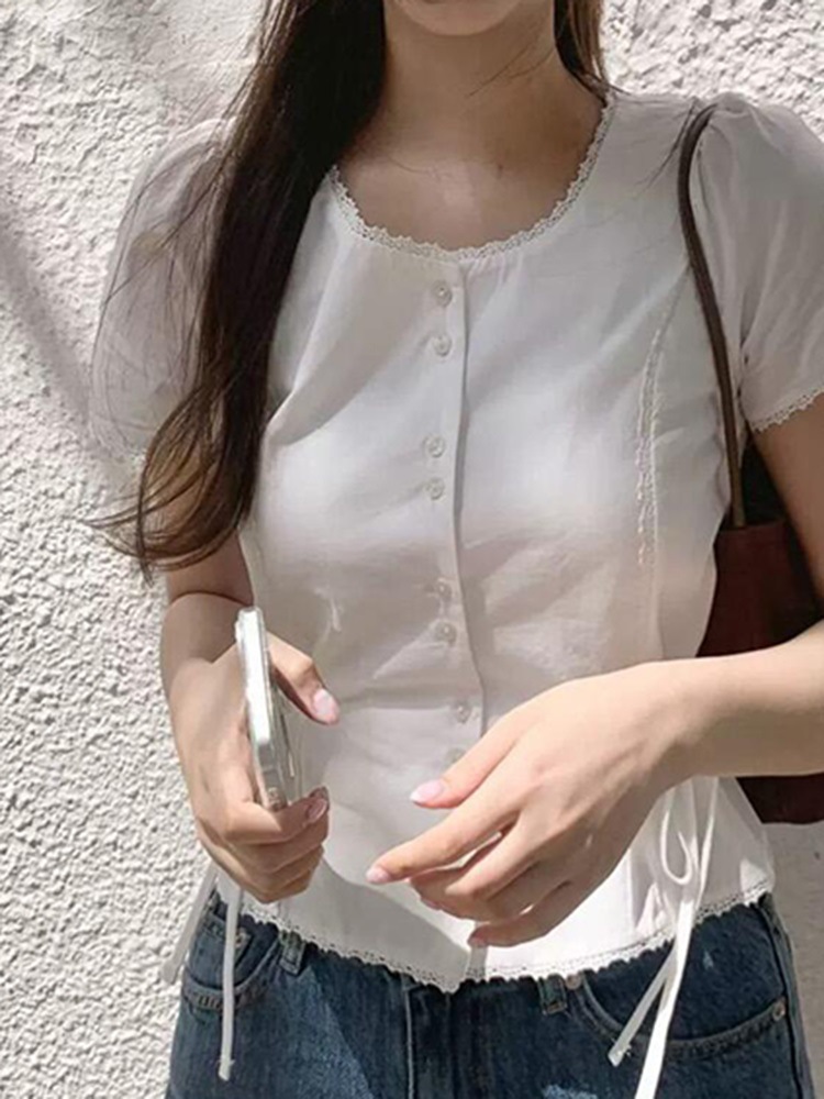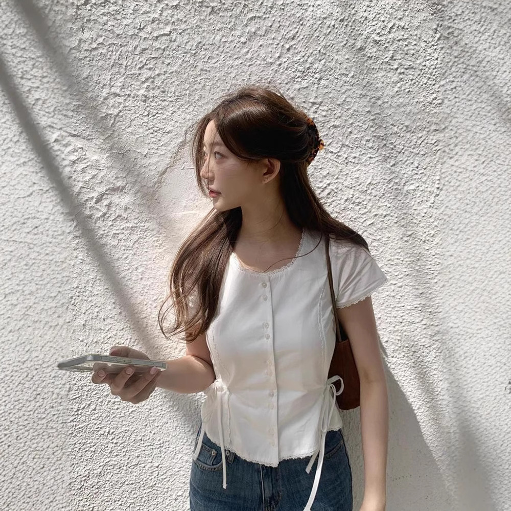 Now H 솔리드 컬러 레이스 반팔 허리 여성 셔츠 2025 여름 한국 스타일 동대문 디자인 탑