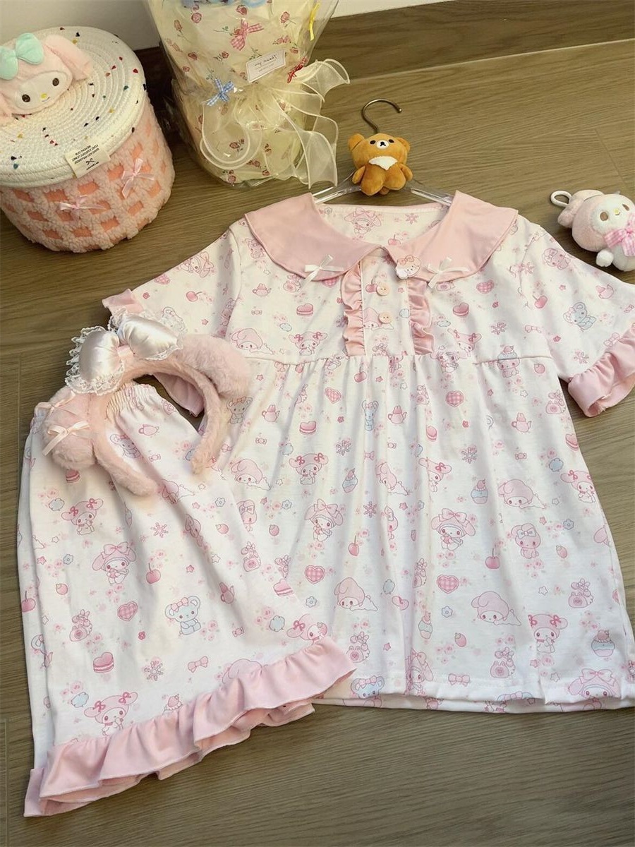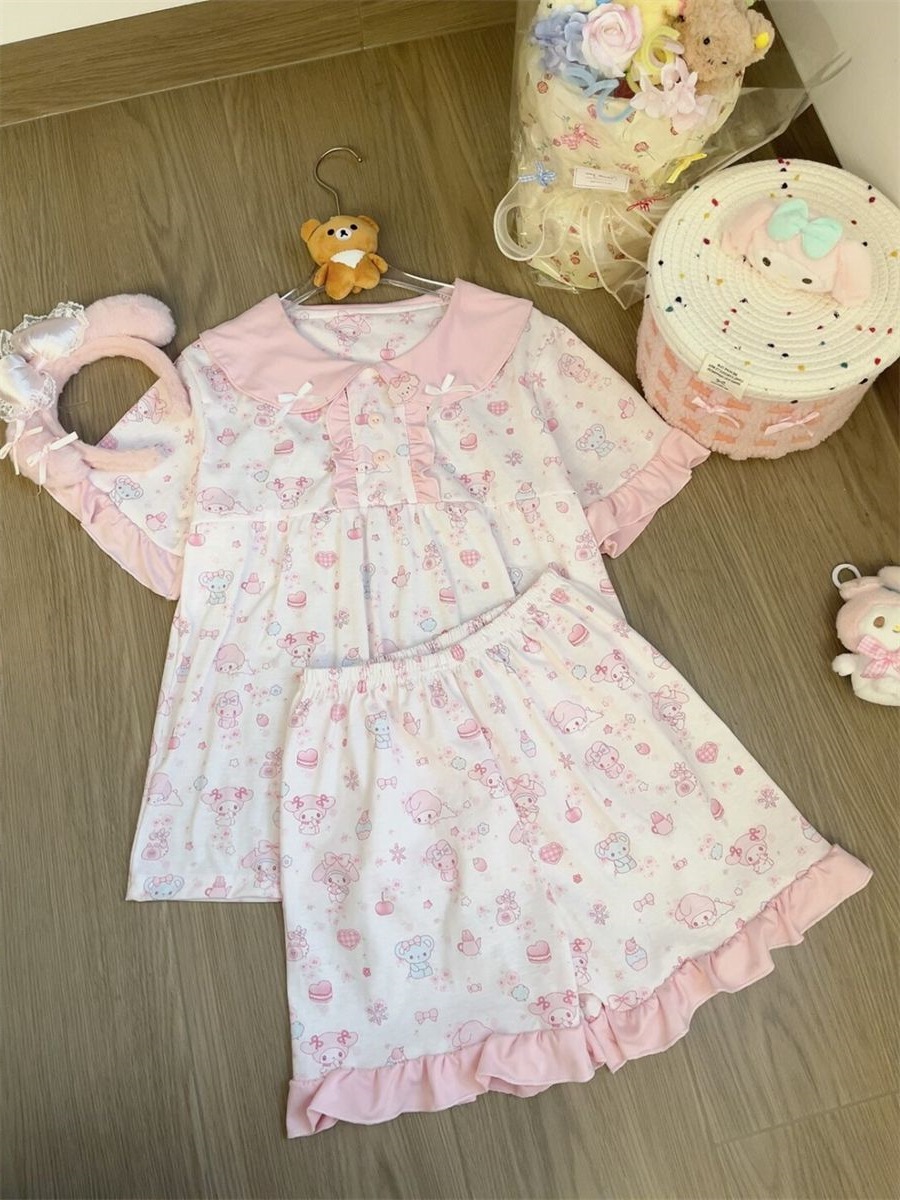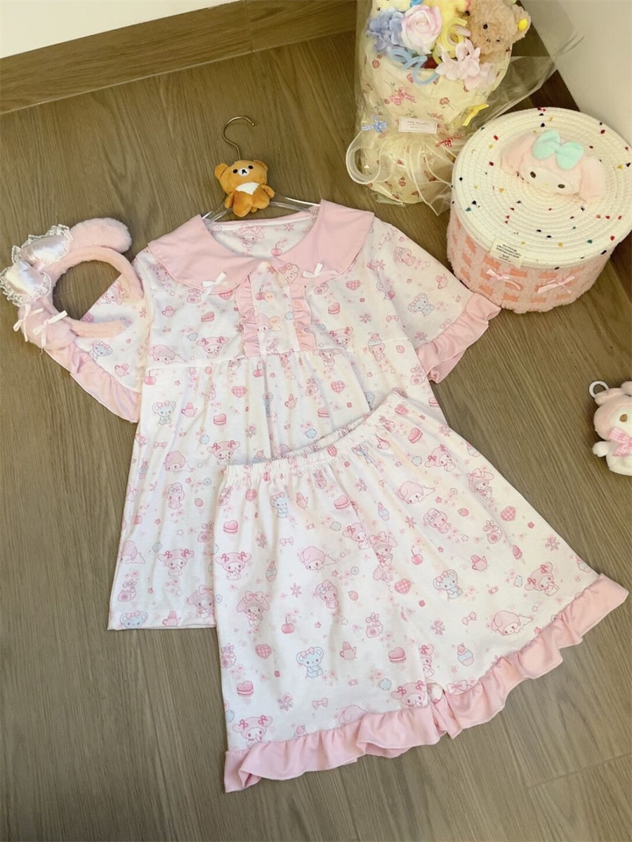 만화 귀여운 인형 칼라 Merleti 파자마 여성의 새로운 반팔 반바지 여름 한국 스타일 홈 의류 세트 외부 착용스토어 가기