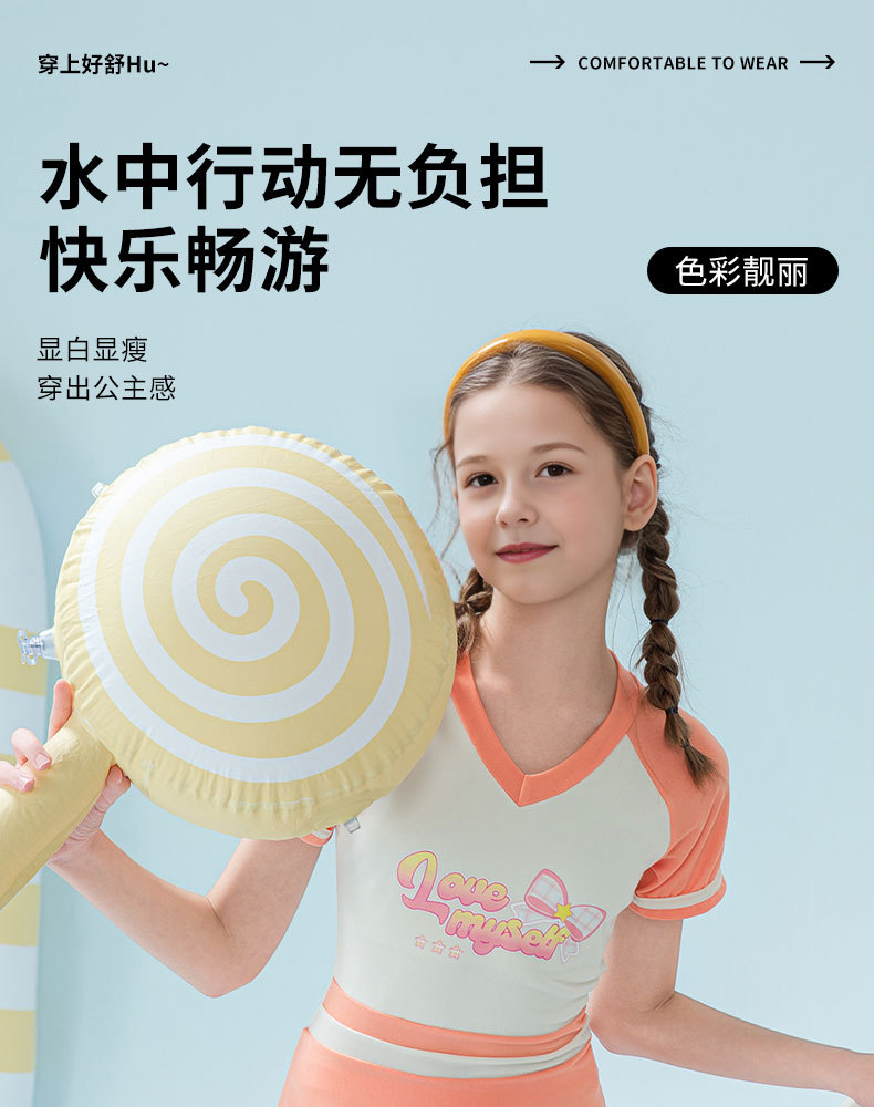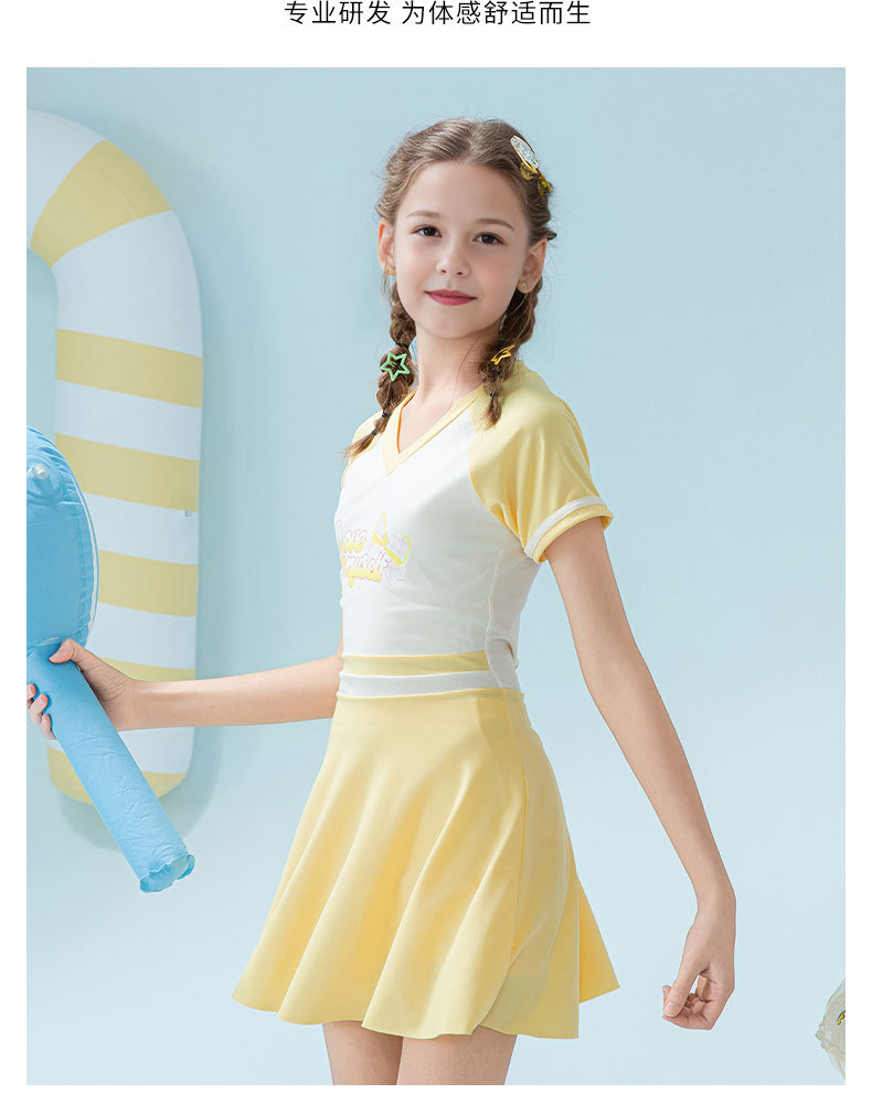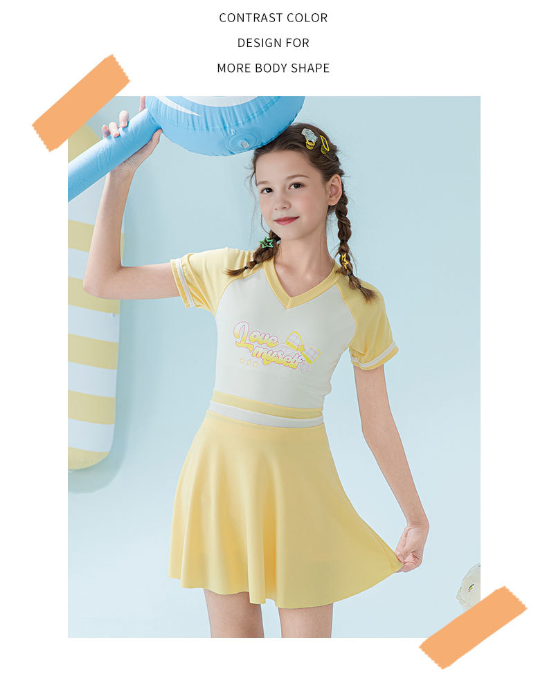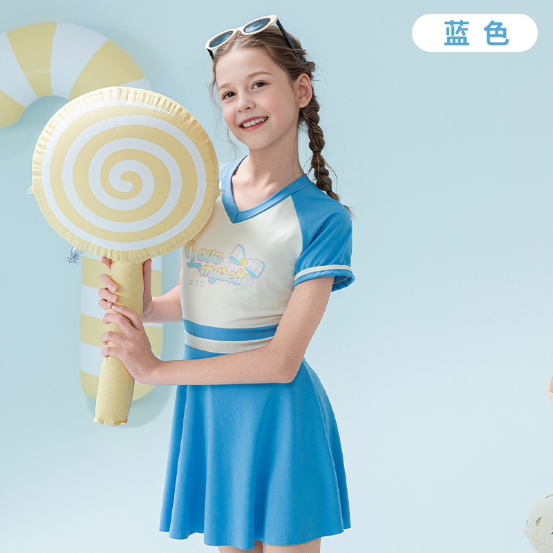 2025 새로운 어린이 수영복 유행 소녀 컬러 블록 스포츠 원피스 짧은 치마 소녀 가슴 패드 보수적 인 수영복