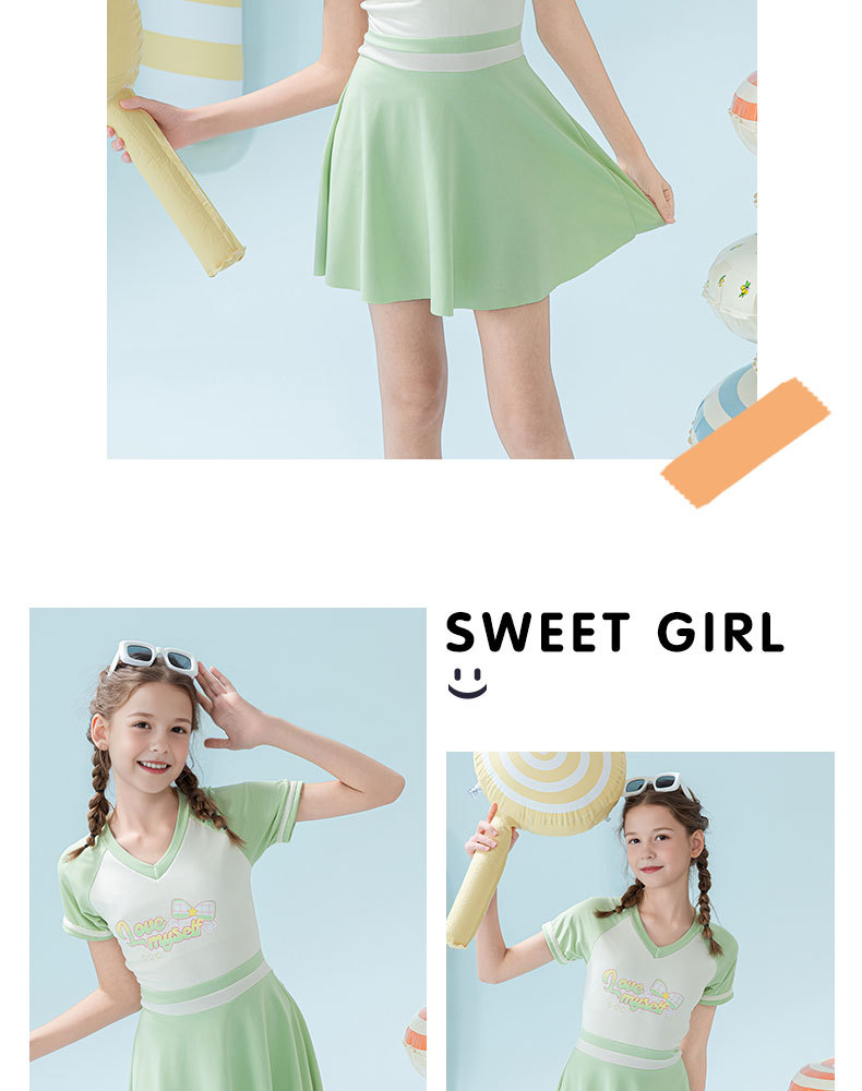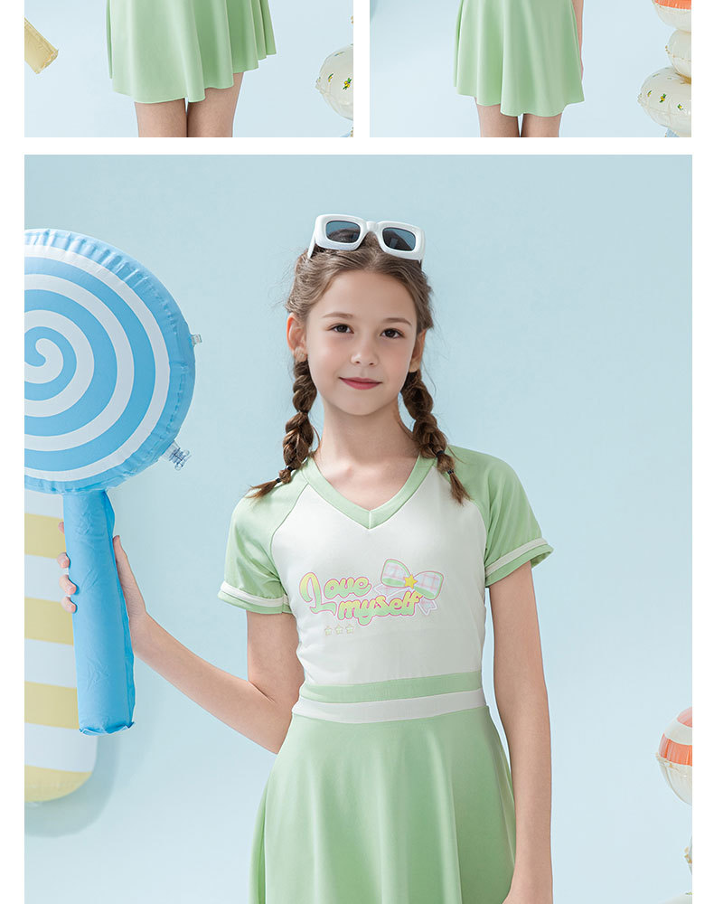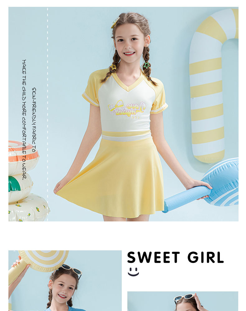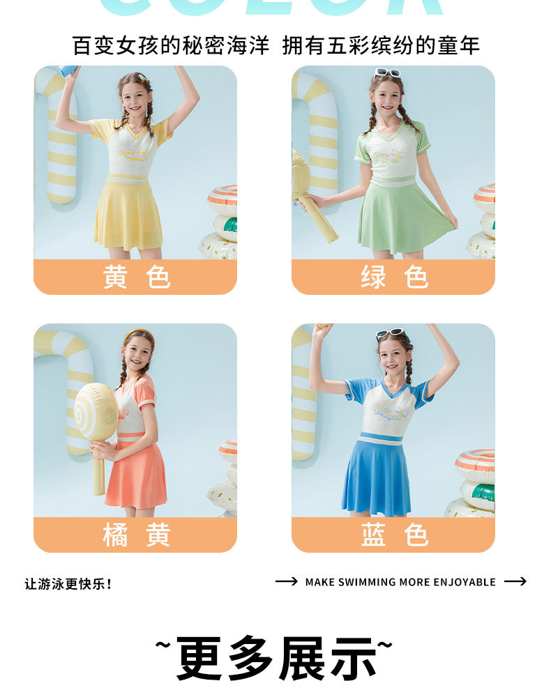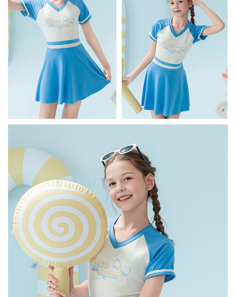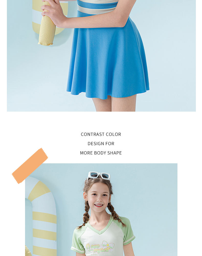2025 새로운 어린이 수영복 유행 소녀 컬러 블록 스포츠 원피스 짧은 치마 소녀 가슴 패드 보수적 인 수영복스토어 가기