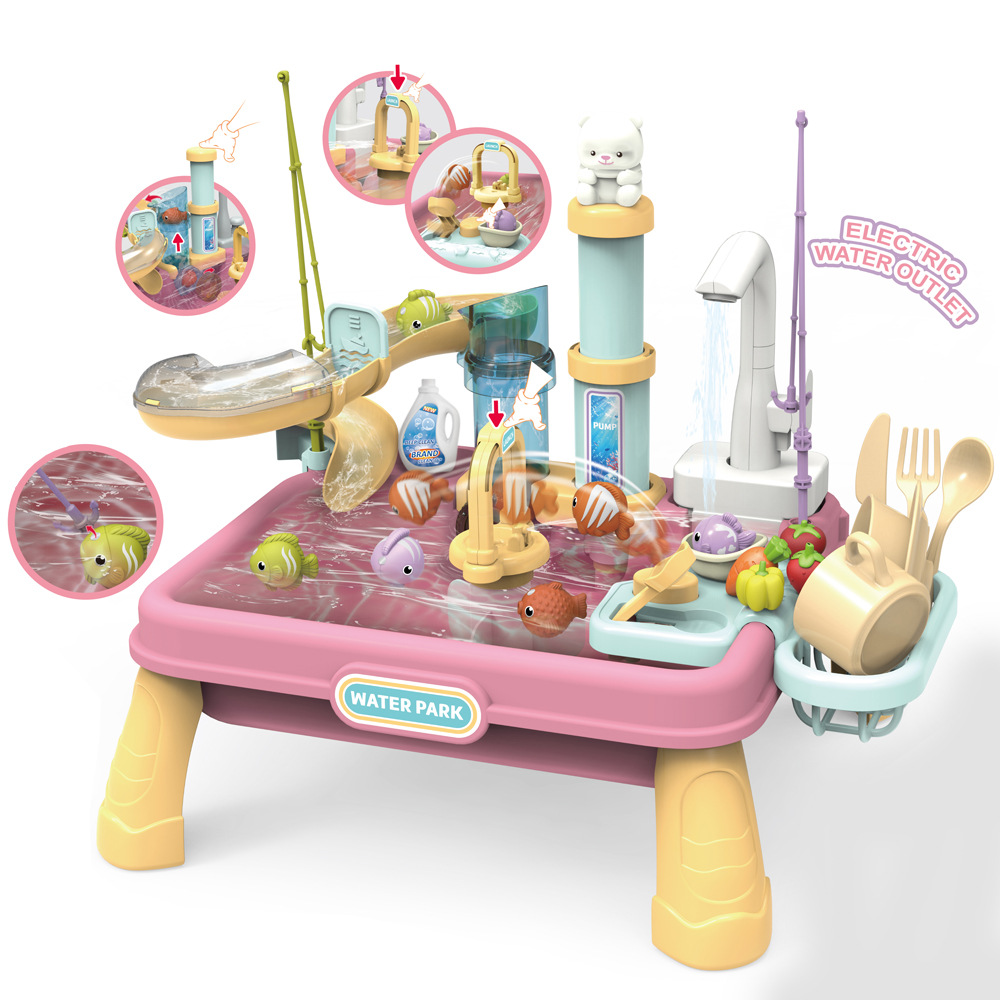 국경 간 놀이 집 어린이 전기 수압 리프팅 식기 세척기 주방 세척 분지 세트 낚시 물 놀이 장난감