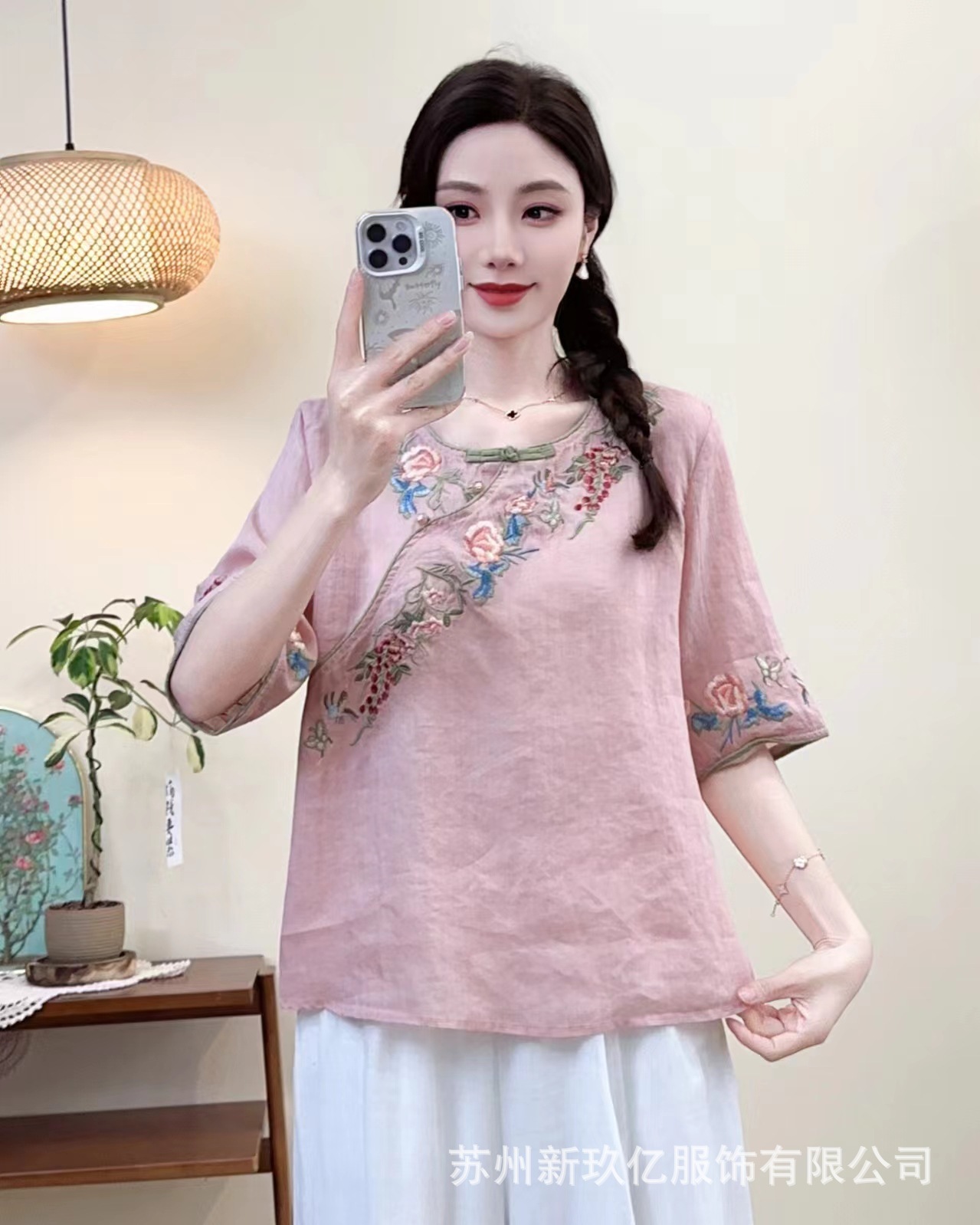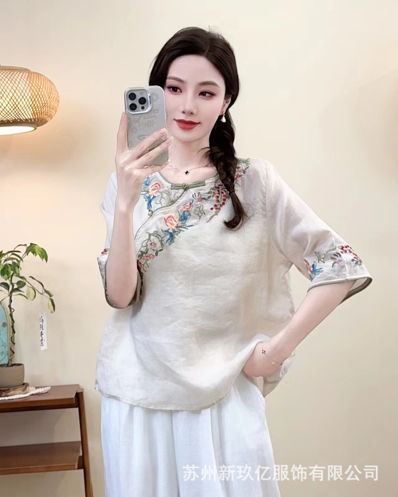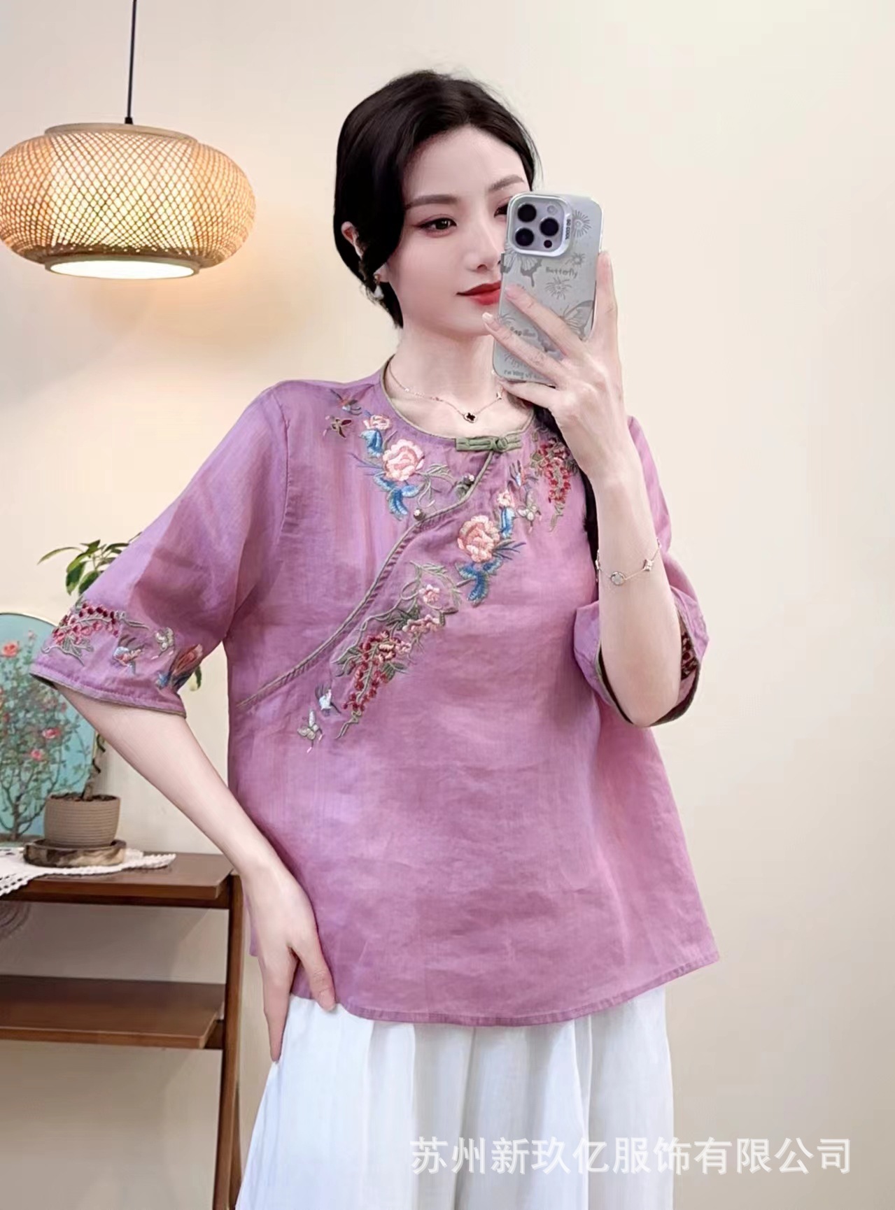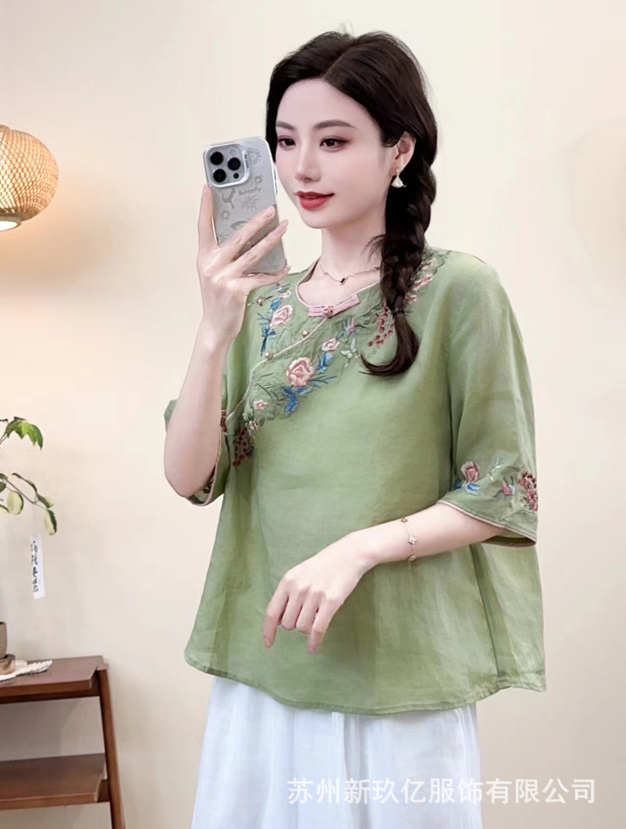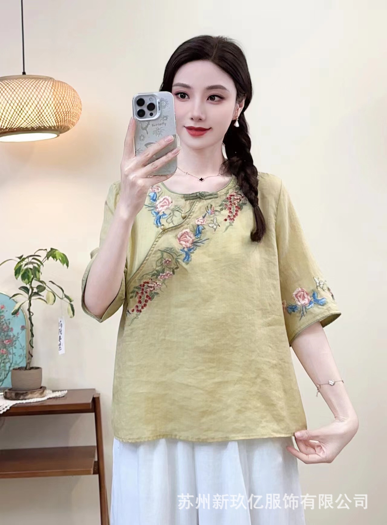2025 년 여름 새로운 라미 라운드 넥 터틀넥 티셔츠 예술적 복고풍 자수 짧은 반소매 셔츠 탑