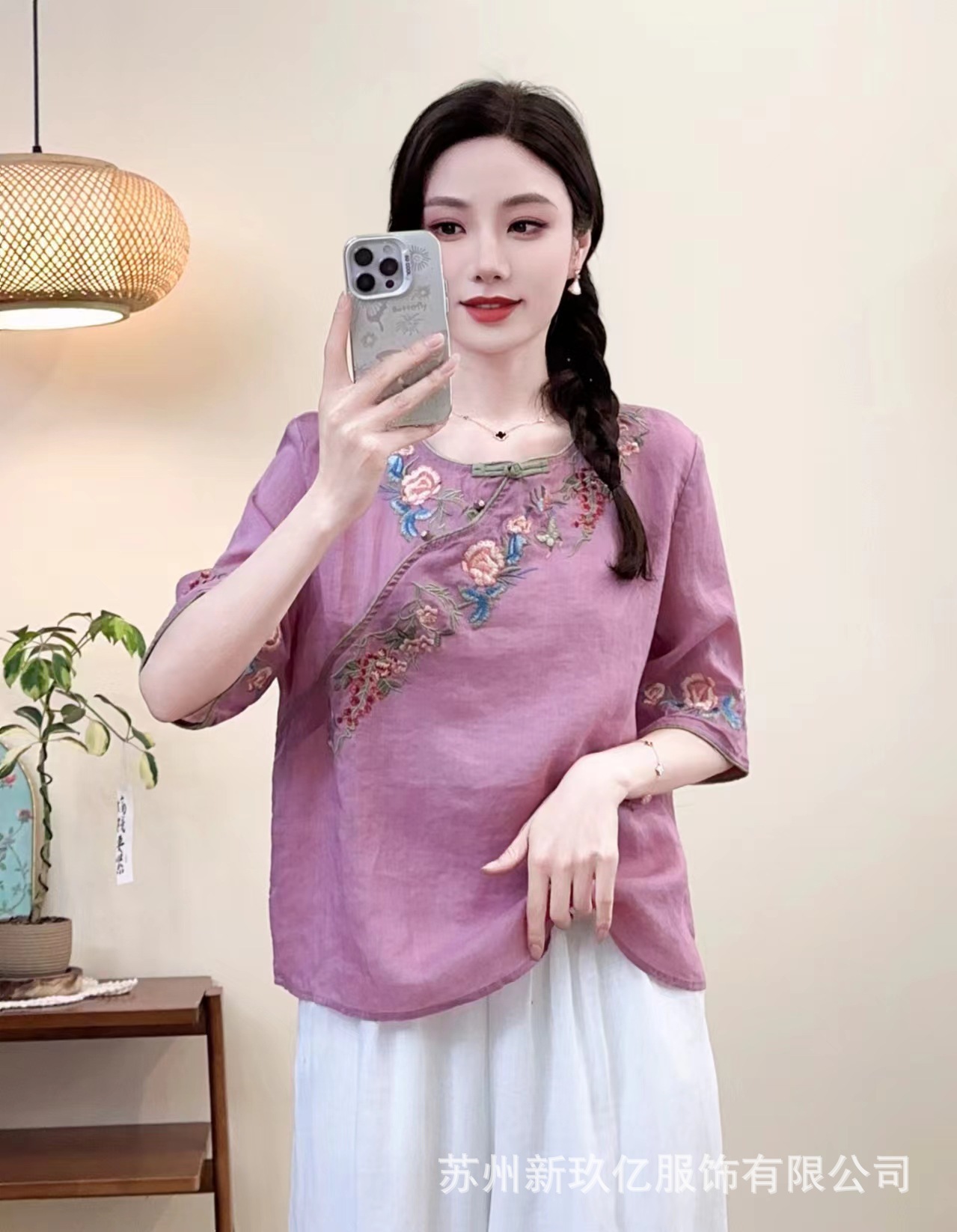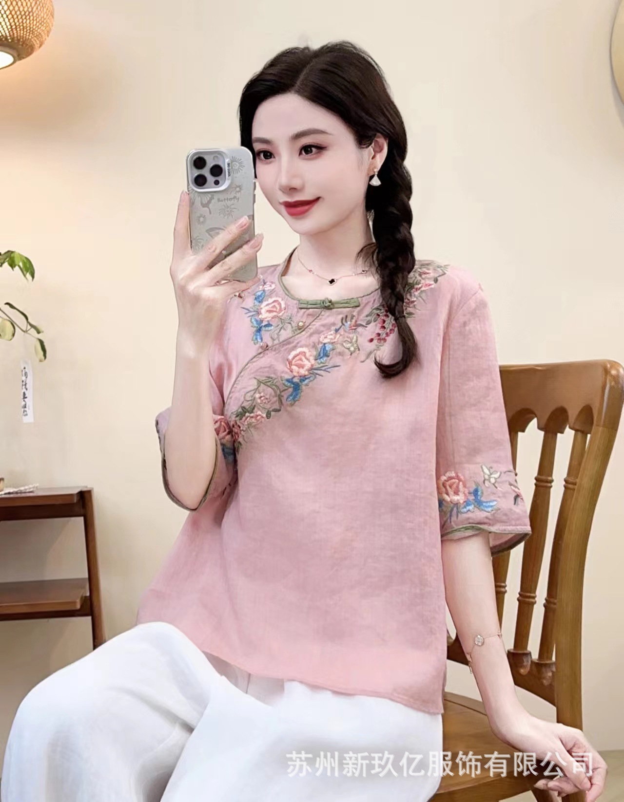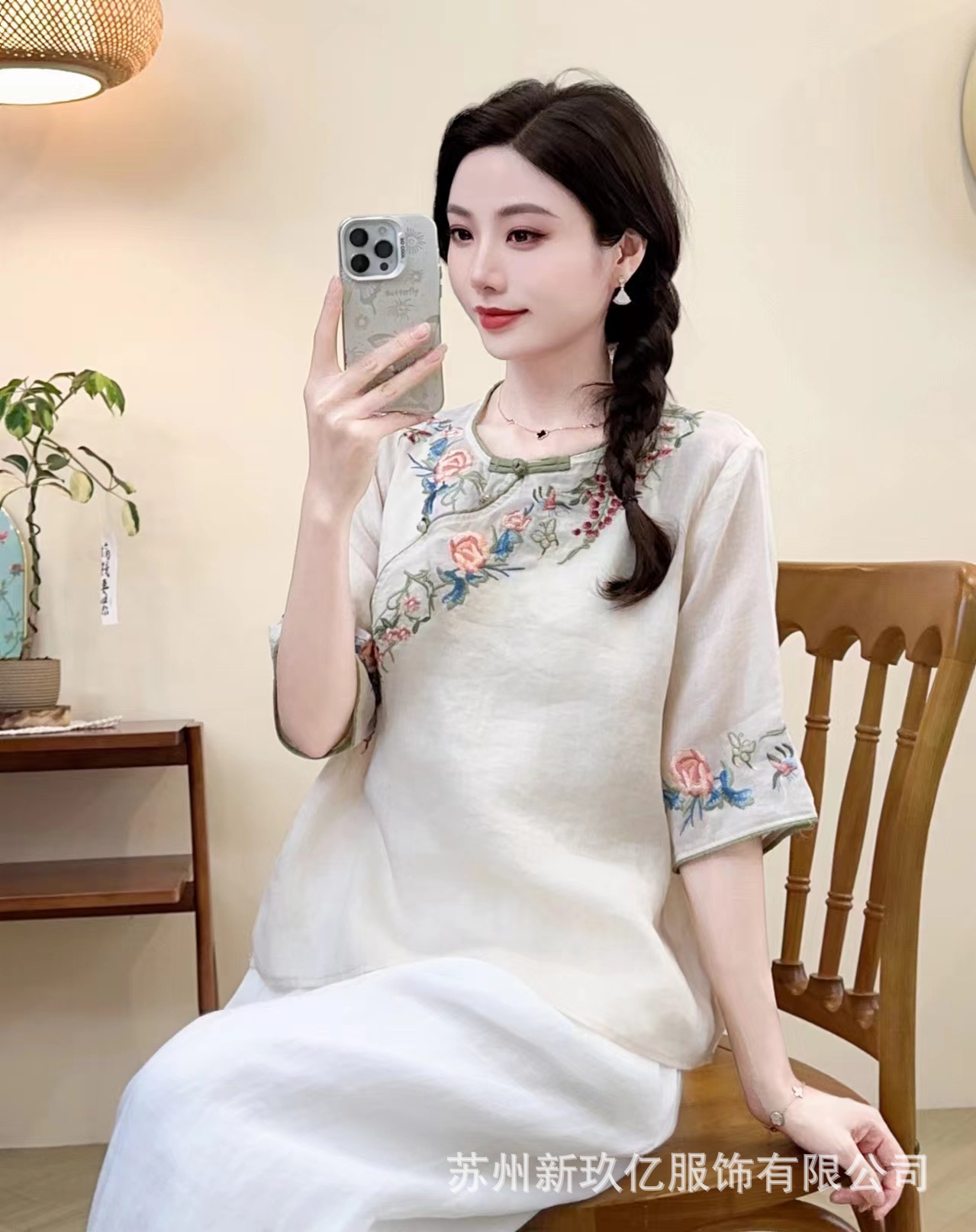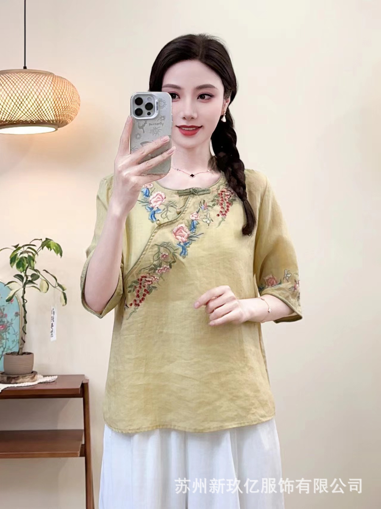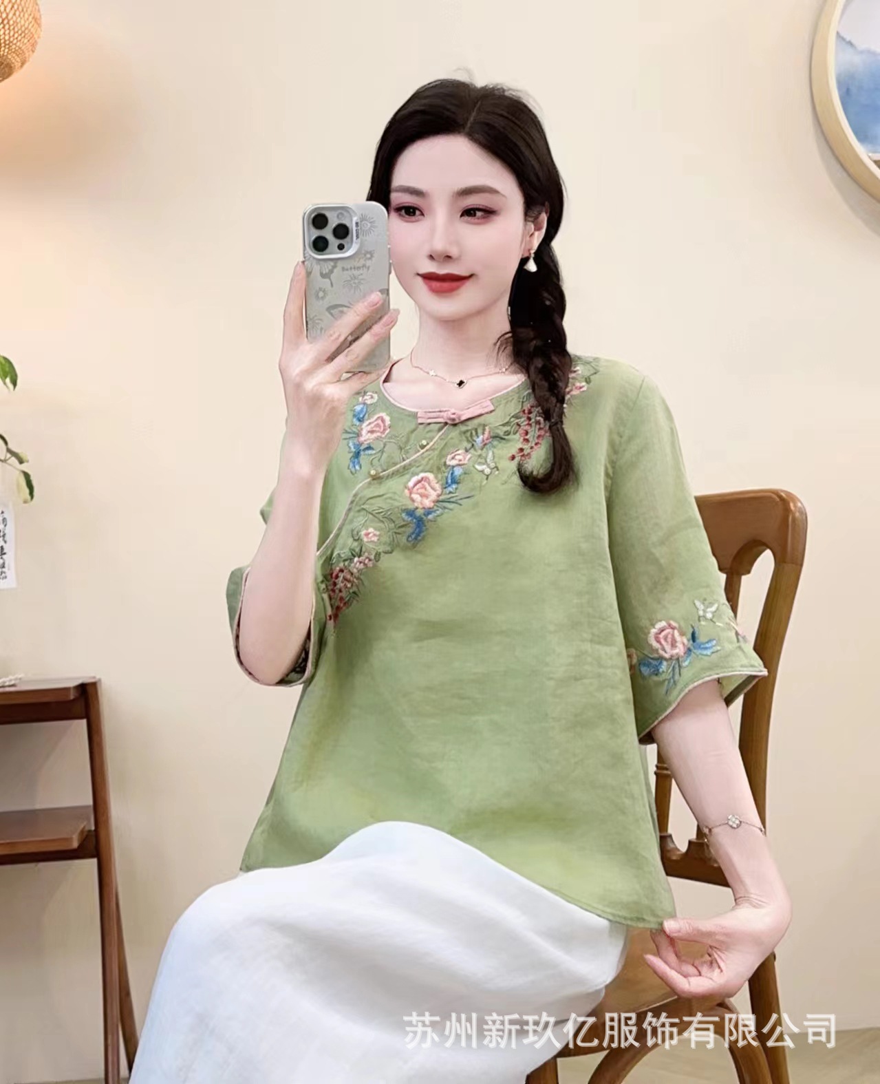 2025 년 여름 새로운 라미 라운드 넥 터틀넥 티셔츠 예술적 복고풍 자수 짧은 반소매 셔츠 탑