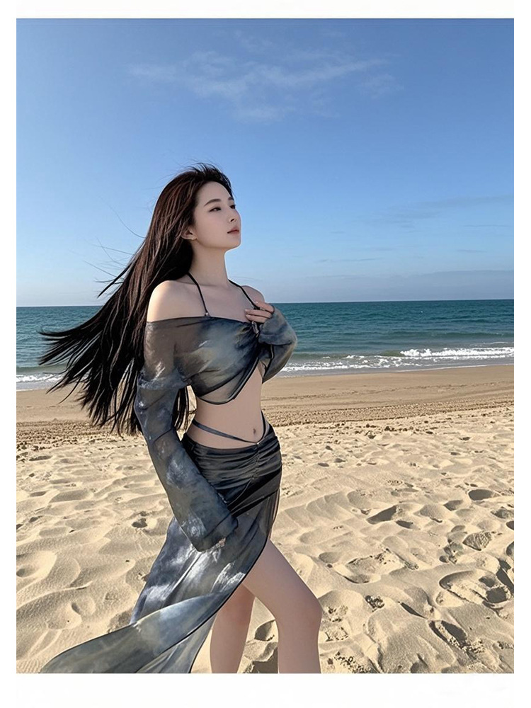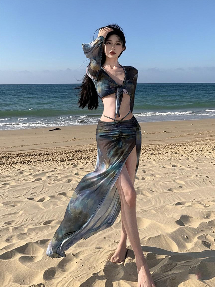 비키니 수영복 여성용 긴 소매 긴 원피스 분할 4 피스 세트 패션 타이-염료 태양-보호 및 고기 커버 섹시한 온천 수영복