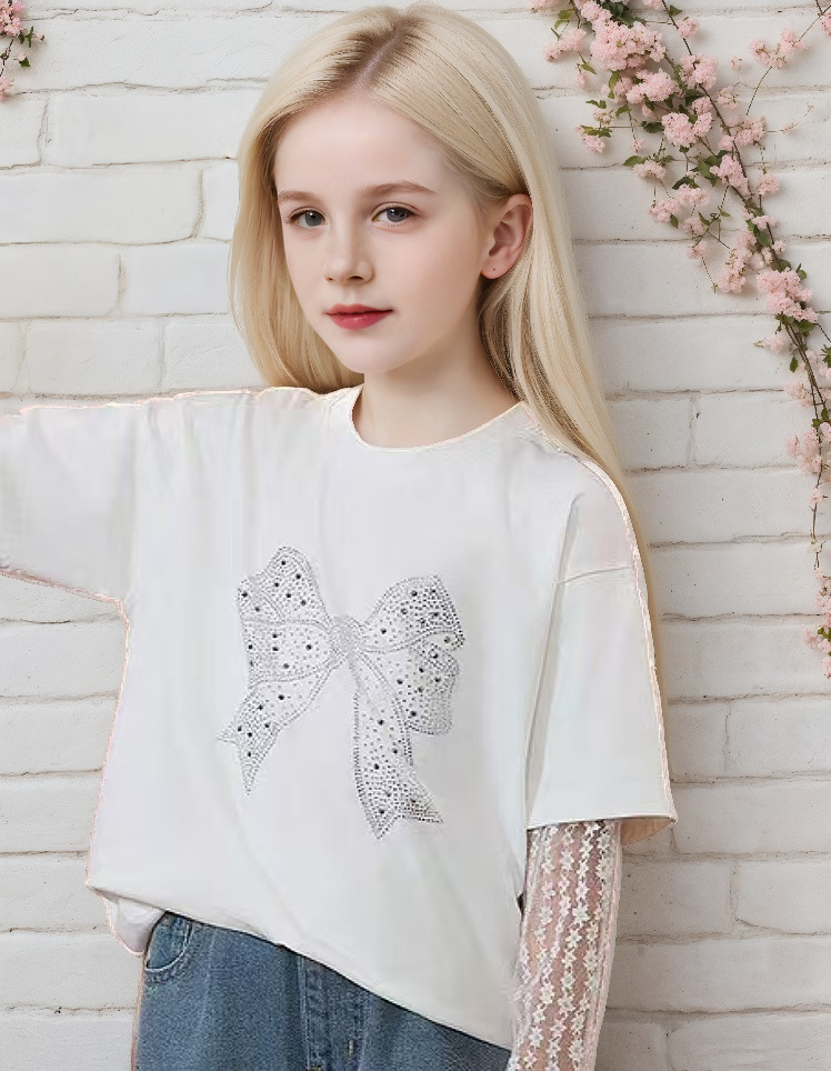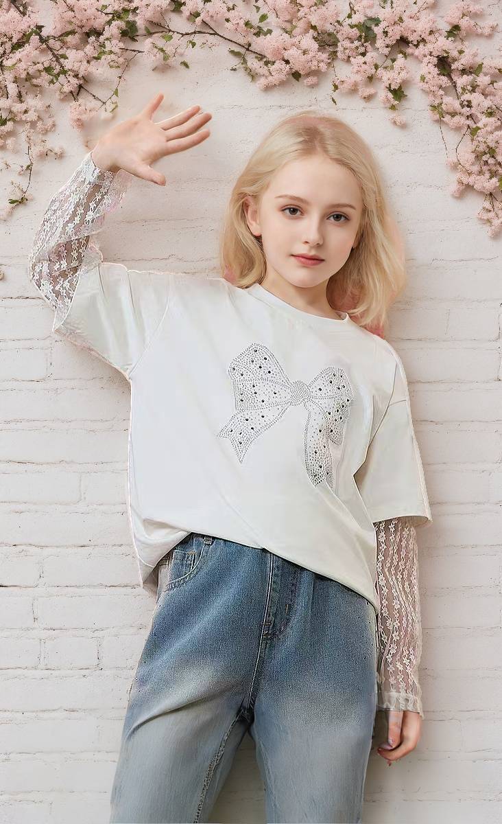 봄 신작 아동용 긴팔 티셔츠, 리본, 핫 다이아몬드 아동복, 여아 티셔츠, 레이스 페이크 투피스 탑스토어 가기