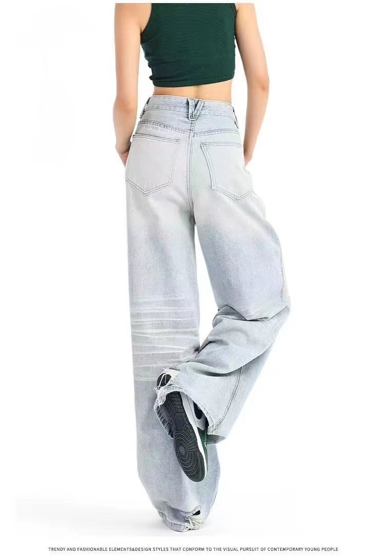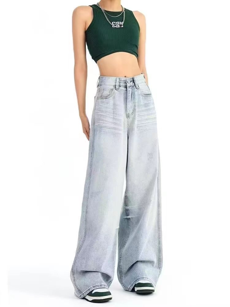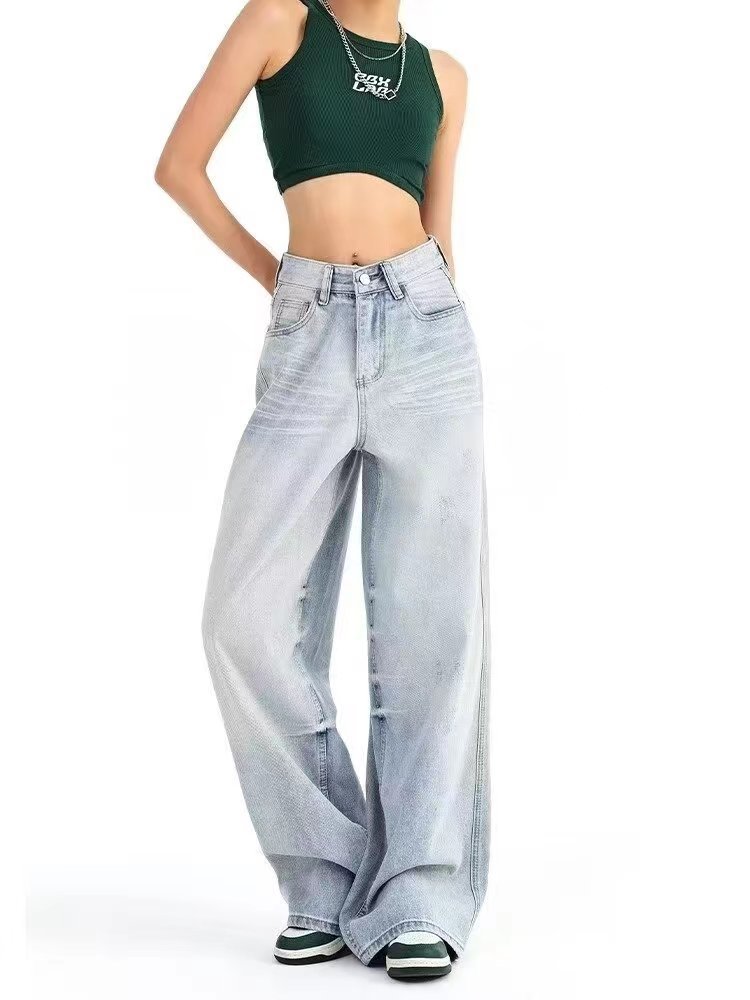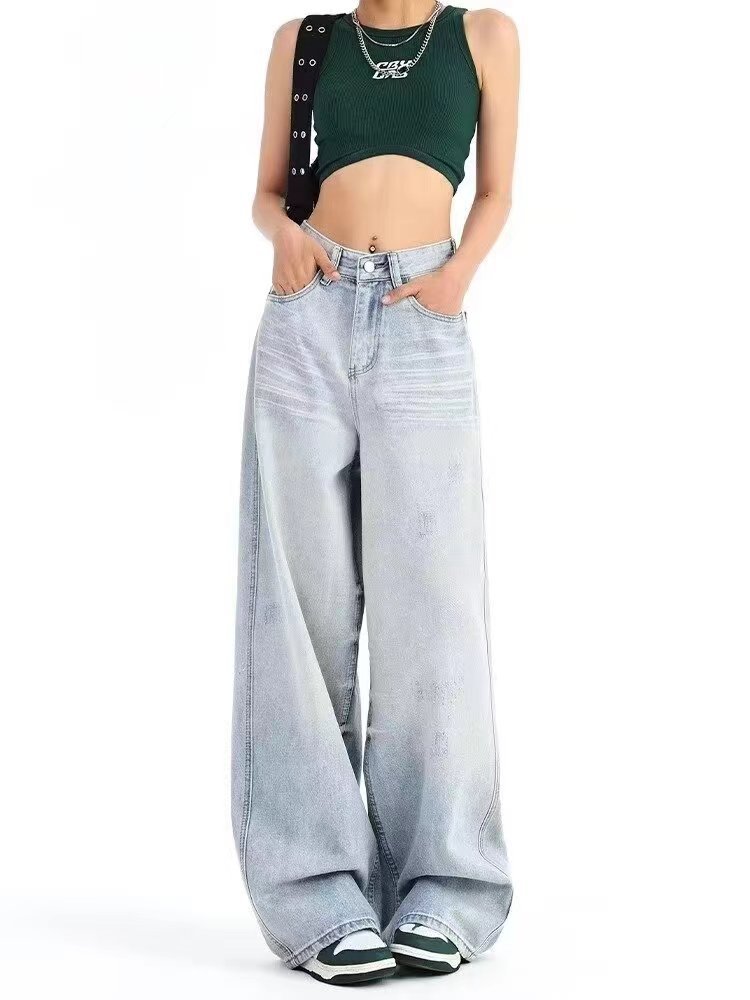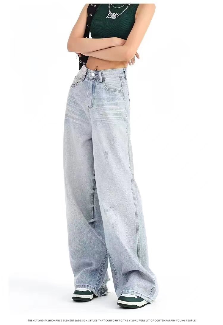 2024 새로운 도착 블루 아메리칸 스타일 와이드 레그 팬츠 청바지 여성용 루즈 하이 웨이스트 뉴 도착 여름 덤핑 슬림 모양의 바지스토어 가기