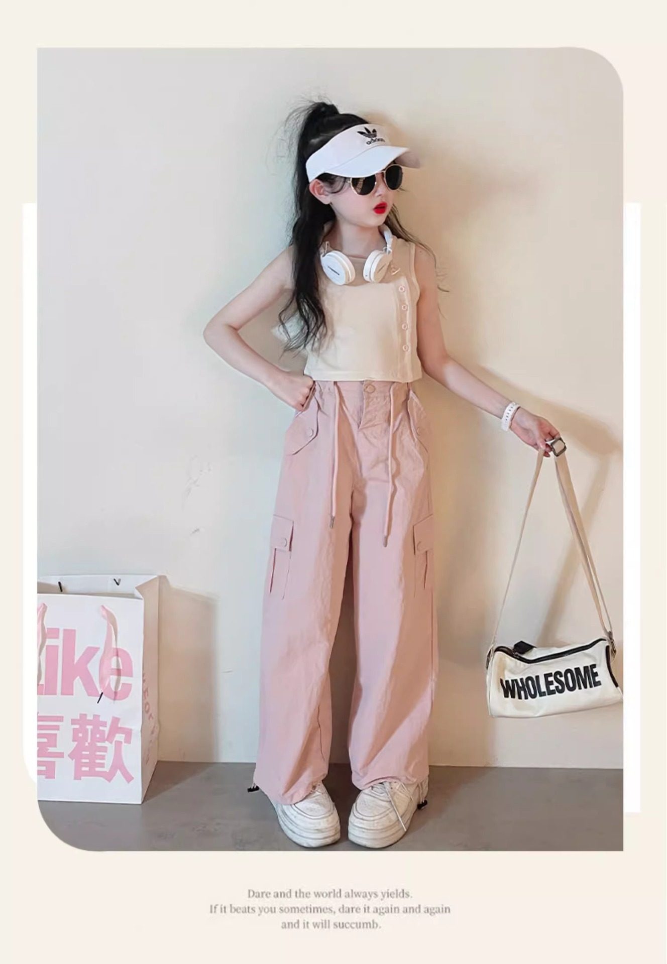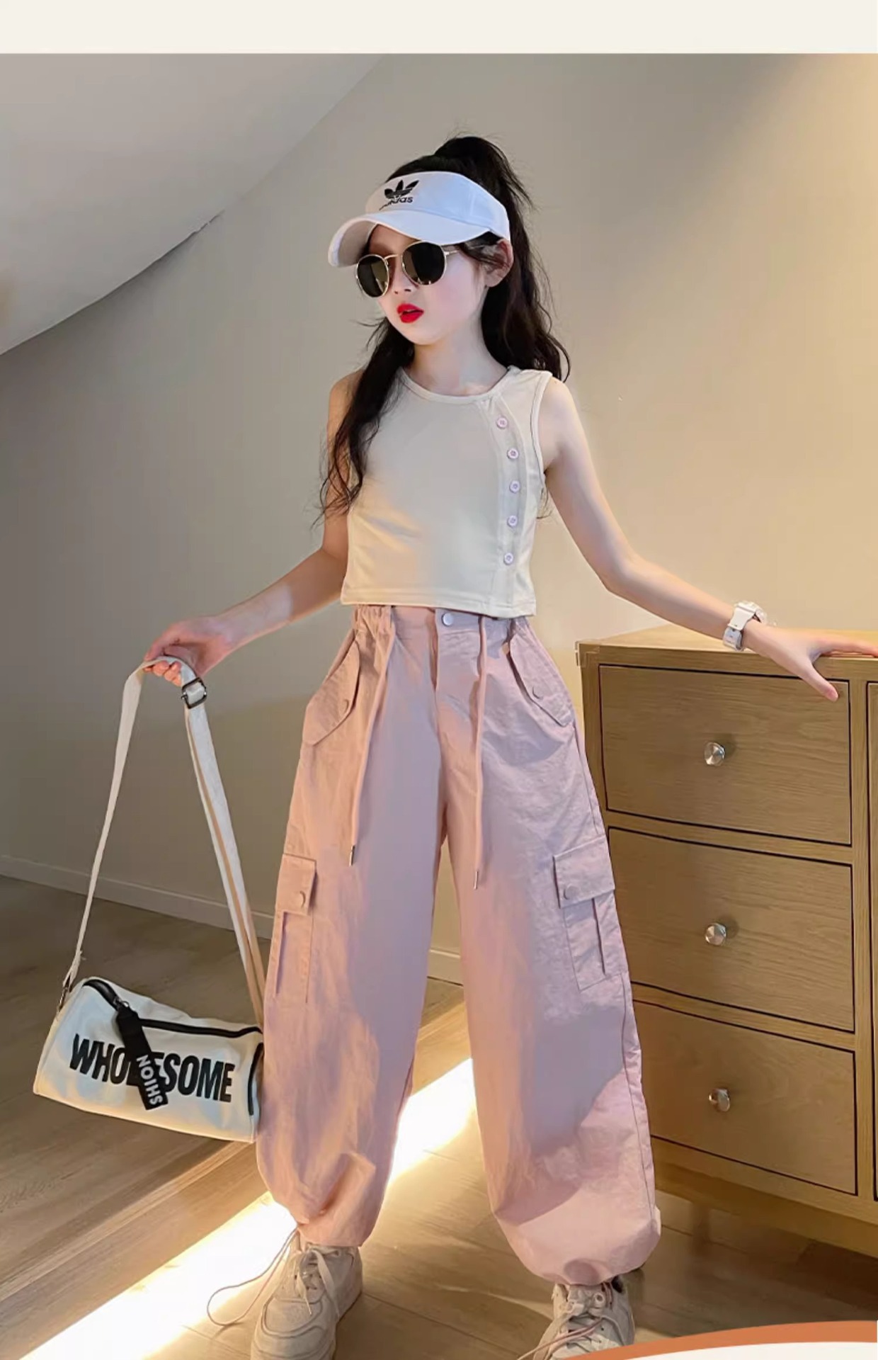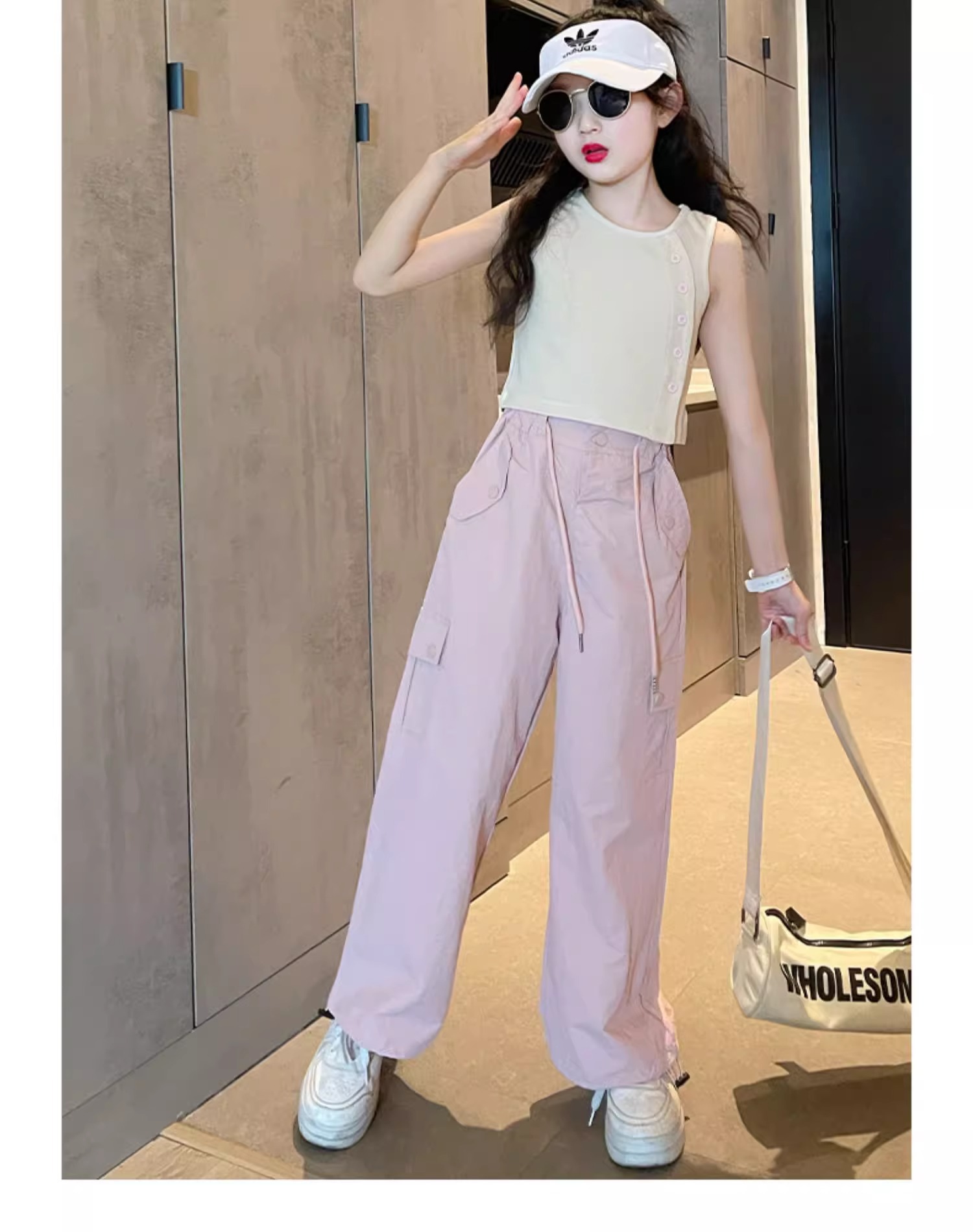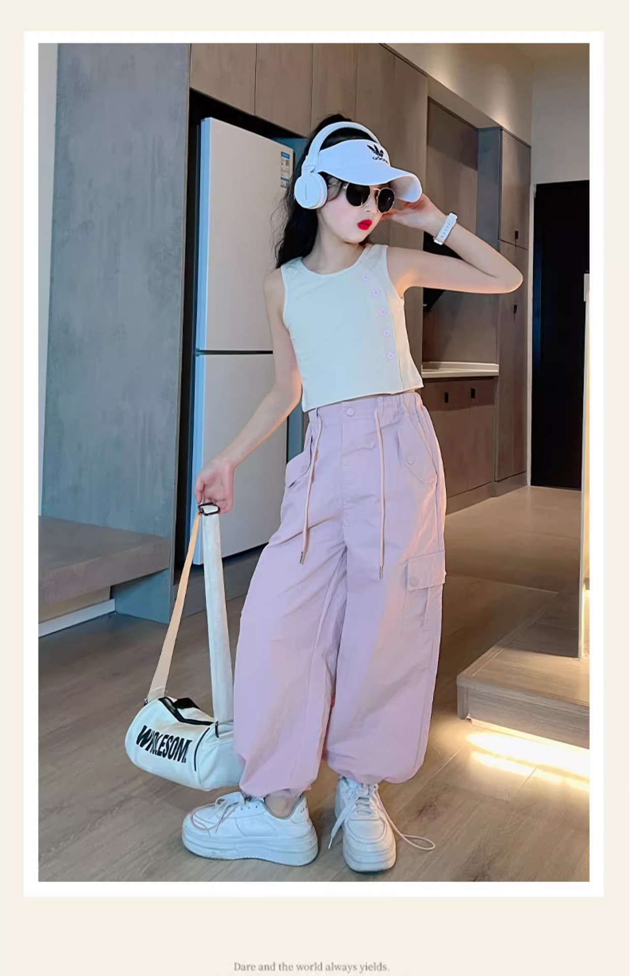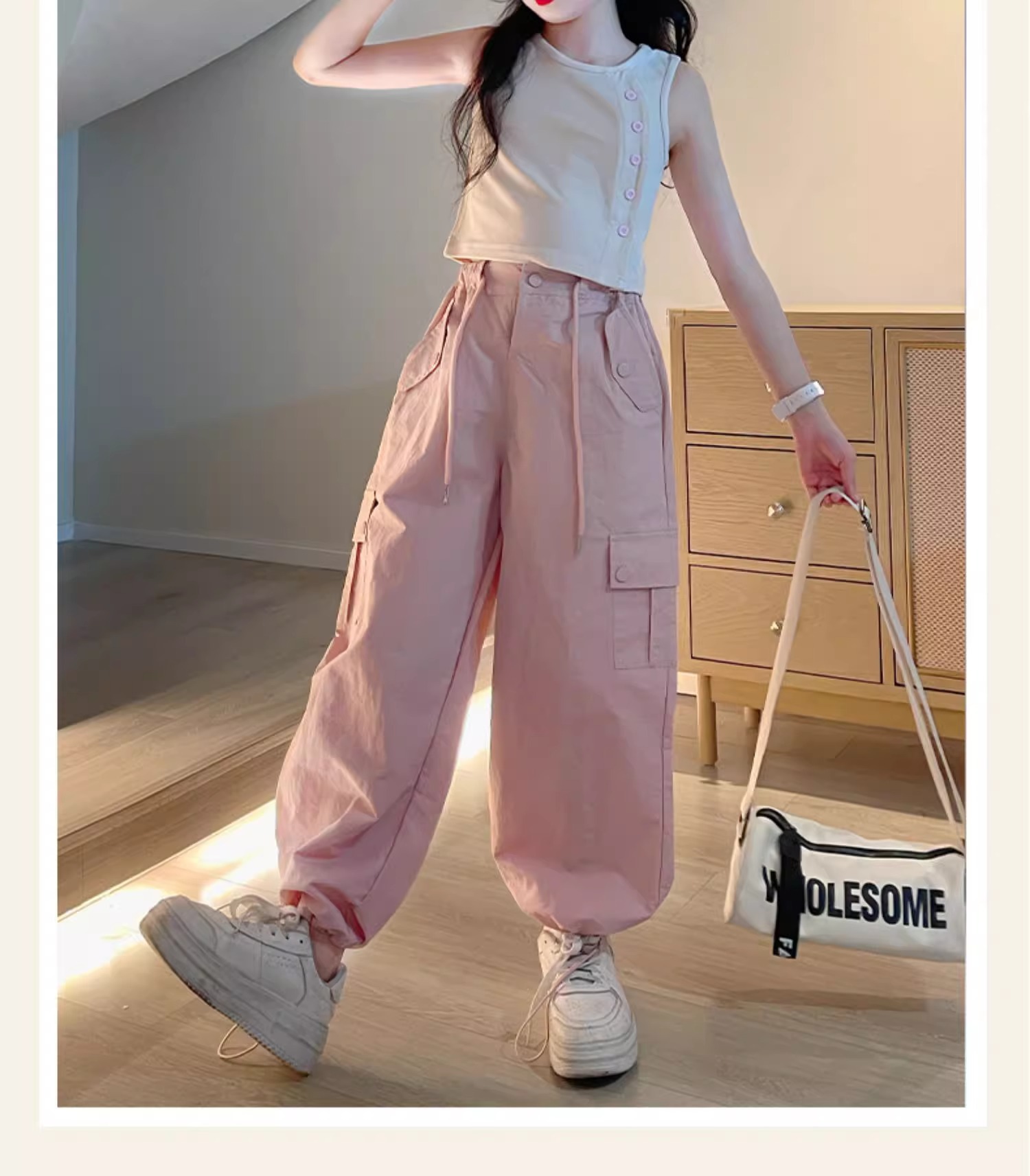 소녀 툴링 2024 새로운 어린이 핑크 높은 허리 캐주얼 바지 소녀 빅 어린이 올매치 루즈 스트레이트 퀵 핏 툴링 바지