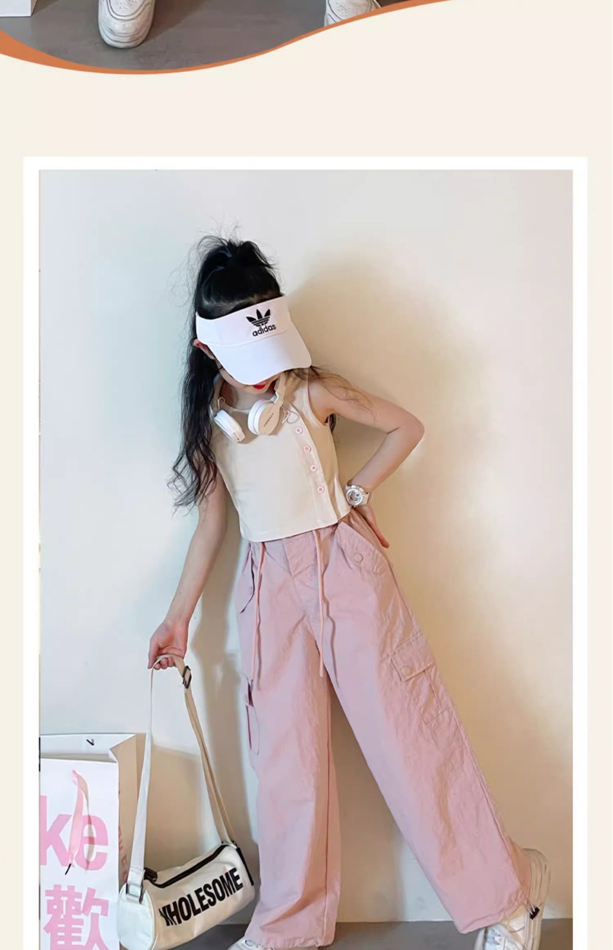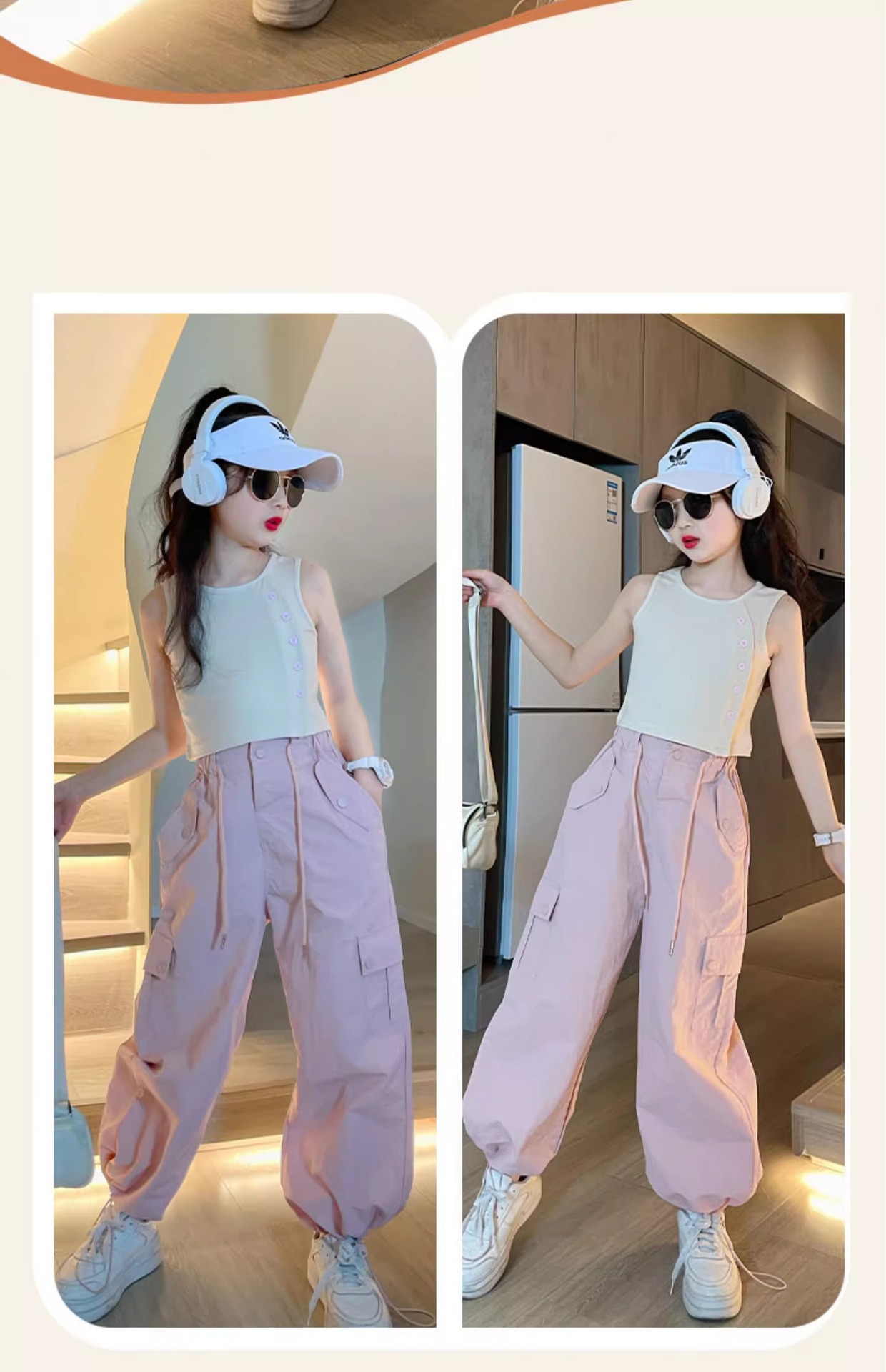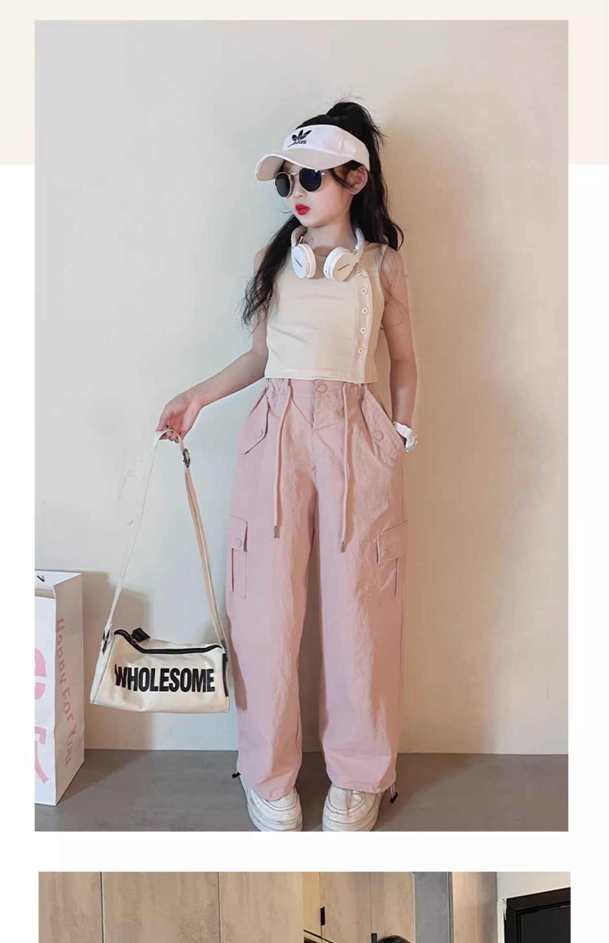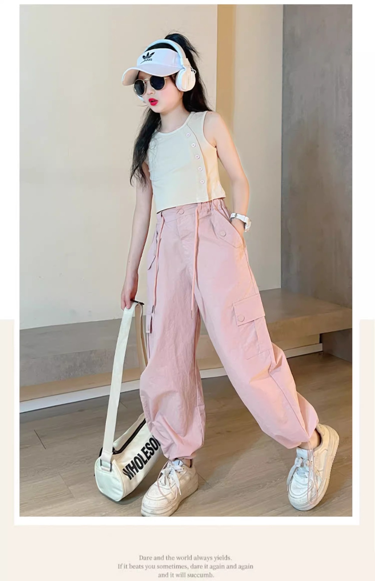 소녀 툴링 2024 새로운 어린이 핑크 높은 허리 캐주얼 바지 소녀 빅 어린이 올매치 루즈 스트레이트 퀵 핏 툴링 바지스토어 가기