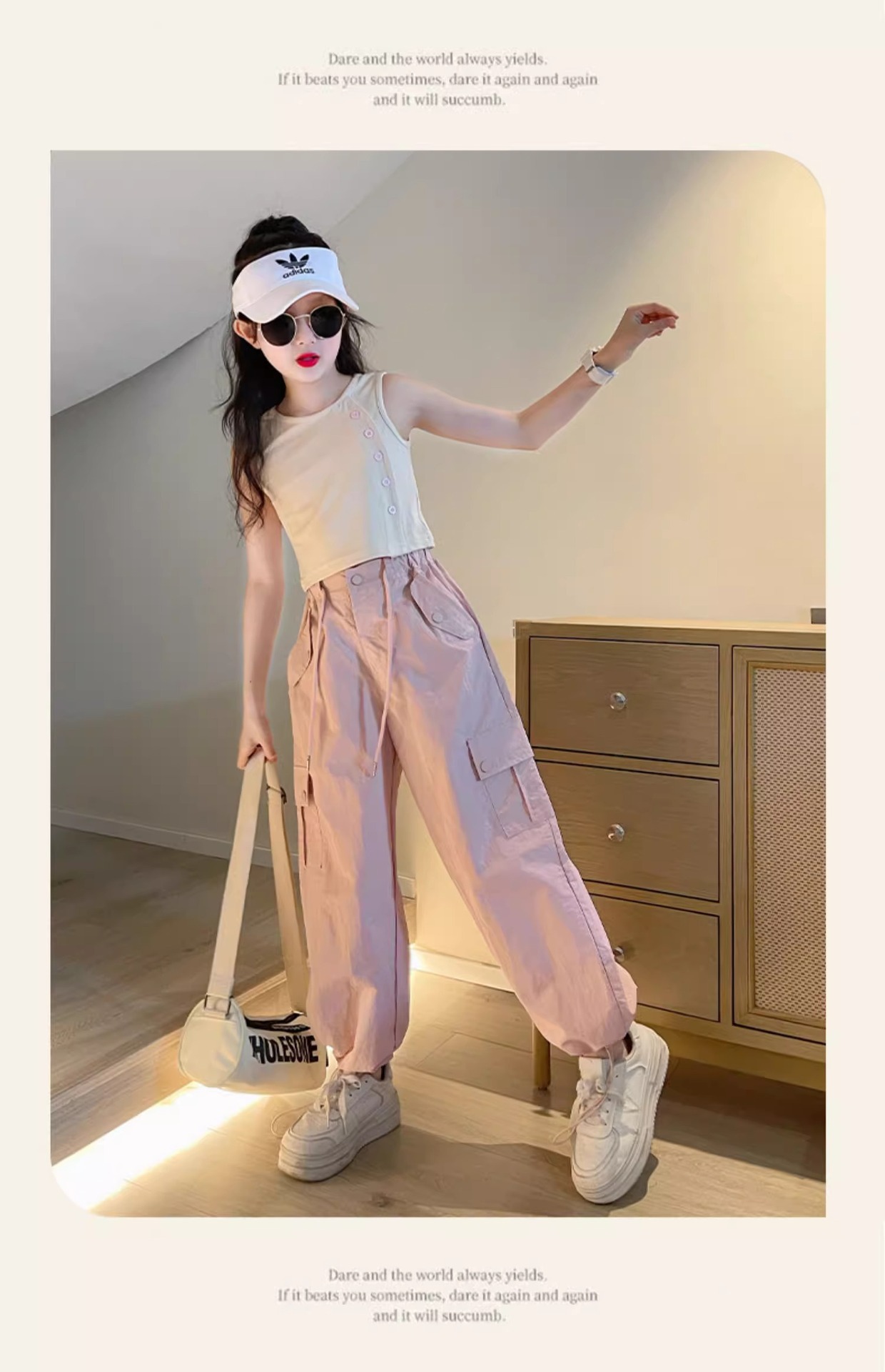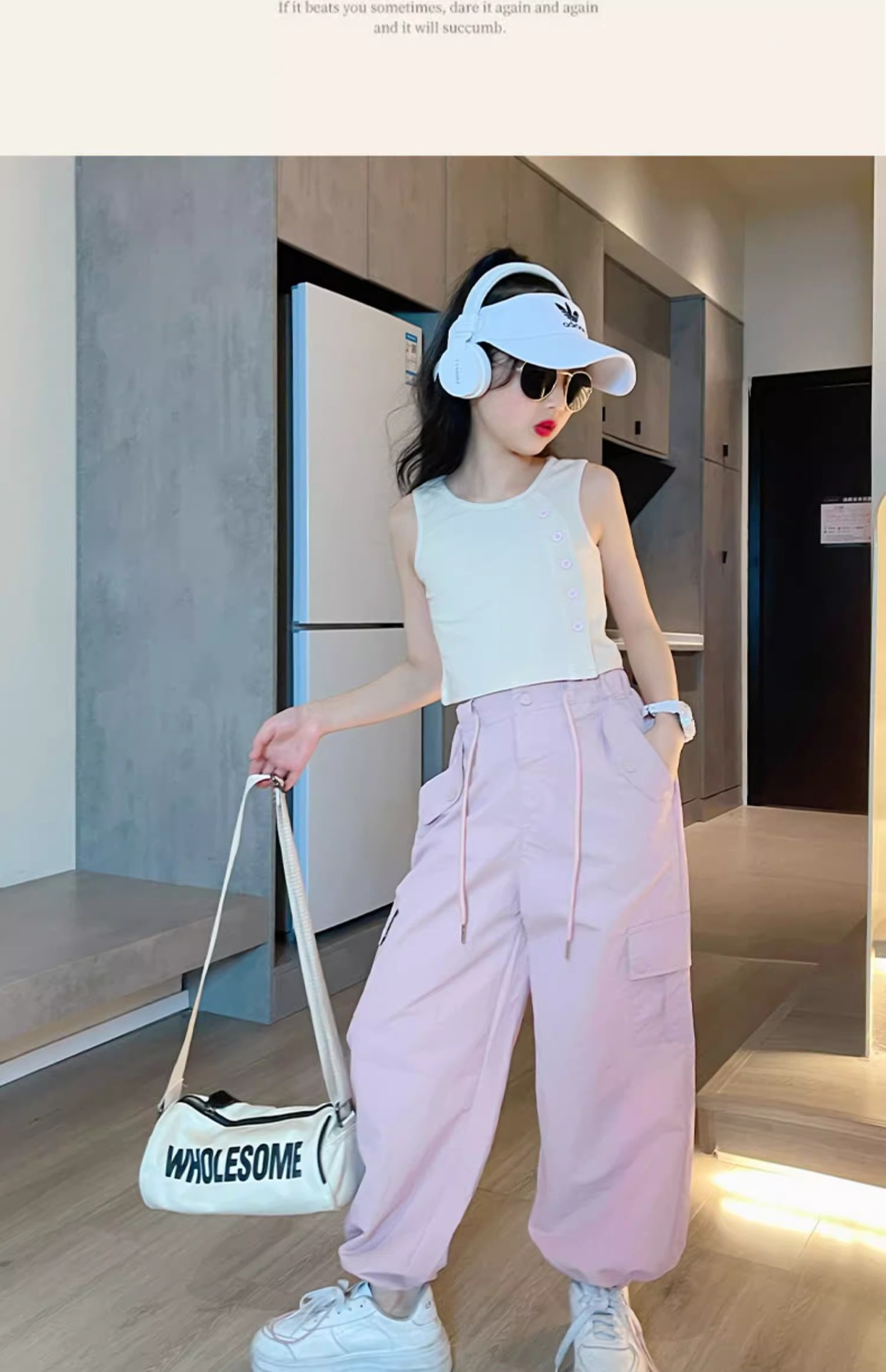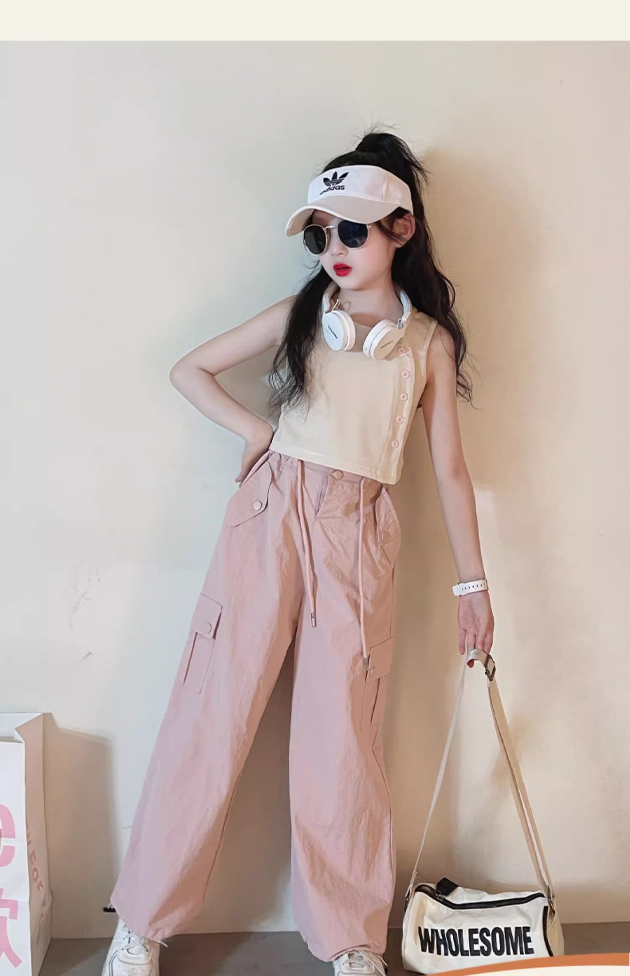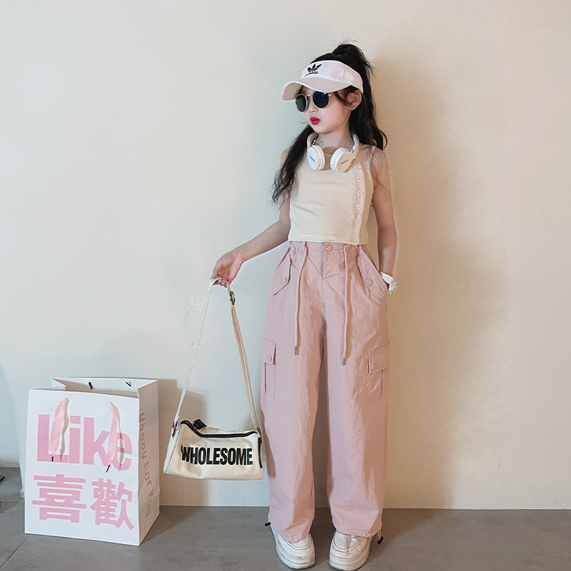 소녀 툴링 2024 새로운 어린이 핑크 높은 허리 캐주얼 바지 소녀 빅 어린이 올매치 루즈 스트레이트 퀵 핏 툴링 바지스토어 가기