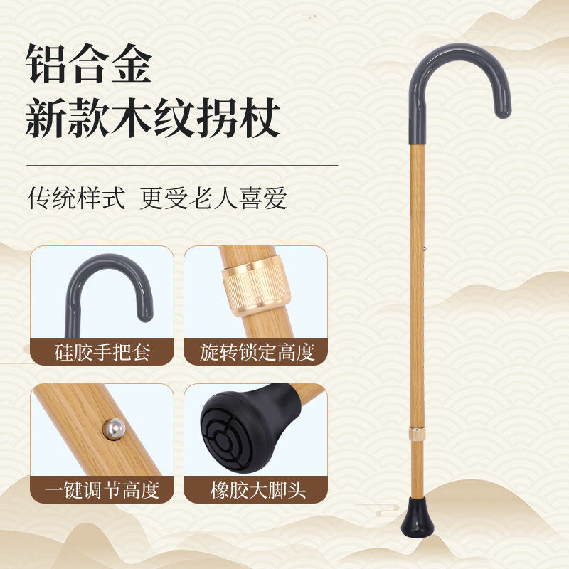 노인용 알루미늄 합금 나무무늬 곡선형 손잡이 미끄럼 방지 지팡이, 경량 접이식 지팡이, 대행 배송 가능