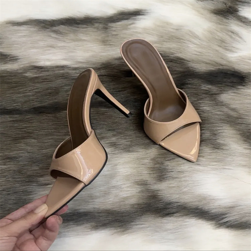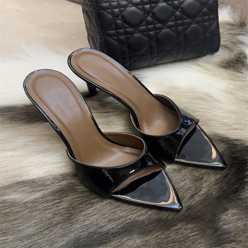 여성을위한 새로운 오픈 발가락 뾰족한 페이턴트 가죽 스틸레토 힐 여름 섹시한 검은색 휴가 착용 샌들 및 슬리퍼 여성용 하이힐스토어 가기