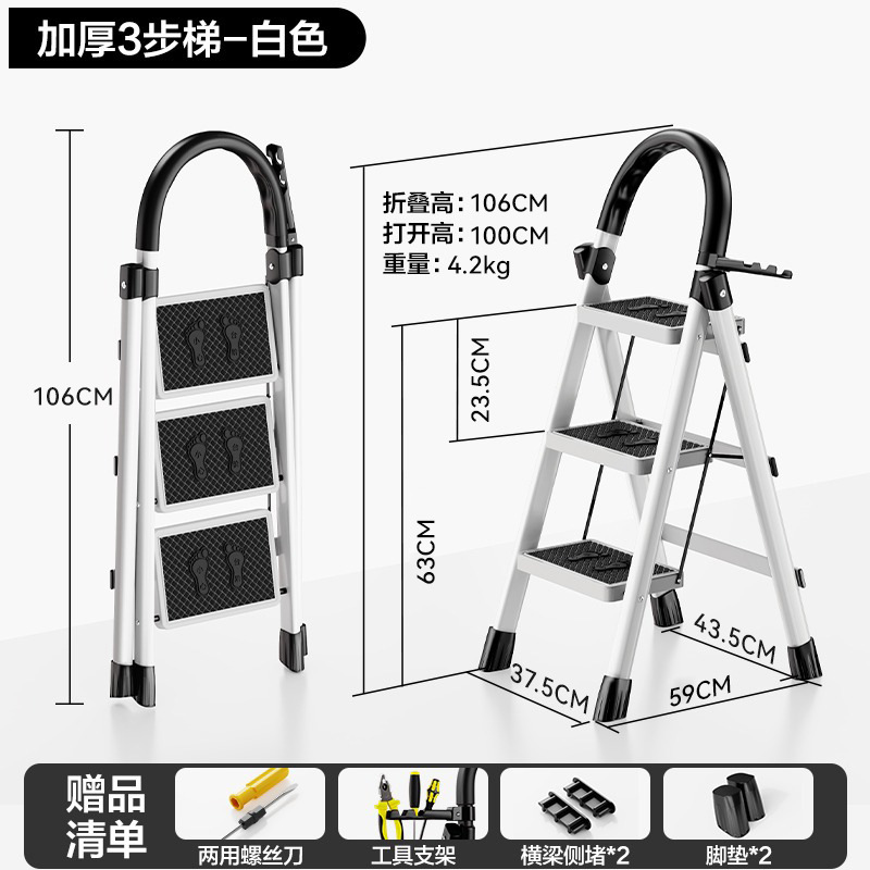 • [아이보리 화이트] 두꺼운 탄소강 [3단 사다리] (안전 버클 포함) 플랫 헤드