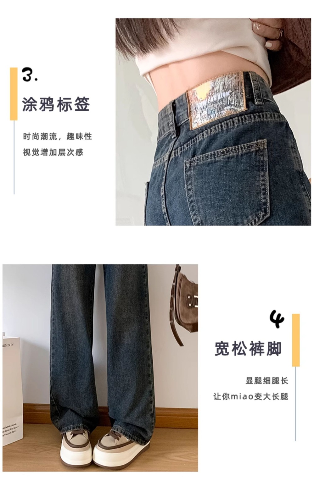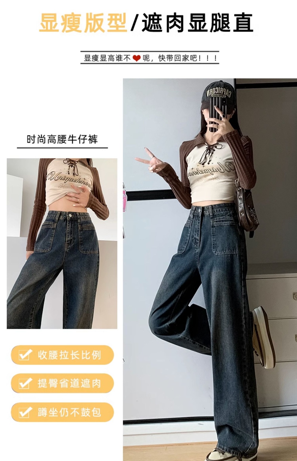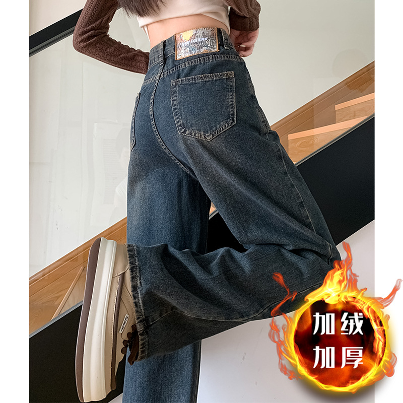 플러스 사이즈 스트레이트 기모 청바지 여성의 2024 년 새로운 가을 및 겨울 폭발, 느슨한 높은 허리 넓은 다리 바지 통통녀 슬리밍스토어 가기